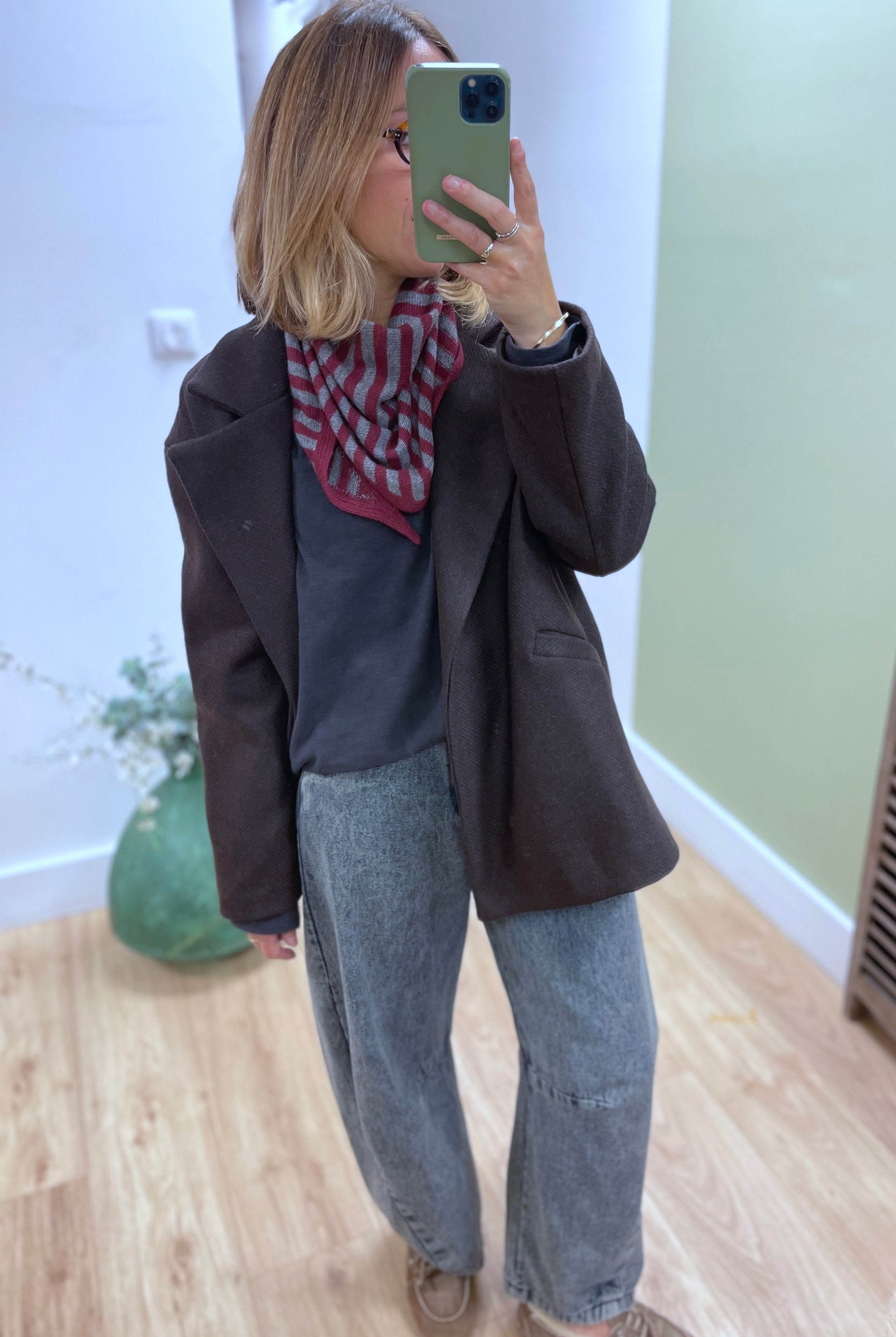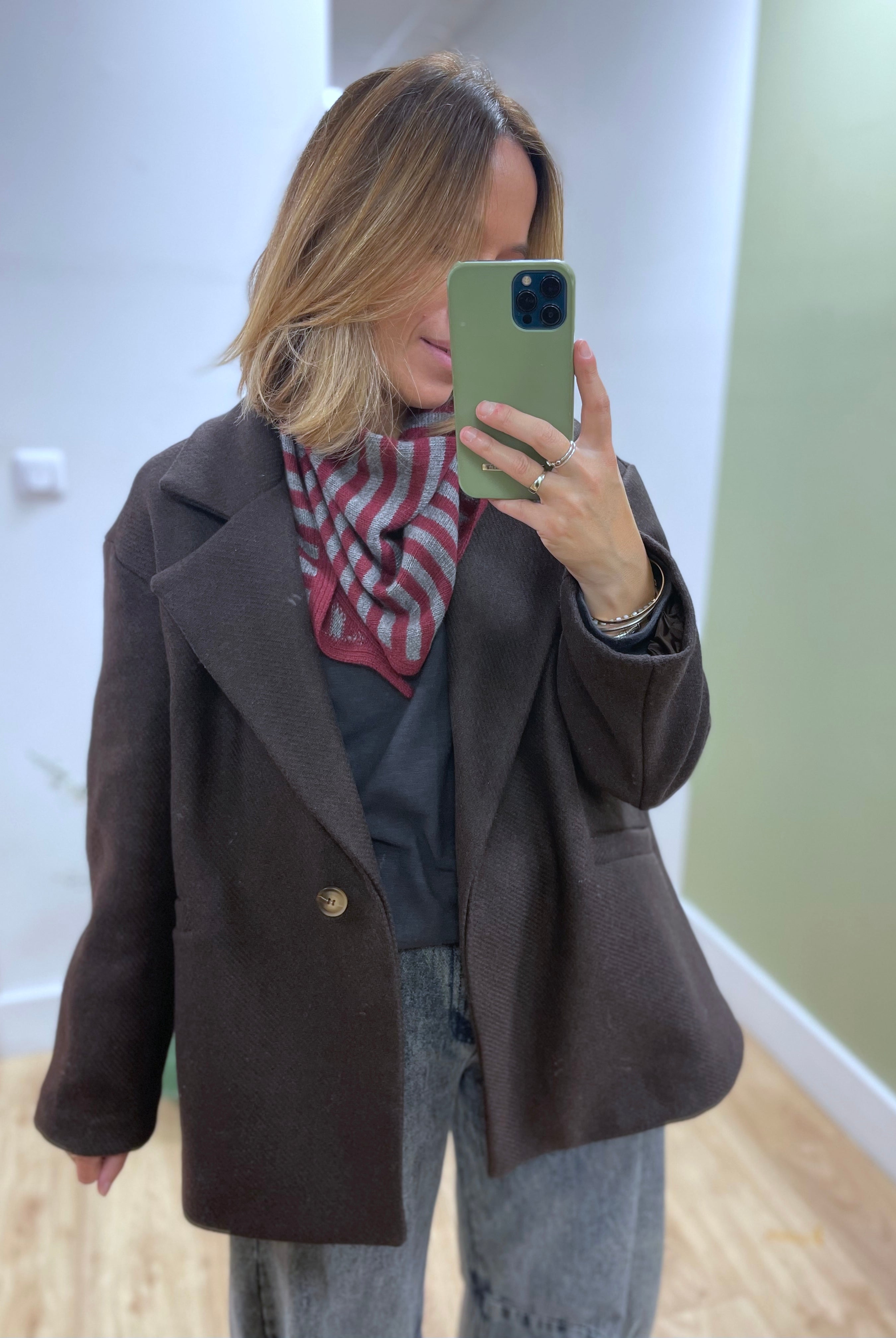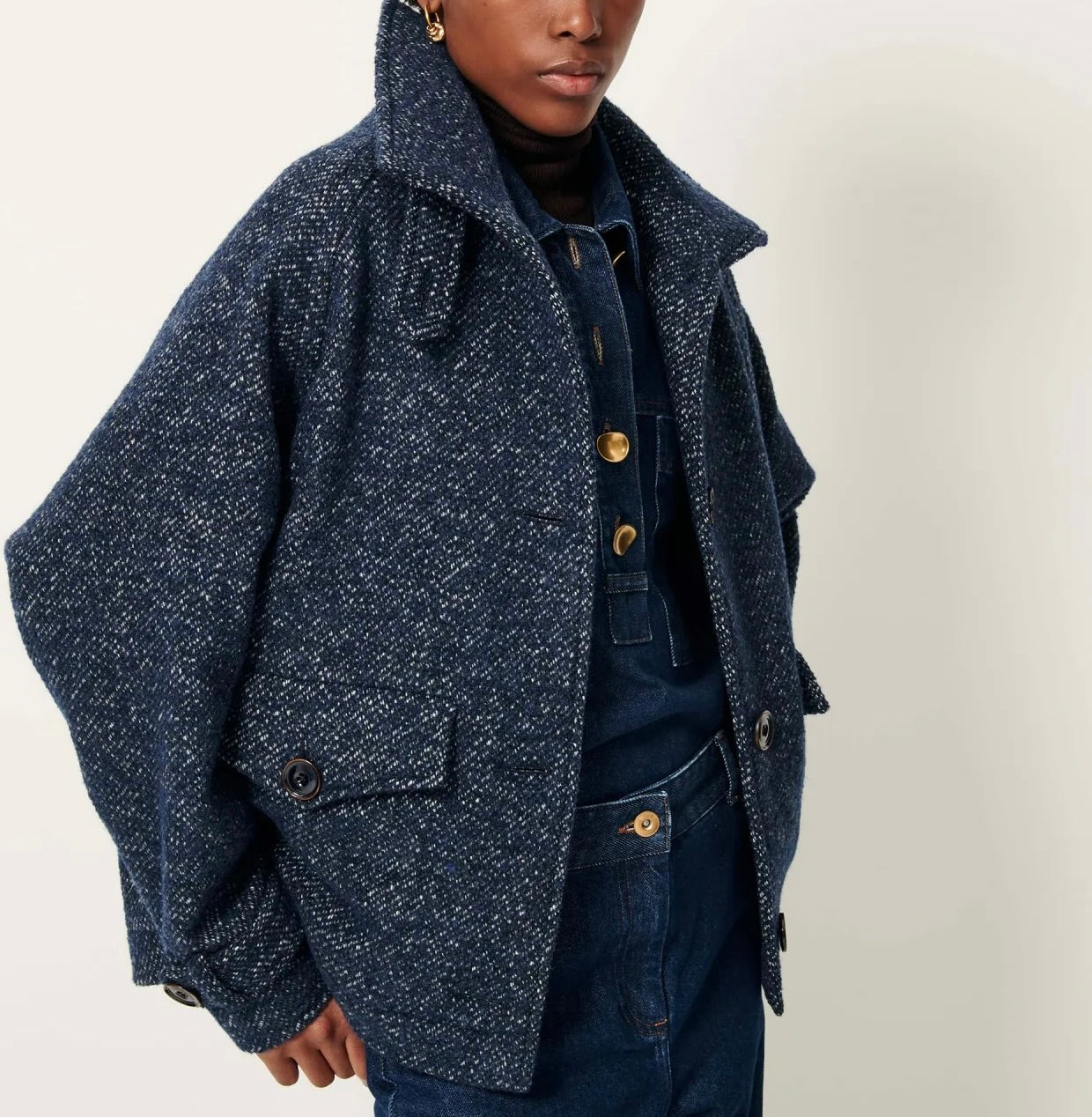 Manteau esprit blouson à emmanchures raglan et col haut en lainage natté souple de fils torsadés tricolores effet chiné, tissé en Italie