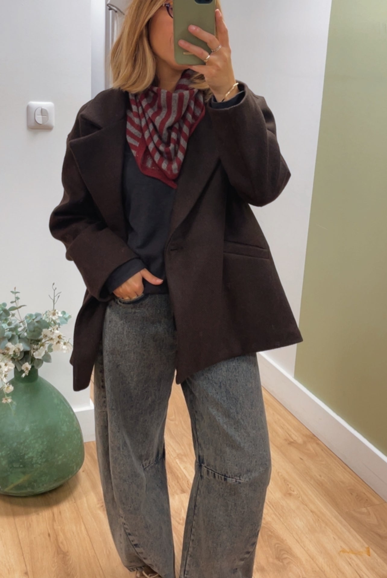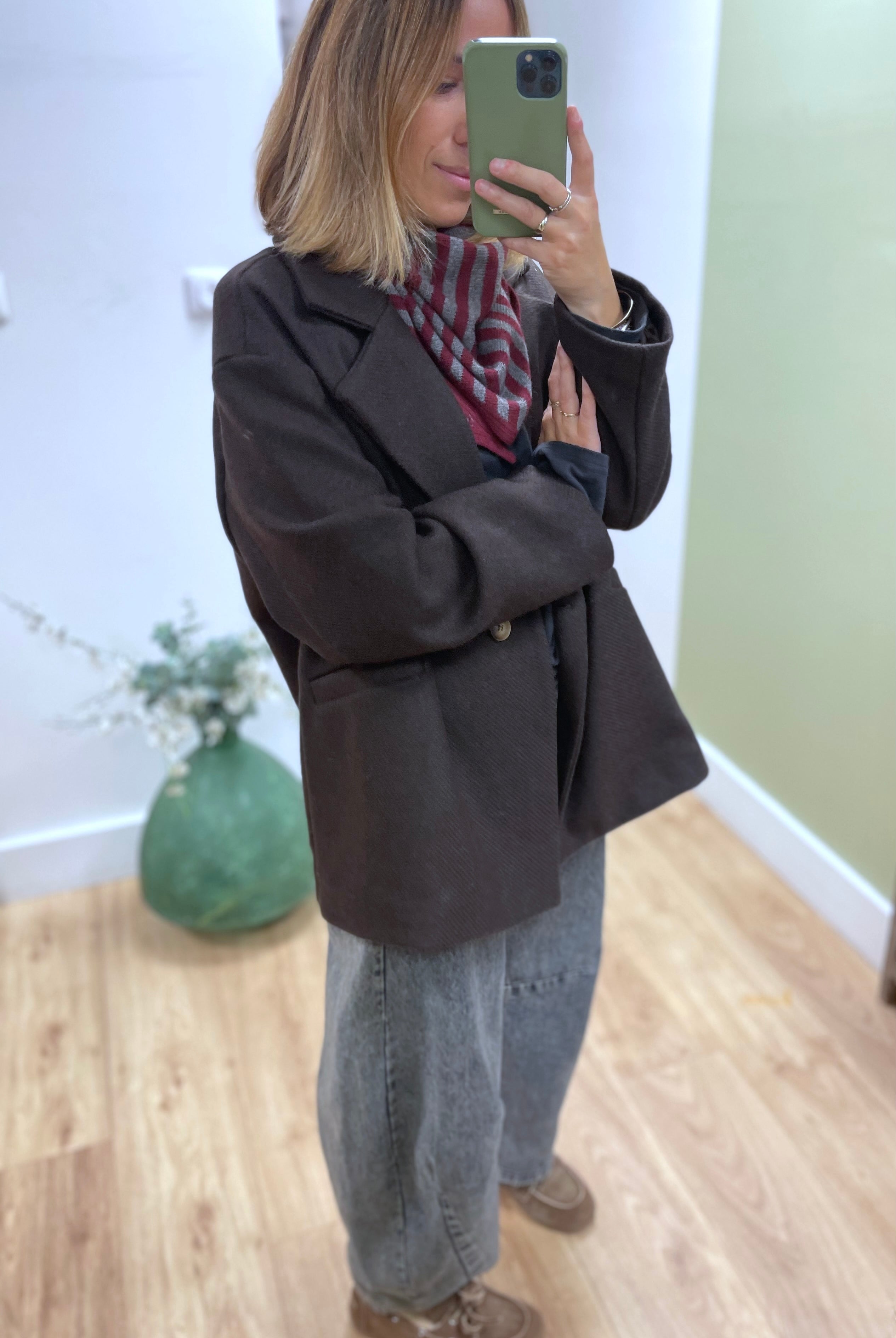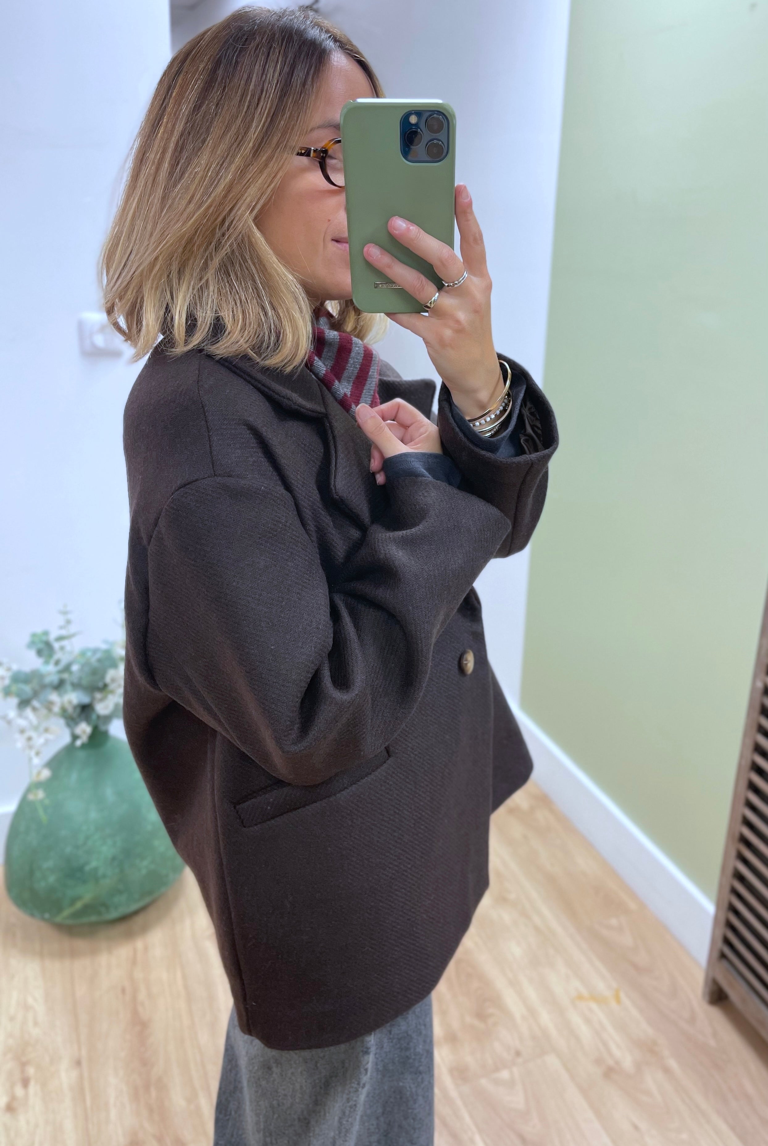 Manteau esprit blouson à emmanchures raglan et col haut en lainage natté souple de fils torsadés tricolores effet chiné, tissé en Italie