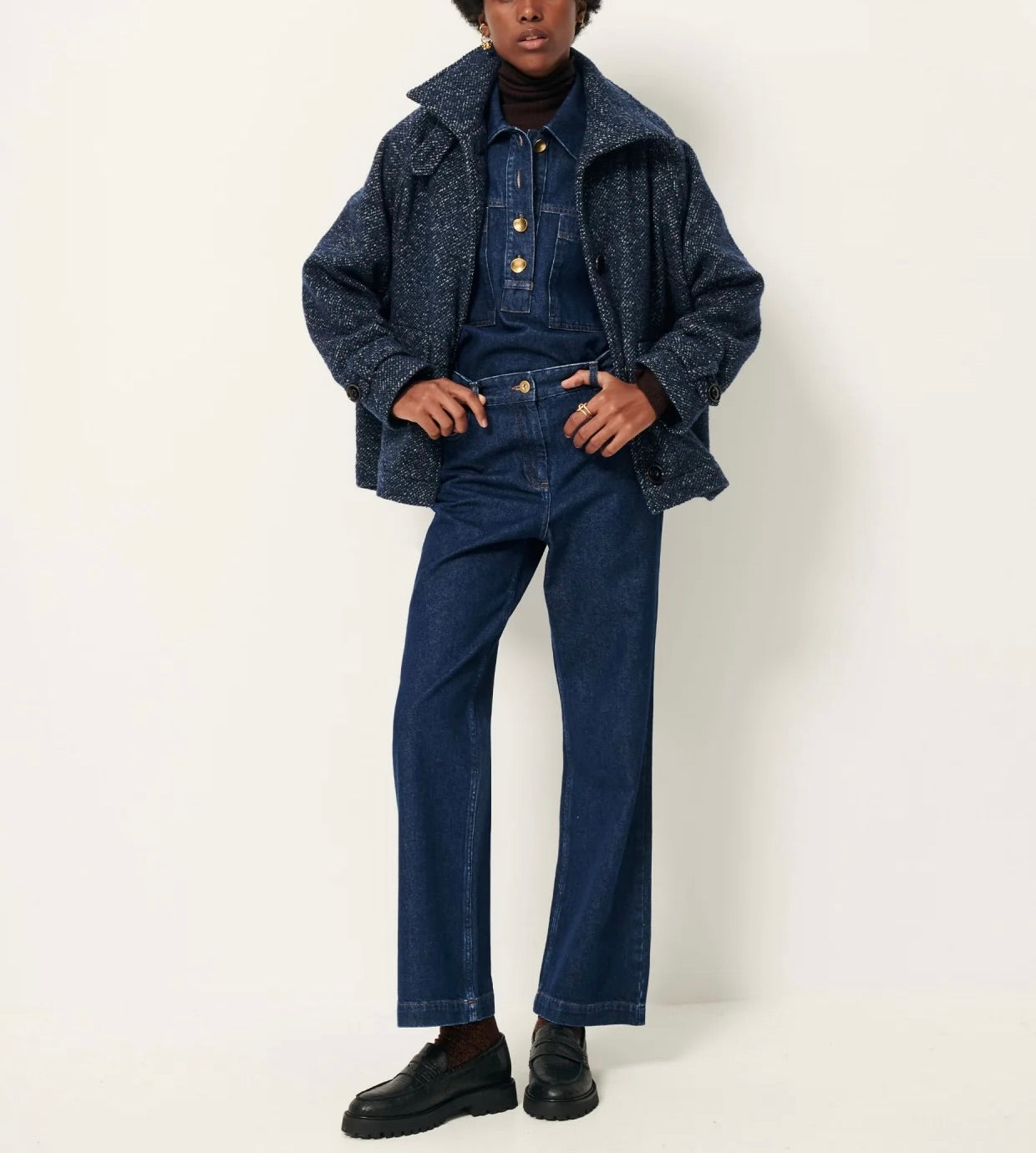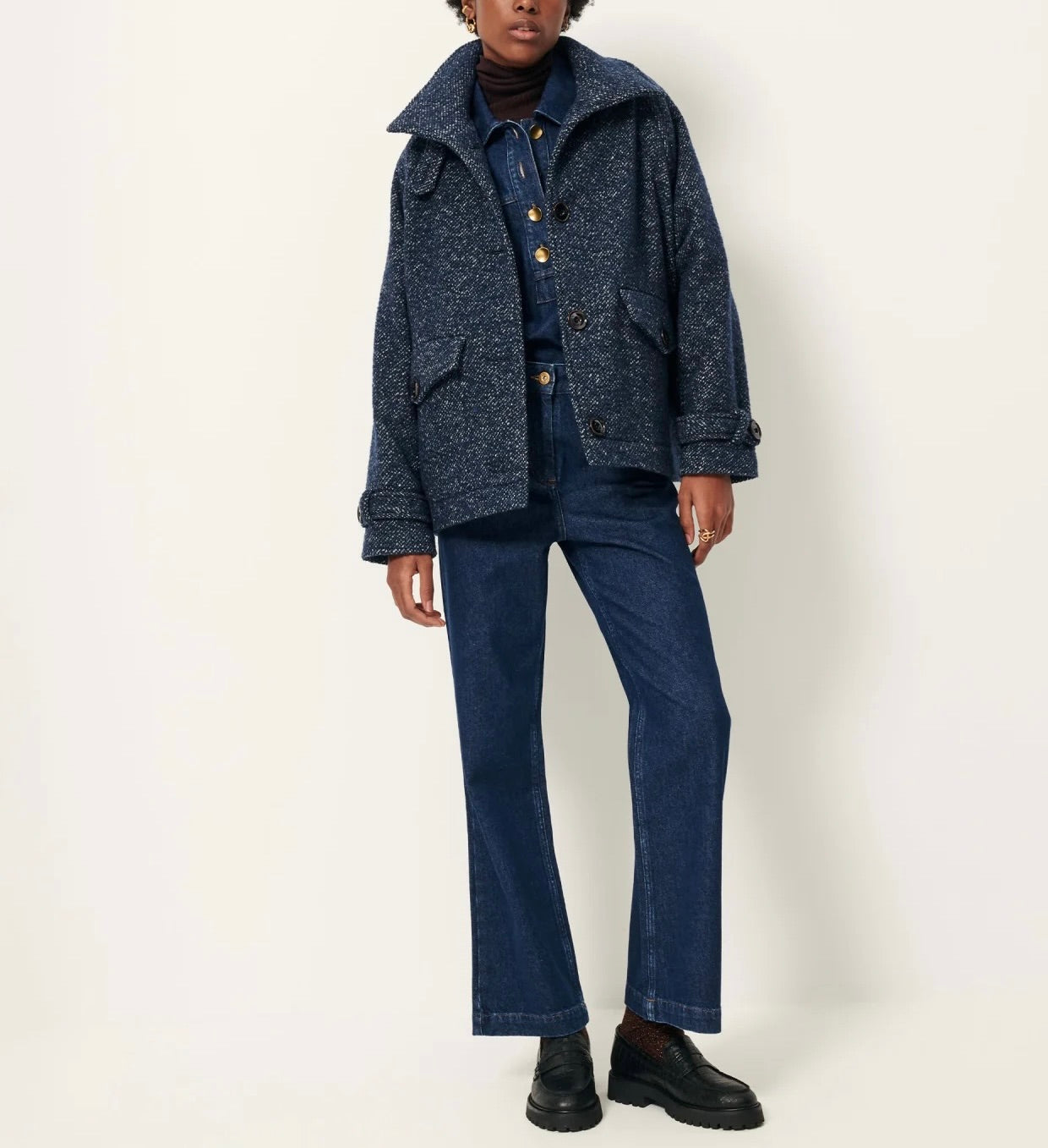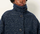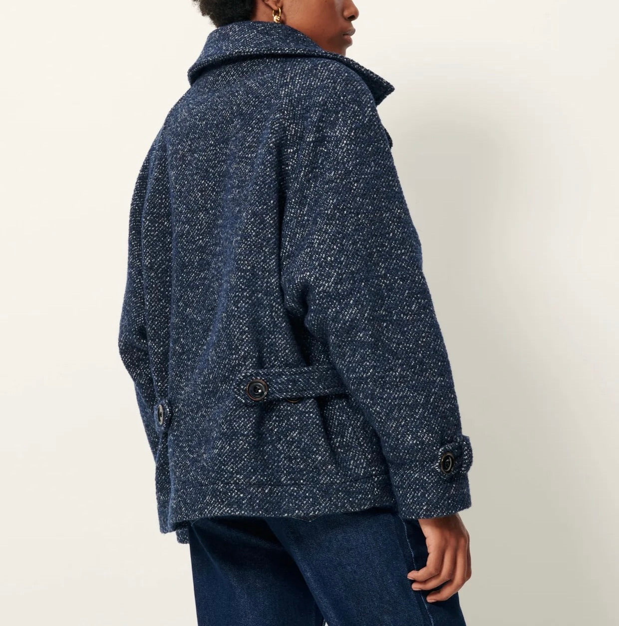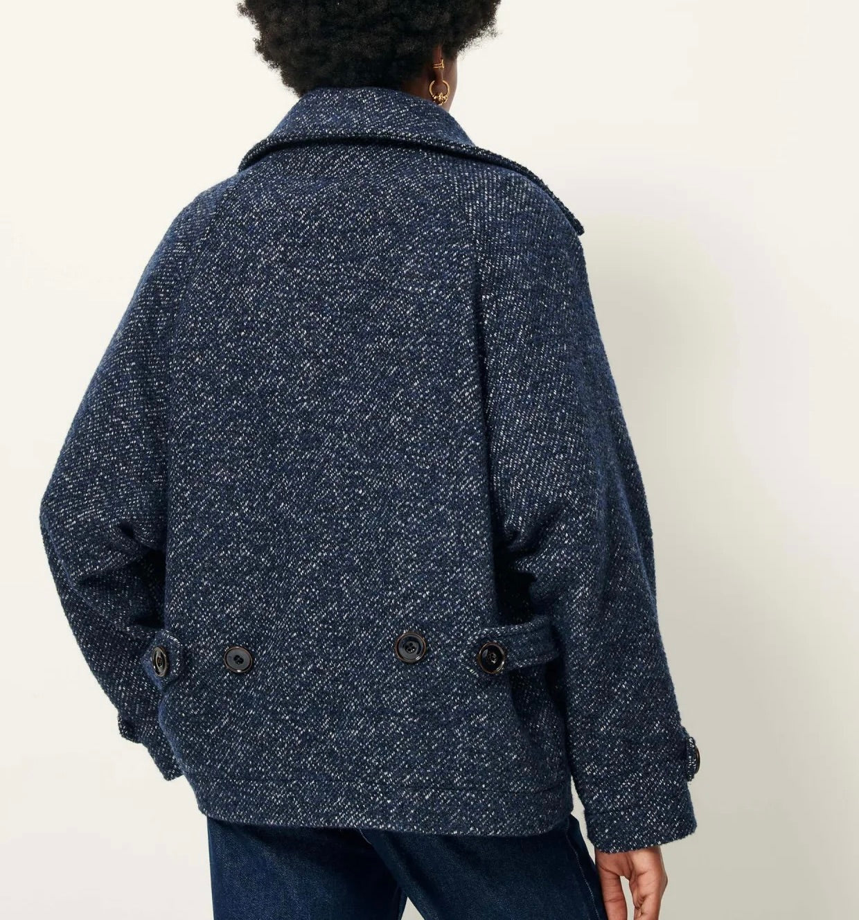 Manteau esprit blouson à emmanchures raglan et col haut en lainage natté souple de fils torsadés tricolores effet chiné, tissé en Italie