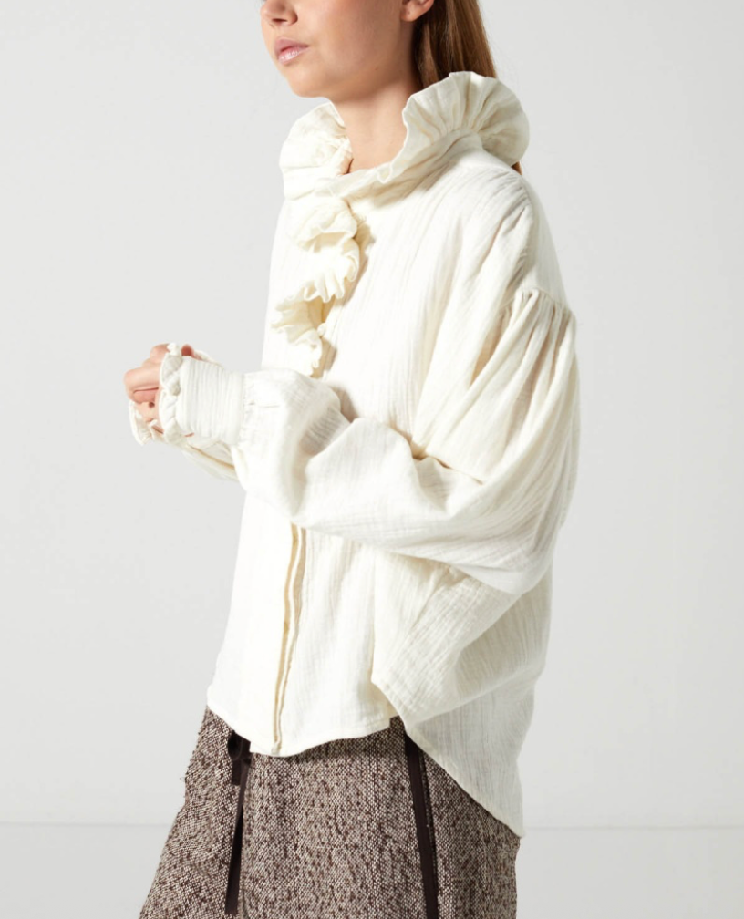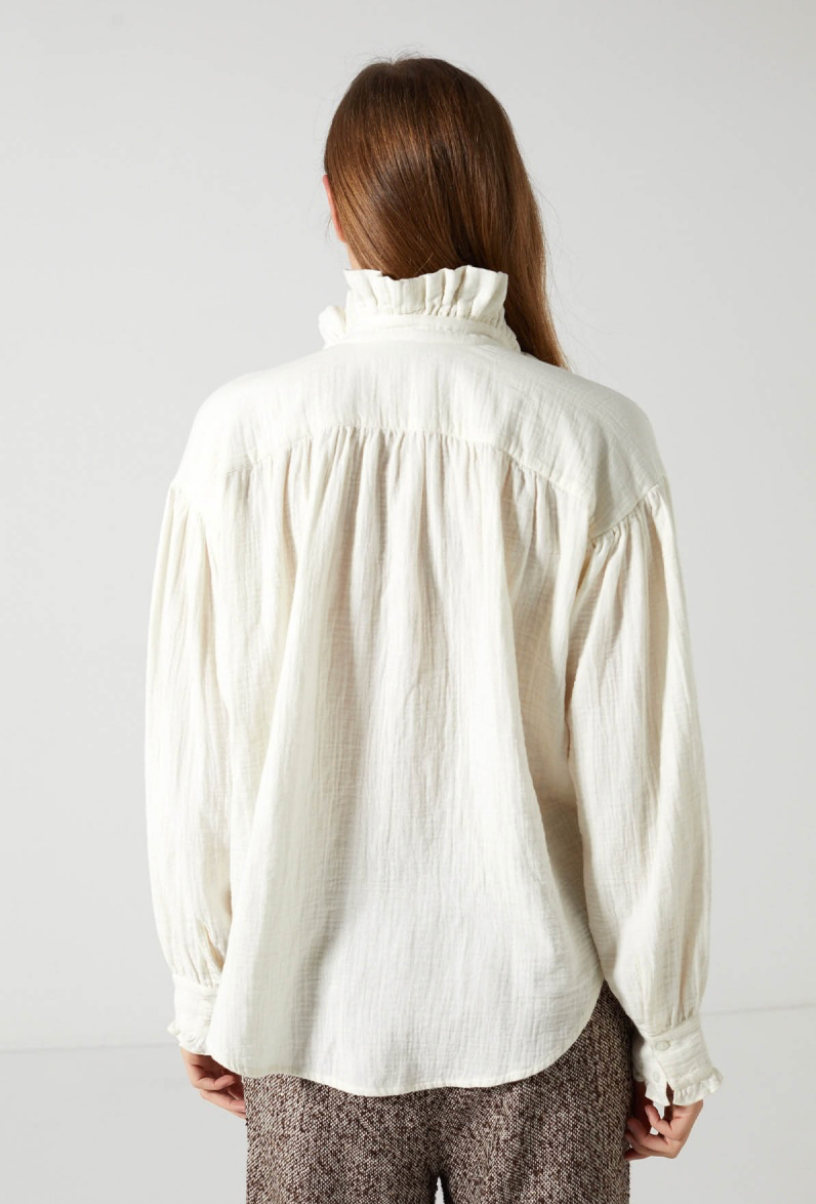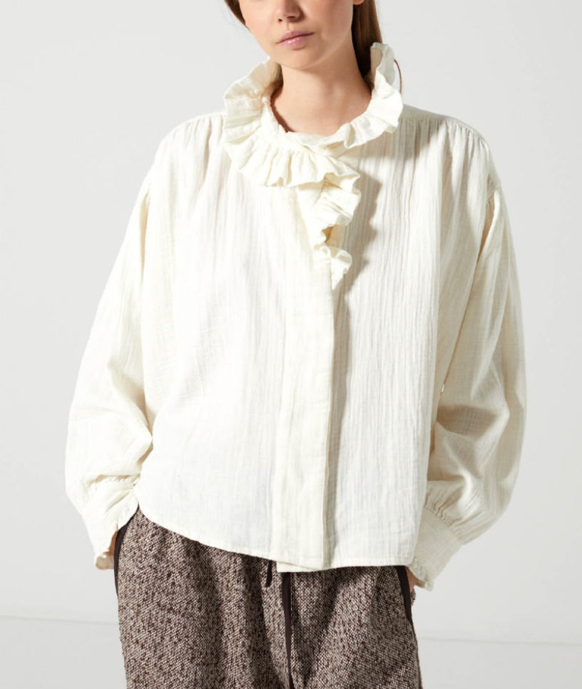 La chemise Indira offre un look romantique et moderne avec son col à volants, à porter ouvert ou fermé selon l’envie.