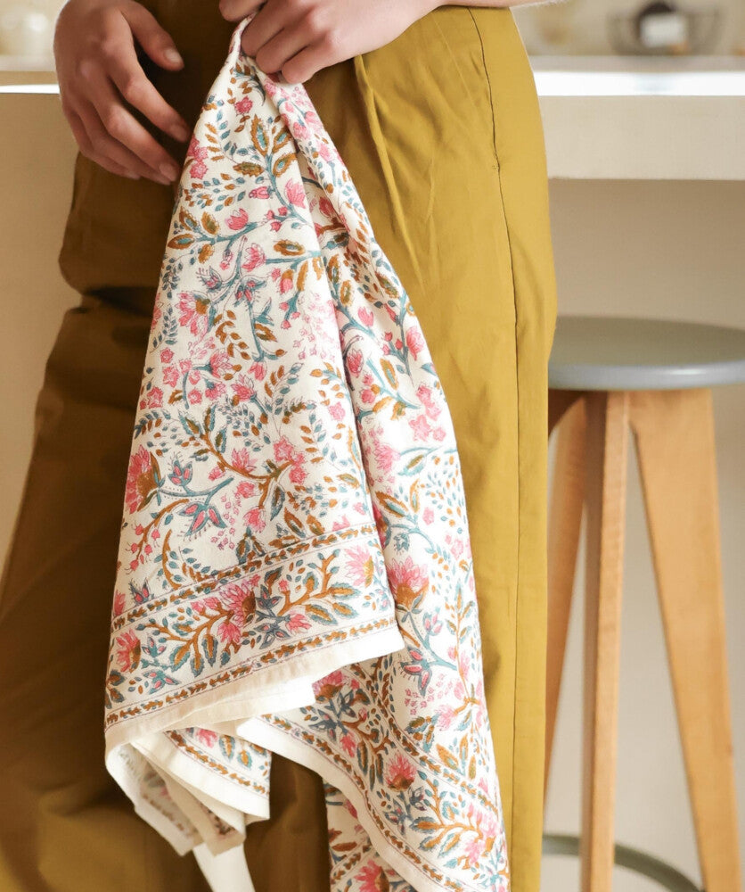 *L'impression au block-print est un procédé artisanal dans lequel chaque tampon destiné à imprimer le motif est gravé dans le bois puis imprégné de teinture pour être appliqué manuellement.