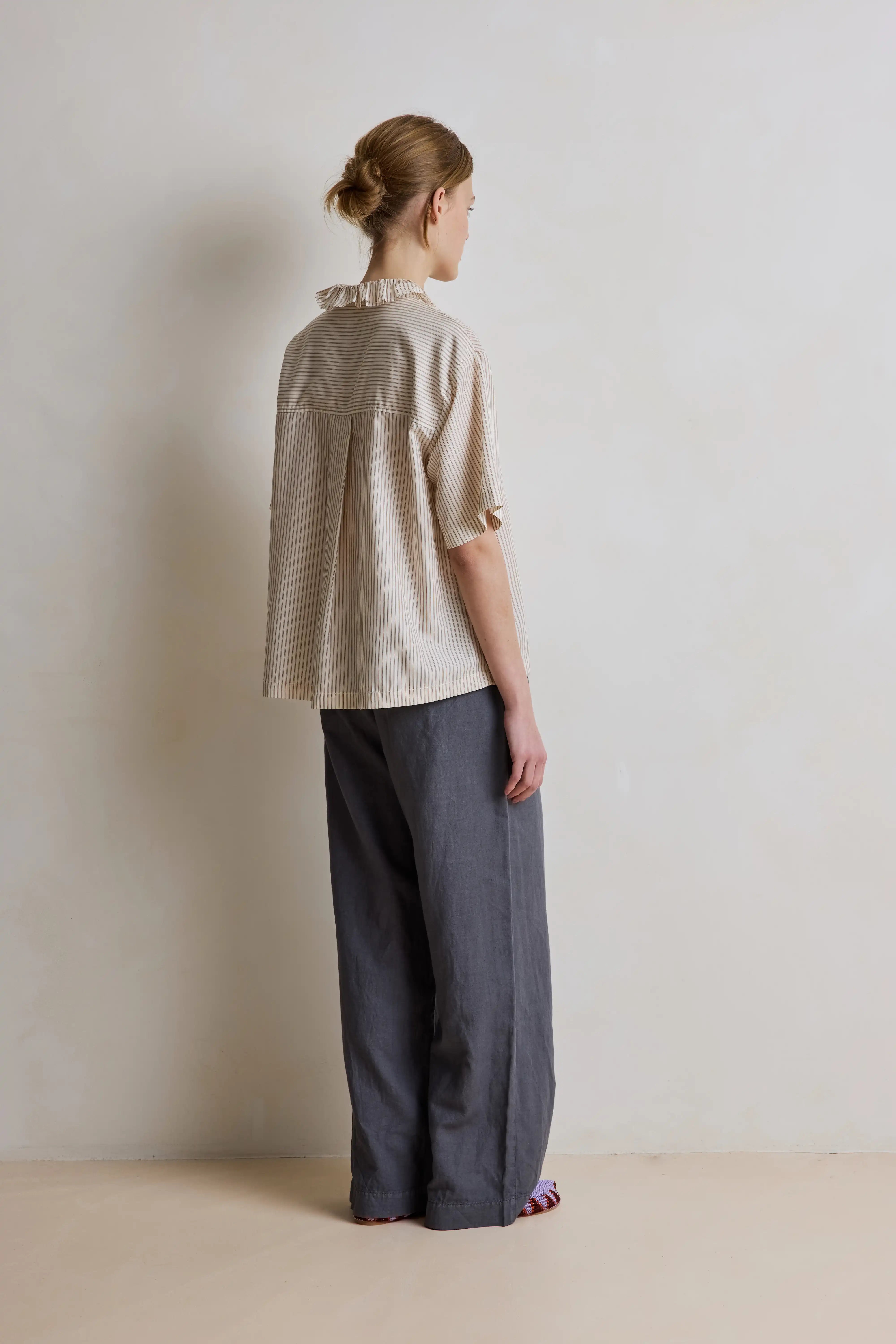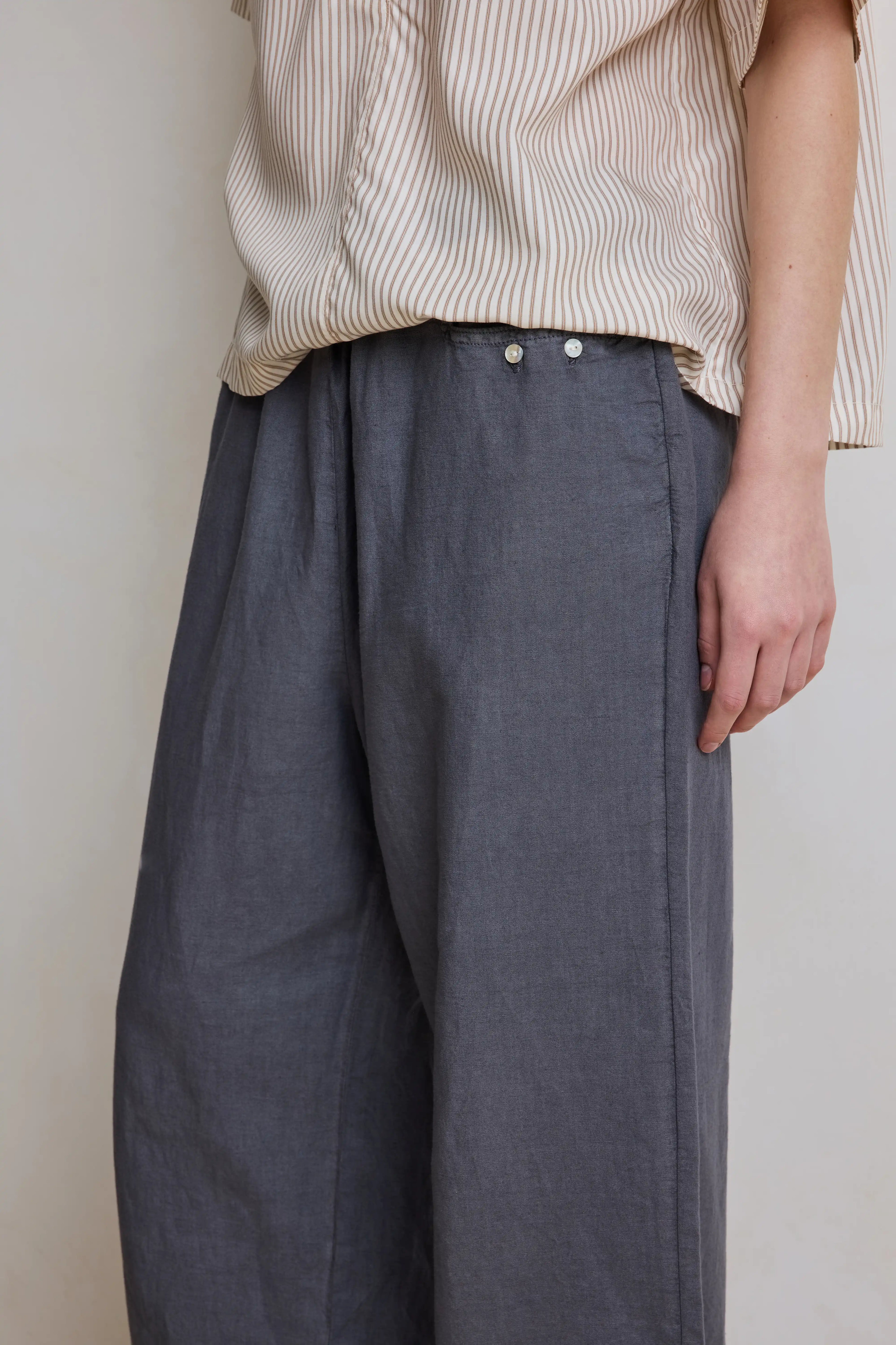 Il s'agit d'un pantalon monté sur élastique, taille middle. Il possède deux poches à l'avant ornées de petits boutons nacrés. Sa jambe est large.