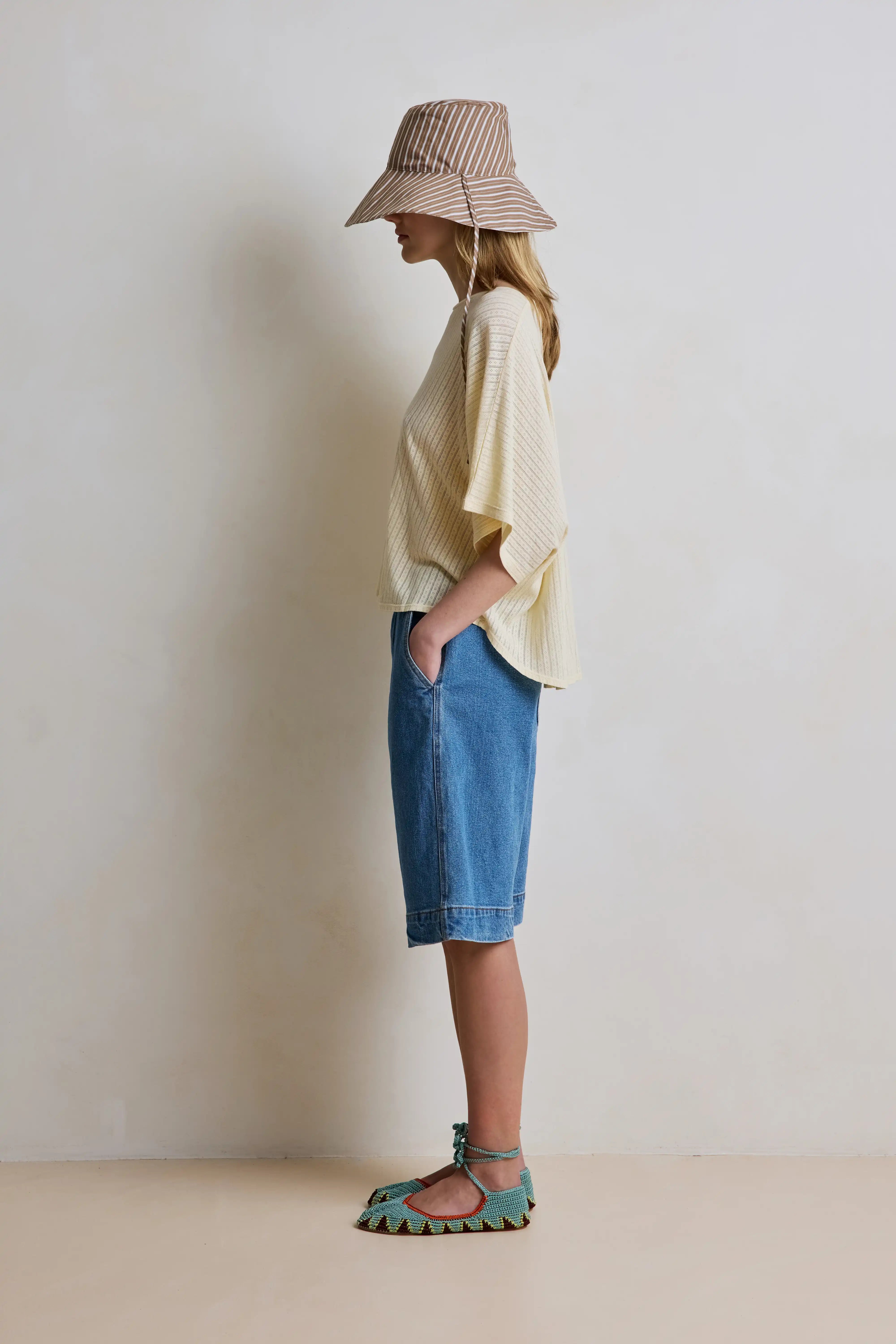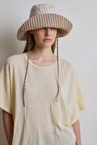 Coralie est un t-shirt col rond à la coupe chauve souris. Il est oversize. Sa matière en pointèle le rend très délicat.