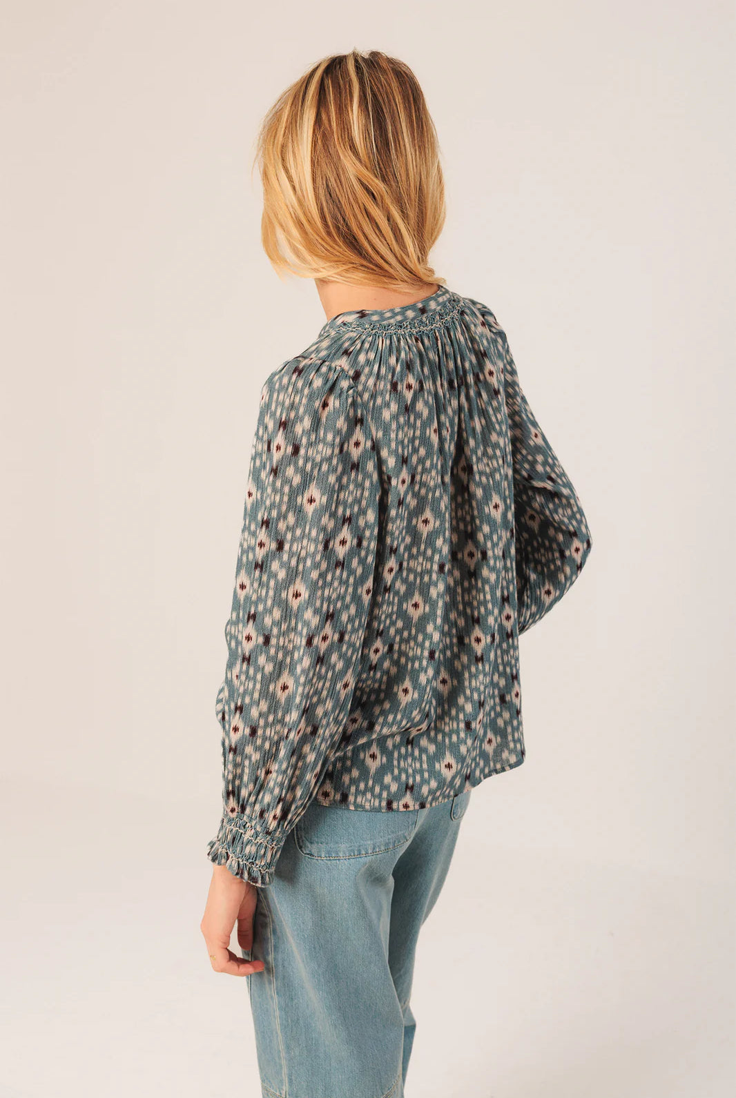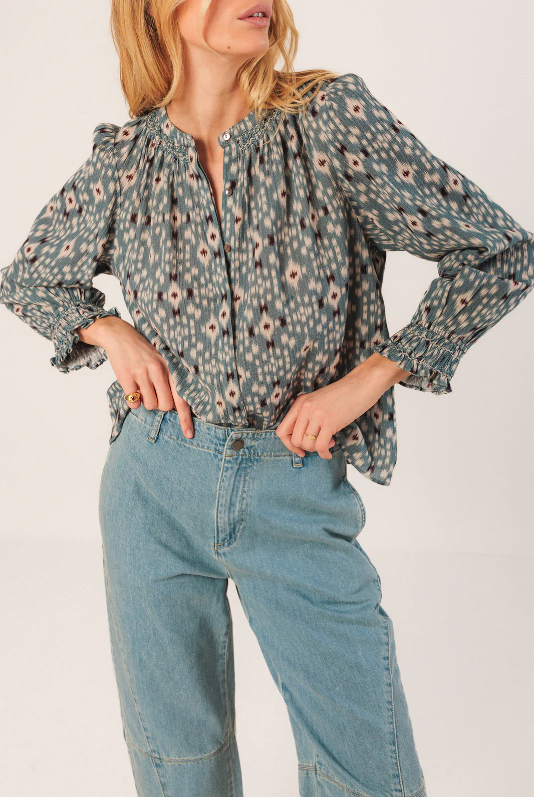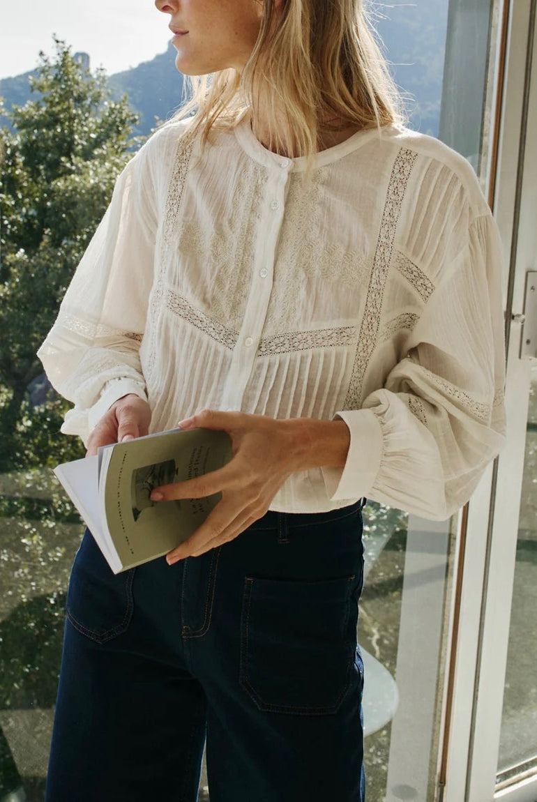Chaque pièce est pensée pour le style plutôt que la tendance éphémère : blouses délicates aux épaules smockées à la main, robes imprimées fluides, pulls en alpaga tout doux, vestes en coton biologique. Des créations minutieuses qui allient confort et sophistication féminine.