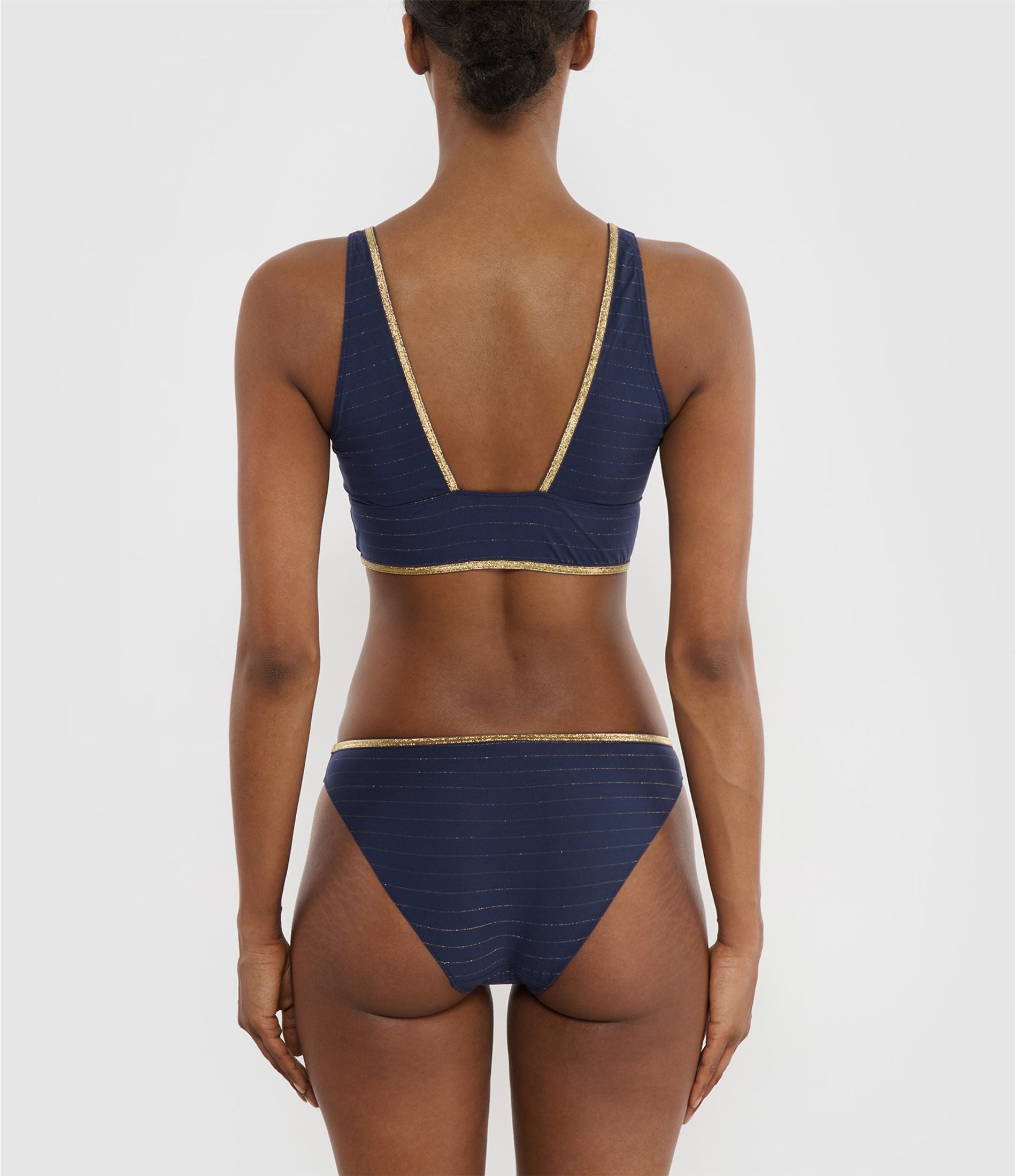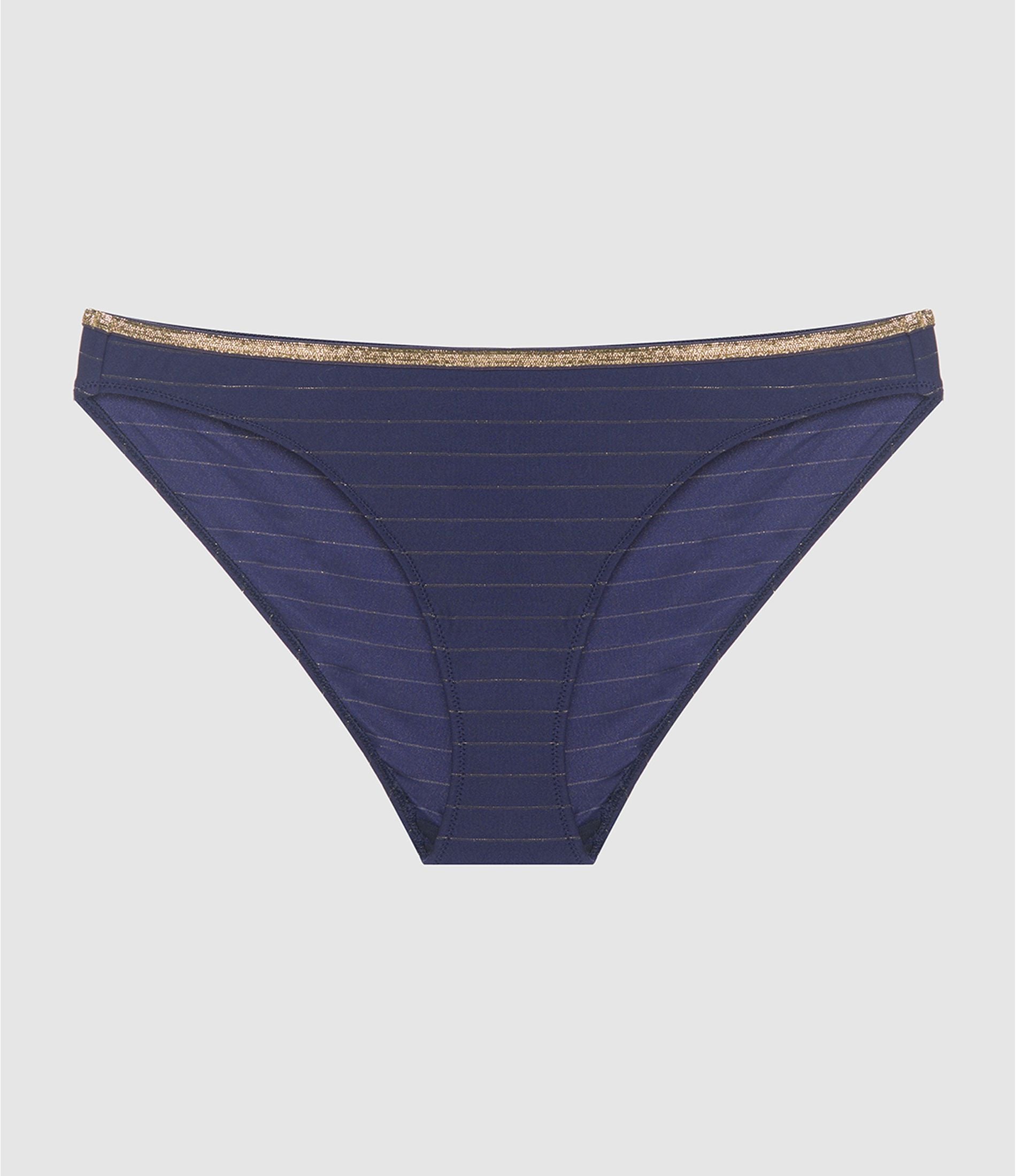 Culotte bleu marine à rayures lurex avec liseré doré. Entièrement élastiquée pour assurer confort et maintien. Fond doublé