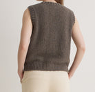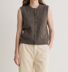 Gilet confectionné en laine mérinos et fibres recyclées. Qualité bouclée. Coupe droite. Col rond. Sans manches. Fermeture frontale avec boutons effet écaille. Deux poches plaquées sur le devant