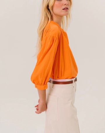 Blouse unie à manches 3/4 en popeline fine de coton. Coupe ample et féminine soulignée de fronces aux épaules, au dos et aux poignets. Col mao et boutonnage caché pour une touche subtile et élégante