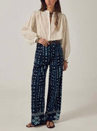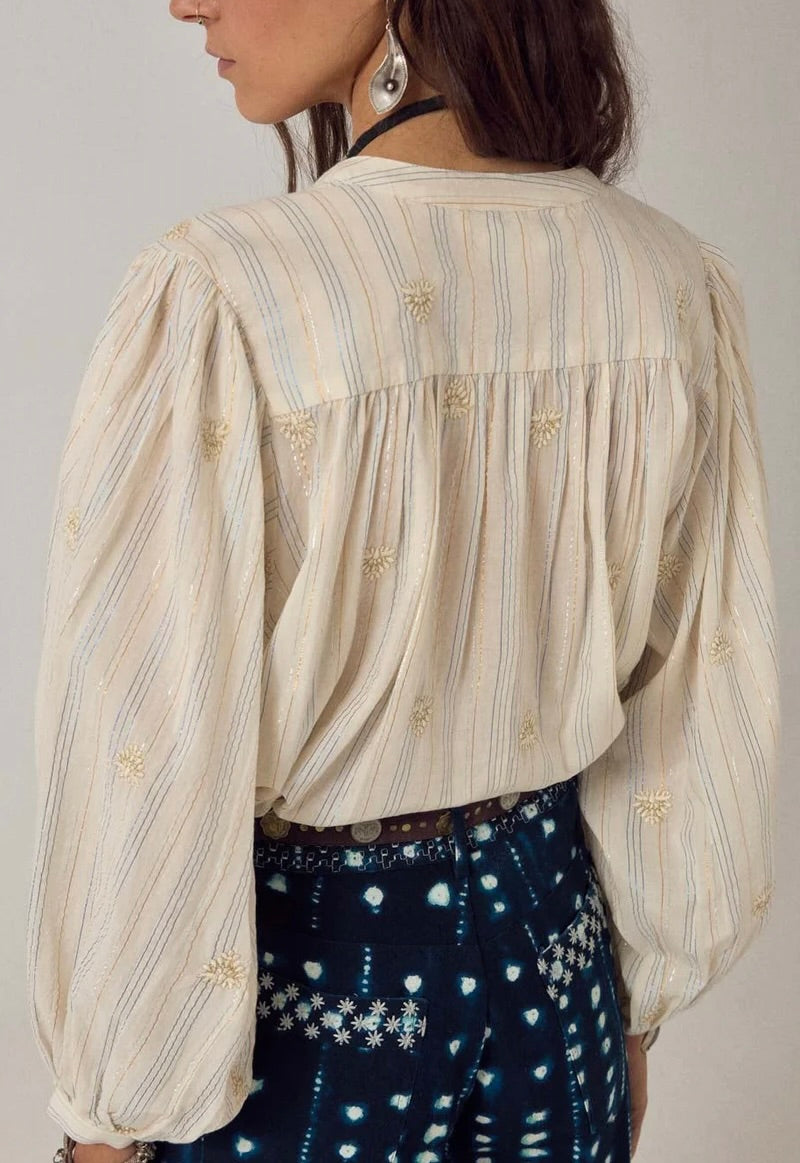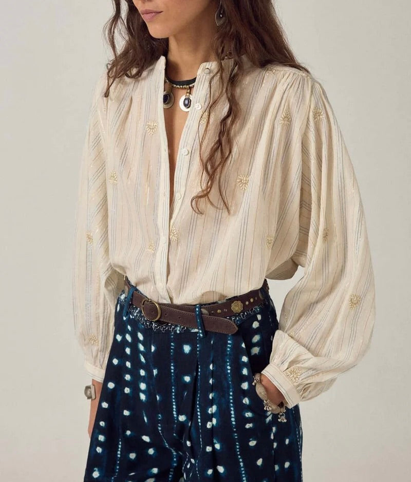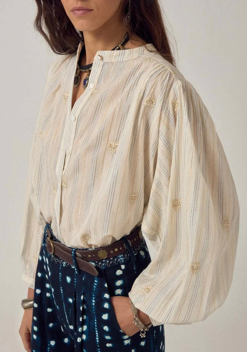 Coton blanc cassé parcouru de fines rayures verticales, tissé avec une touche de lurex pour capter la lumière en toute discrétion. Petits motifs brodés évoquant des soleils, disséminés sur le tissu, simples mais élégants