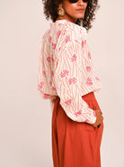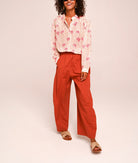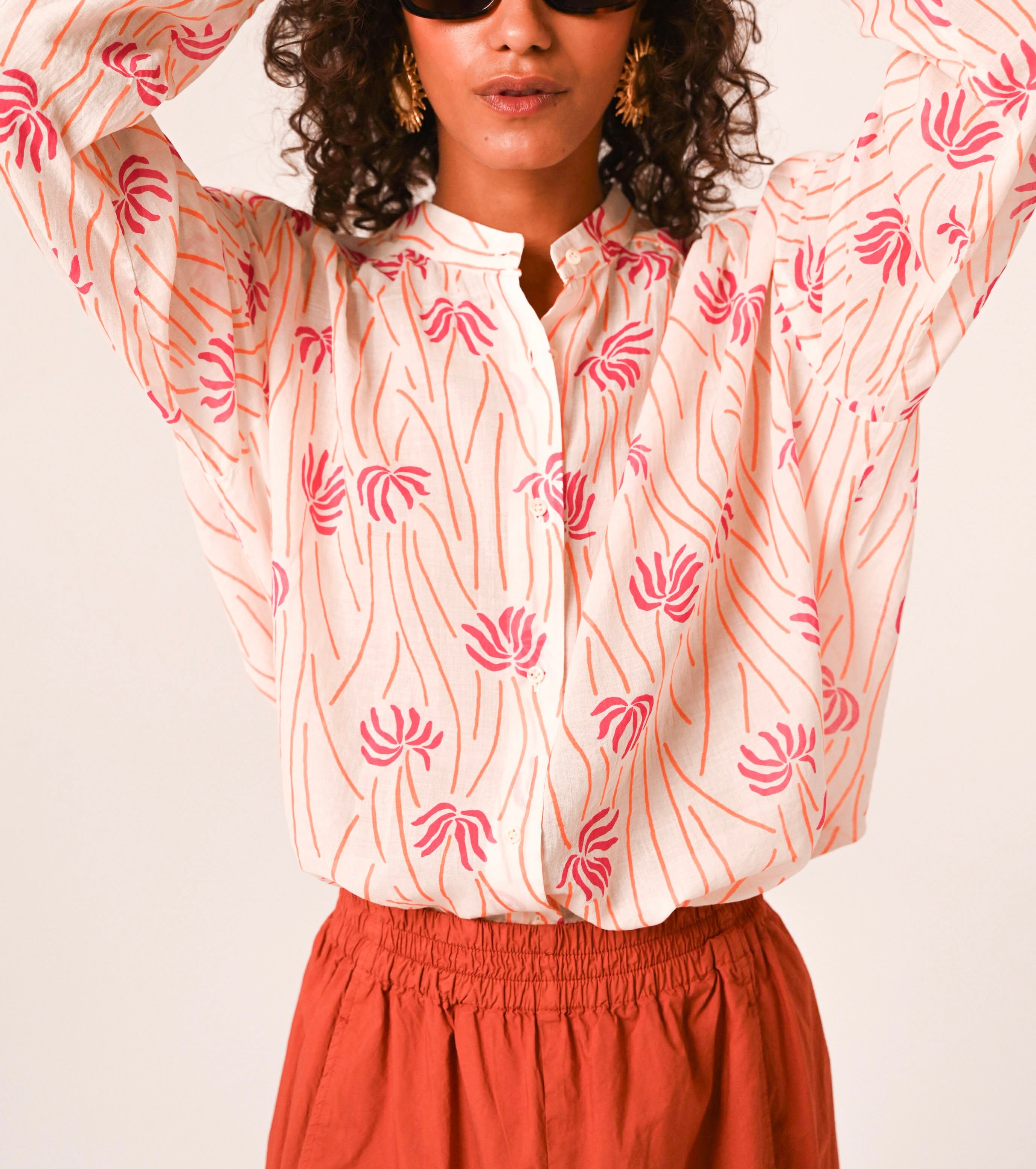 Imprimé buzios dans les tons de orange et rose sur un fond écru