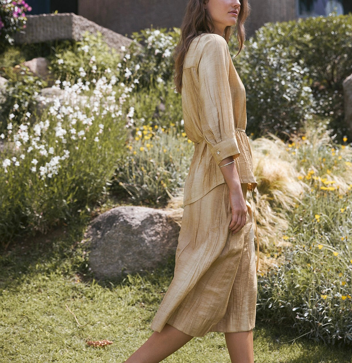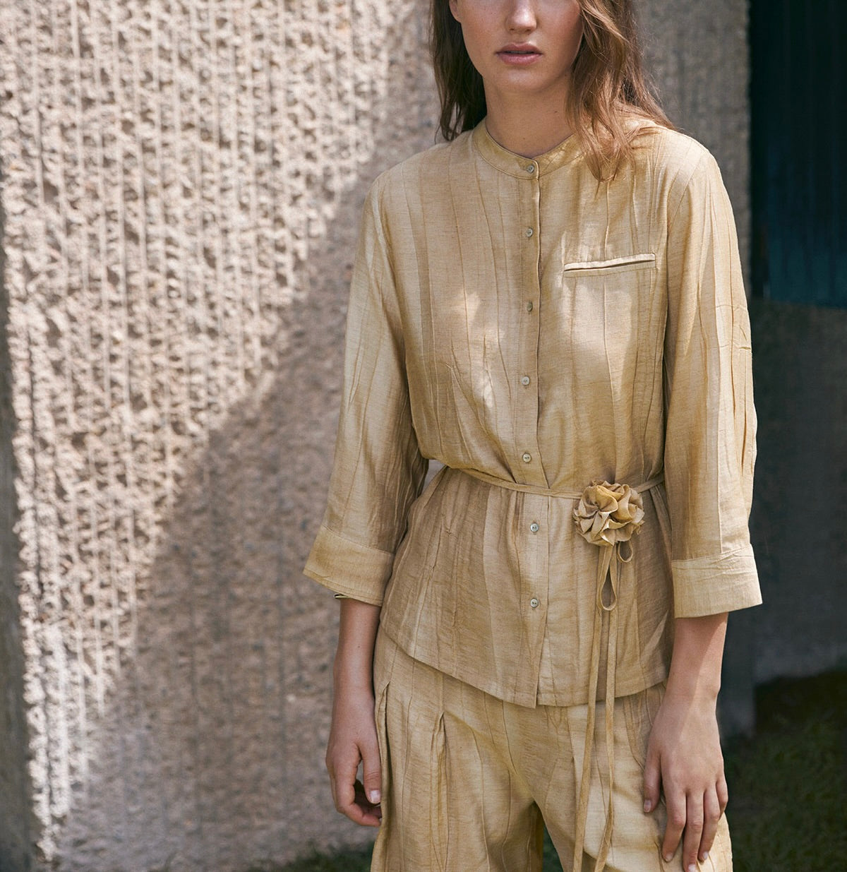 Chemise à effet plissé ton doré. Coupe droite. Tissu mélangé de lin et de viscose. Col Mao. Manches trois-quarts. Poignets boutonnés. Fermeture frontale avec boutons nacrés. Poche décorative sur la poitrine. Détail de ceinture amovible avec fleur décorative. Plis au dos. Longueur depuis l’épaule : 71 cm (taille S).