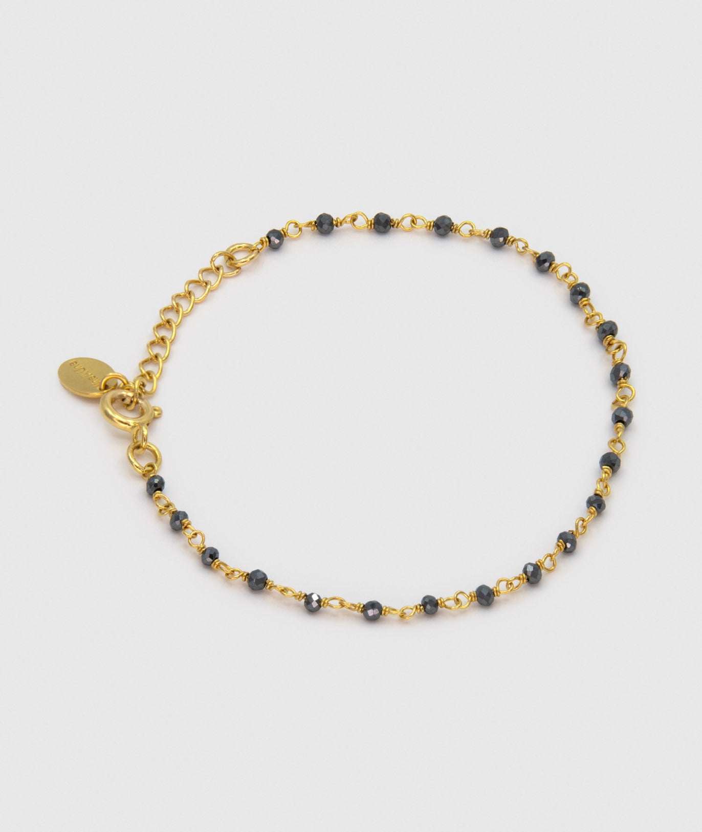Bracelet délicat alliant chaîne en laiton doré à l'or fin 18 carats et petites pierres facettées de pyrite noire. Les facettes scintillantes révèlent toute la profondeur des reflets bleu métallique de cette pierre aux propriétés apaisantes.