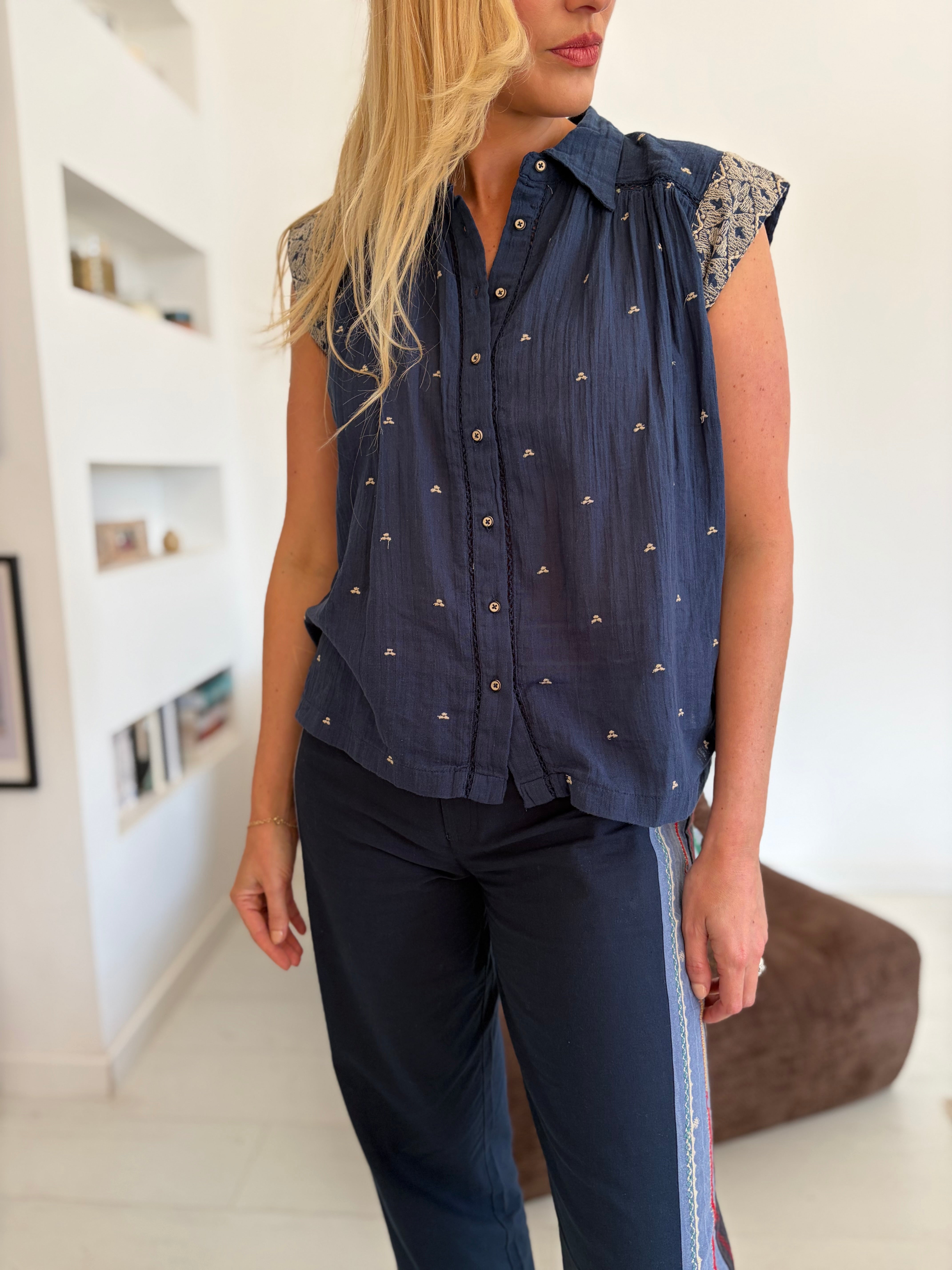 Imprimé broderies plumetis sur fond marine
