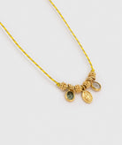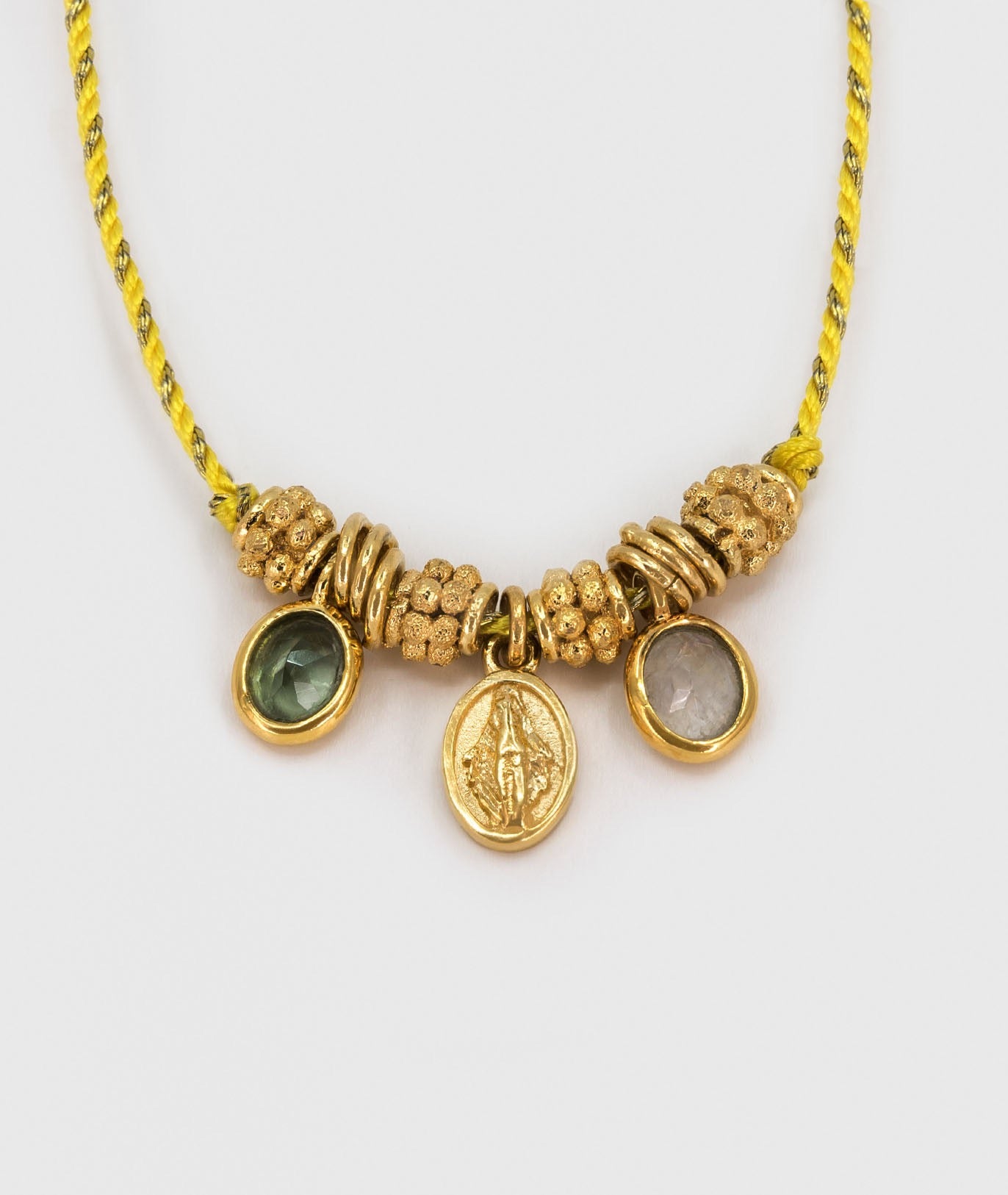 Le collier Carioca Sun est une création solaire et pleine de caractère. Un fil gold sun avec des anneaux et des cylindres martelés en laiton doré à l’or fin 18 carats (1 micron). Deux pierres serties de chaque côté, une pierre de lune blanche et une tourmaline verte, encadrent une petite médaille gravée d’une madone. Un bijou symbolique et lumineux, à porter au quotidien ou pour ajouter une touche précieuse et spirituelle à votre tenue.