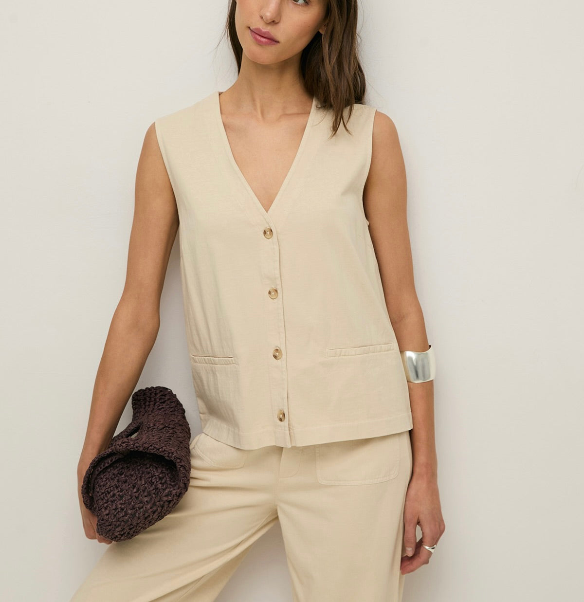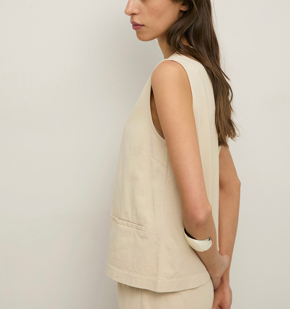 Design sans manches avec décolleté en V et fermeture par boutons sur le devant