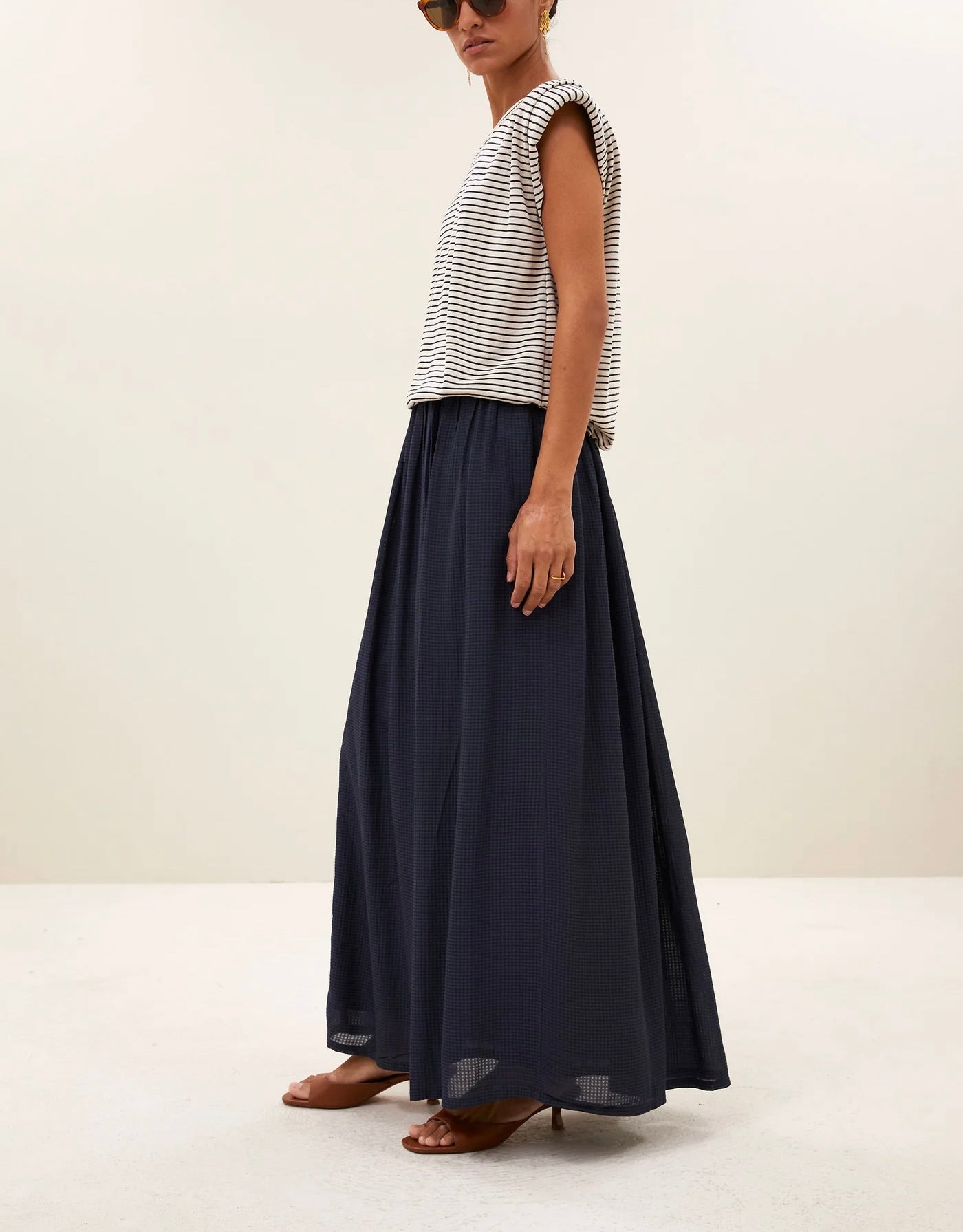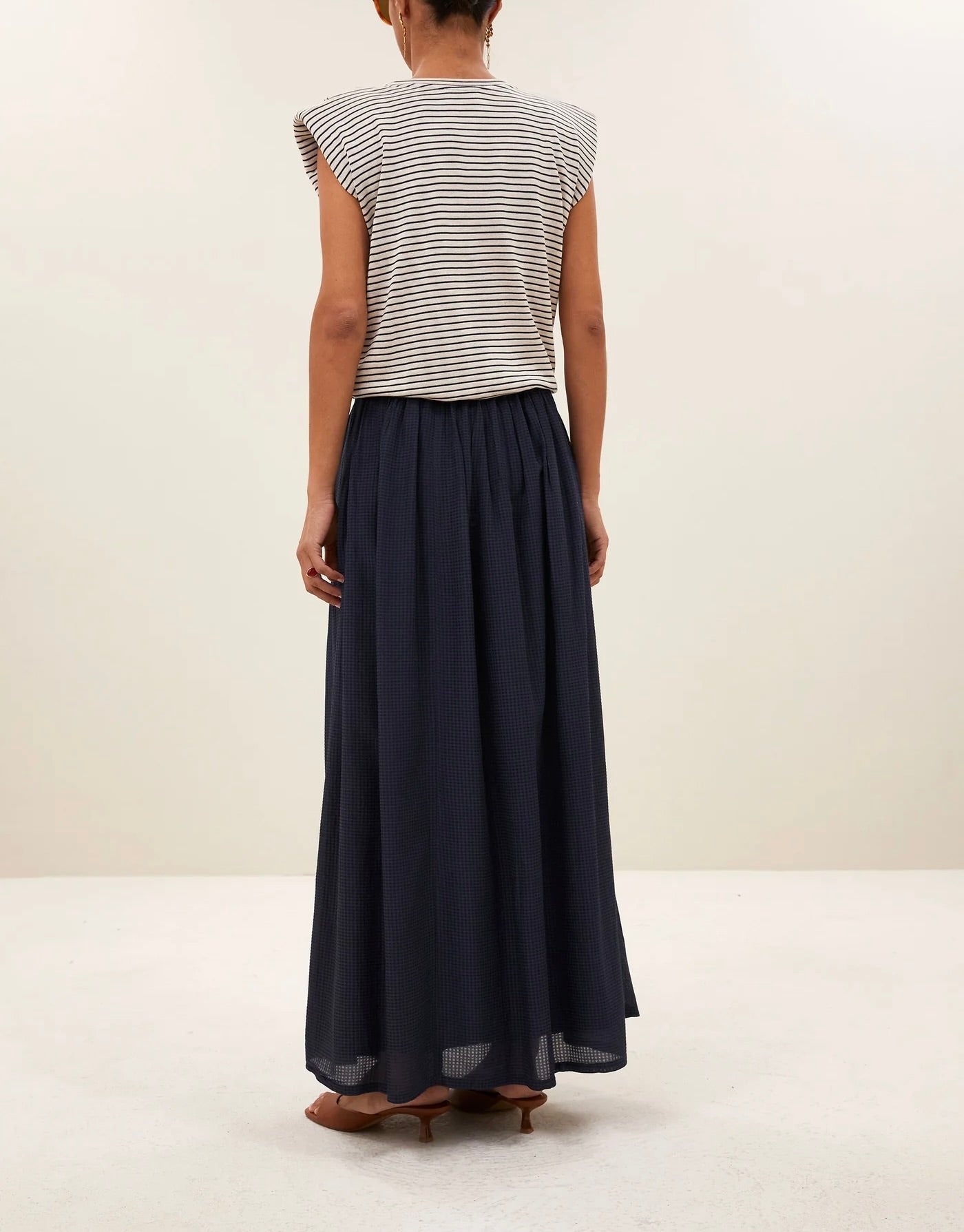 La reva skirt est une jupe longue à la coupe fluide qui offre un look casual chic. Grâce à son motif à carreaux subtil et sa coupe confortable, cette jupe est à la fois élégante et polyvalente, parfaite pour toutes les occasions où vous souhaitez adopter un style décontracté mais raffiné. Idéale pour celles qui aiment le confort sans compromettre le style
