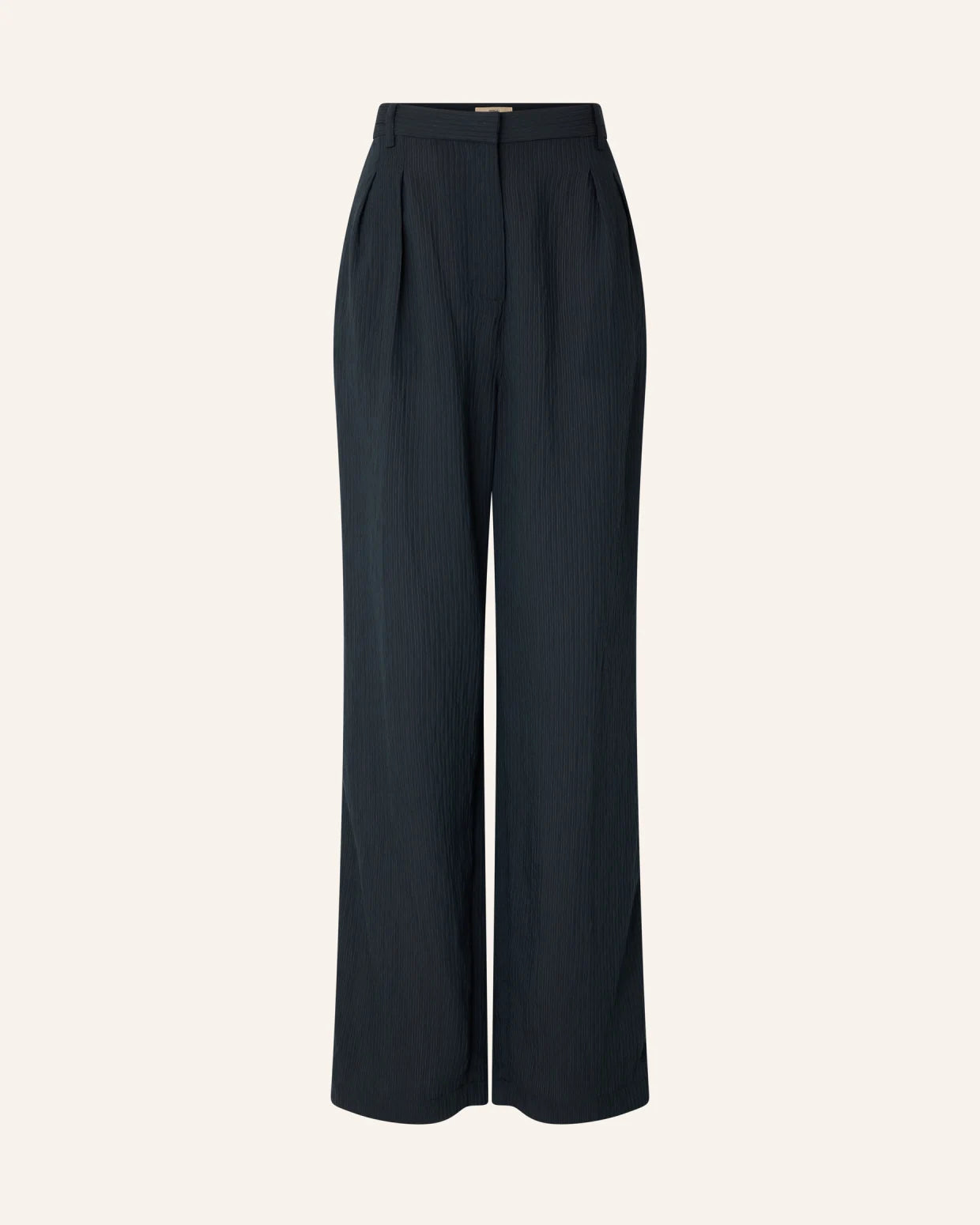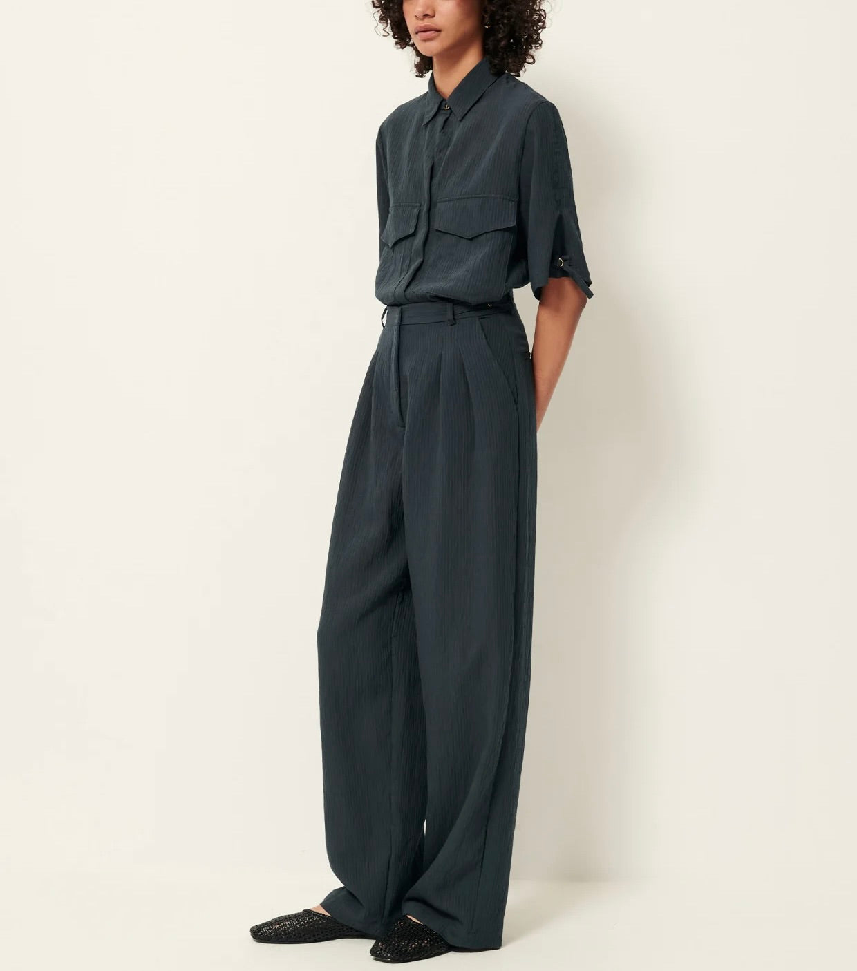 Pantalon d'inspiration masculine à plis couchés sous la ceinture en voile de viscose à rayures jacquard ton sur ton