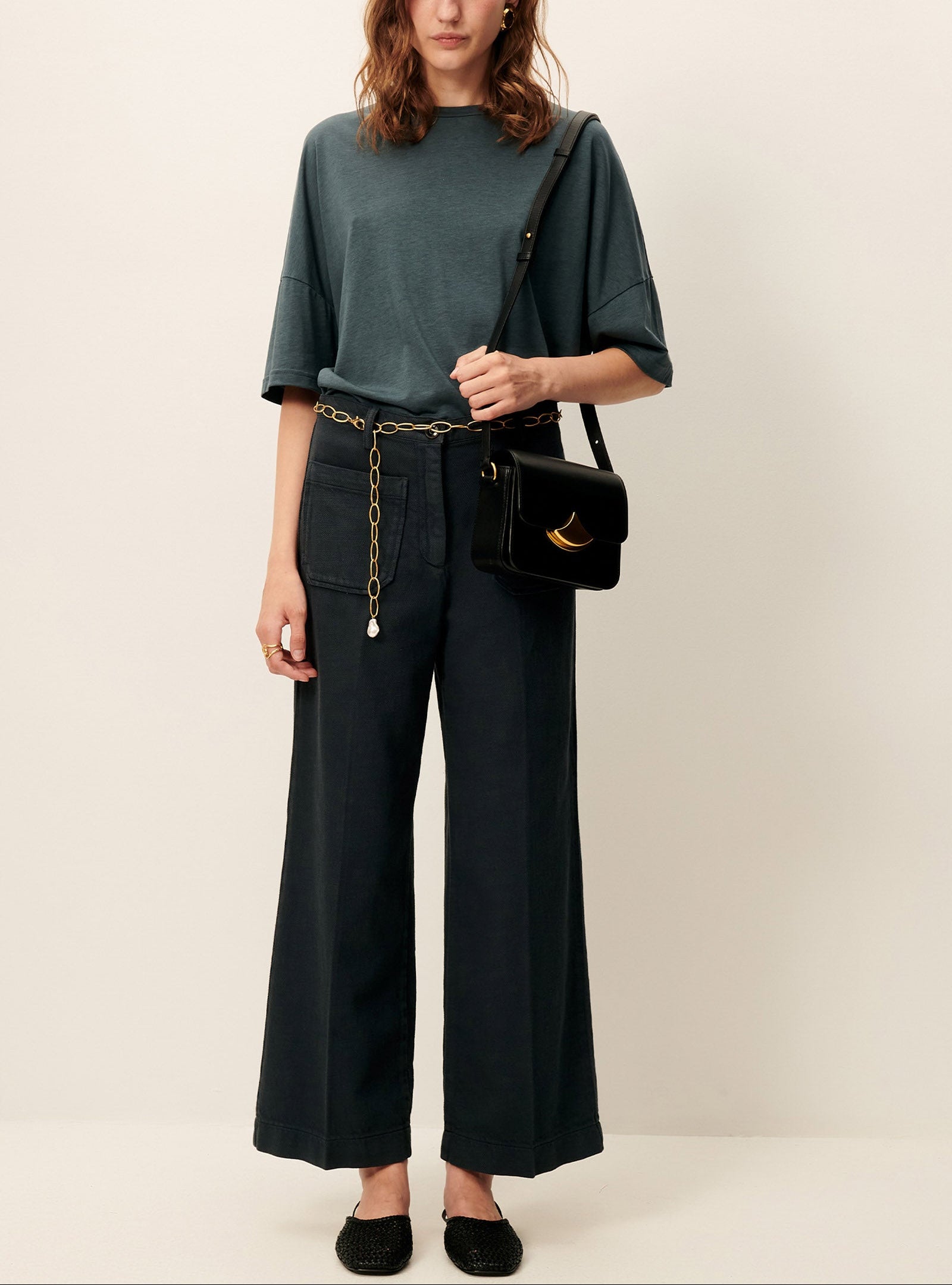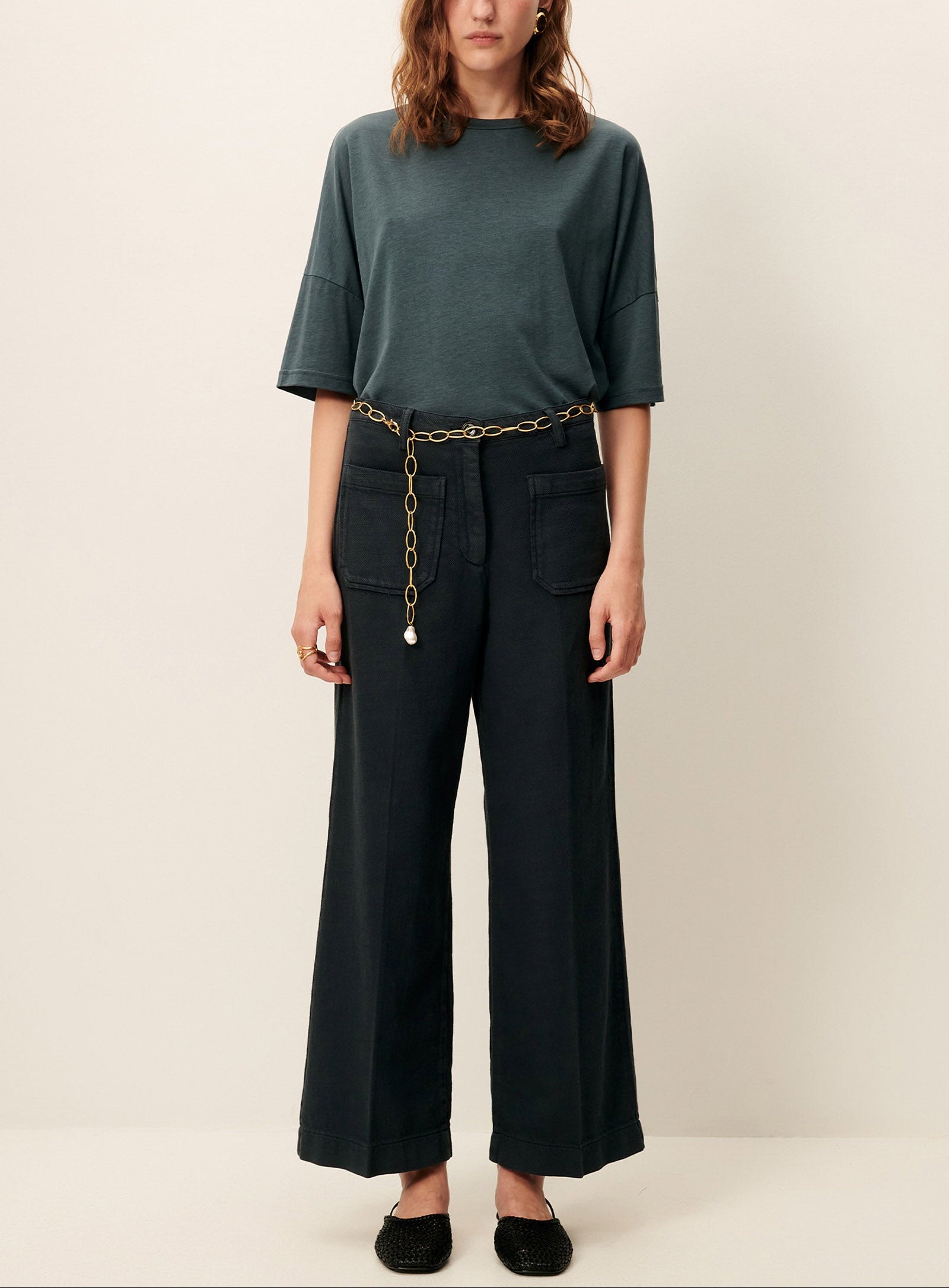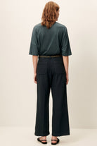 Pantalon droit 7/8ème à plis marqués, poches plaquées devant et dos, en sergé tricotine de coton organique, tissée en Espagne