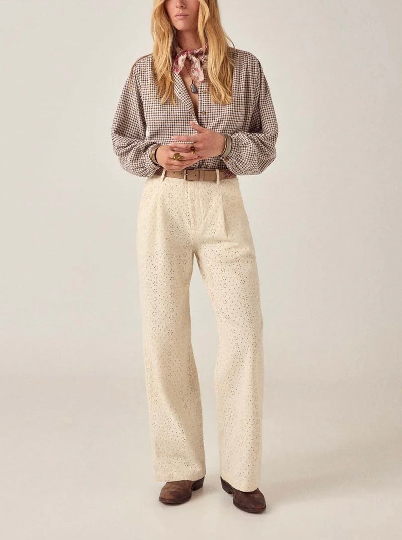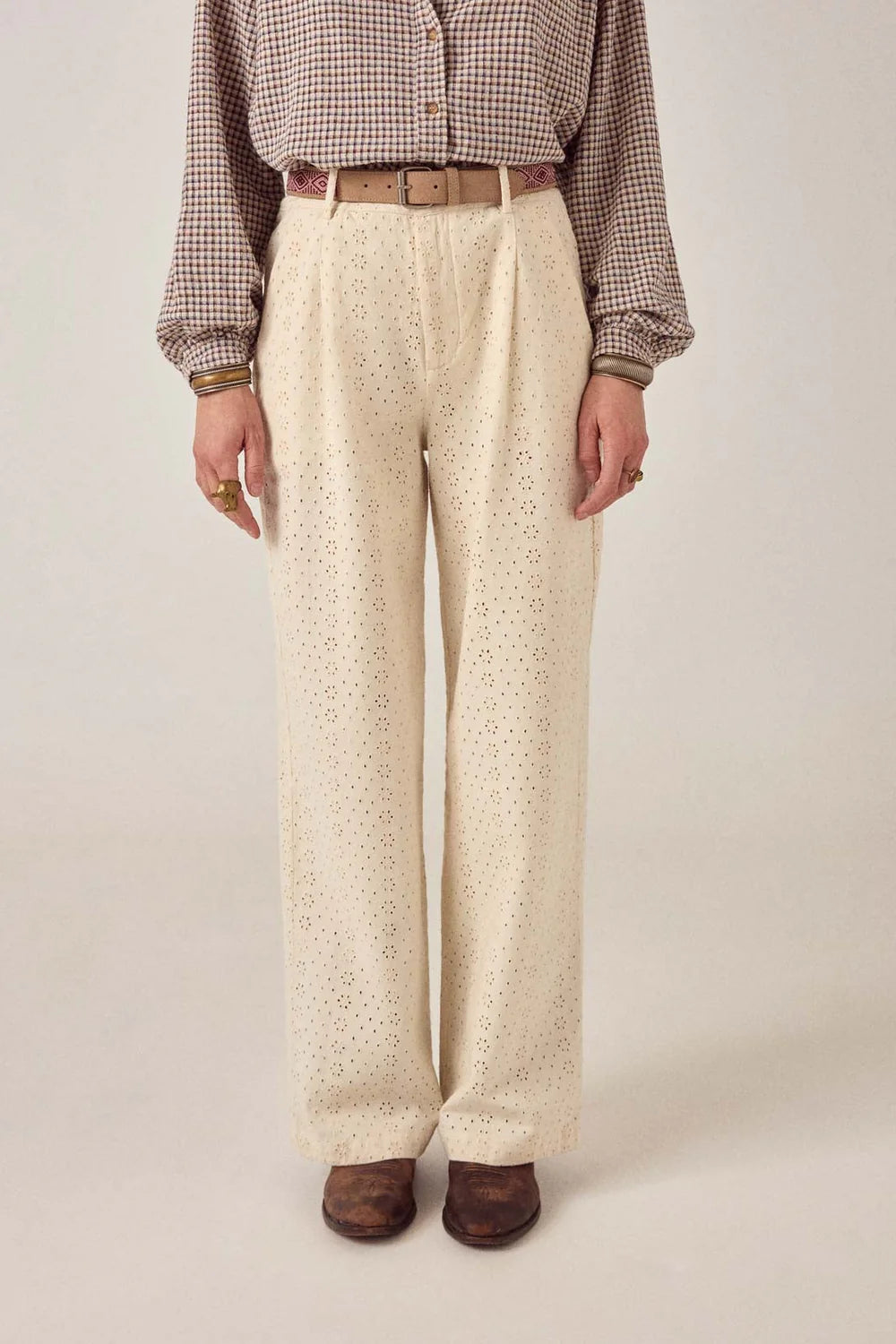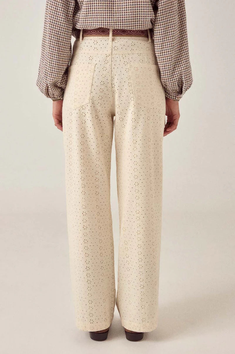 La matière est d'un blanc crème chaud, comme une toile brute laissée au soleil. La broderie crée une texture sans ajouter de couleur, grâce à de subtiles perforations qui laissent passer la lumière. Le sergé de coton lui confère structure et poids, et maintient la jambe large sans qu'elle ne s'affaisse