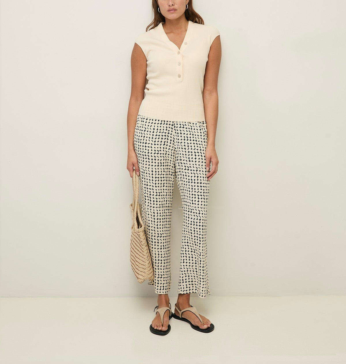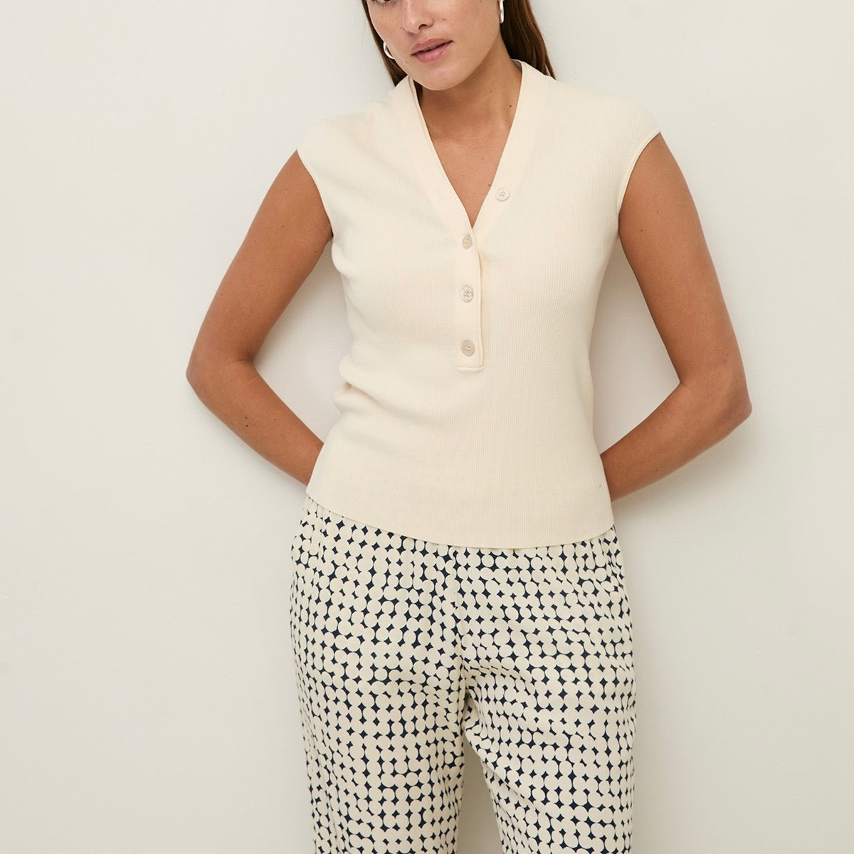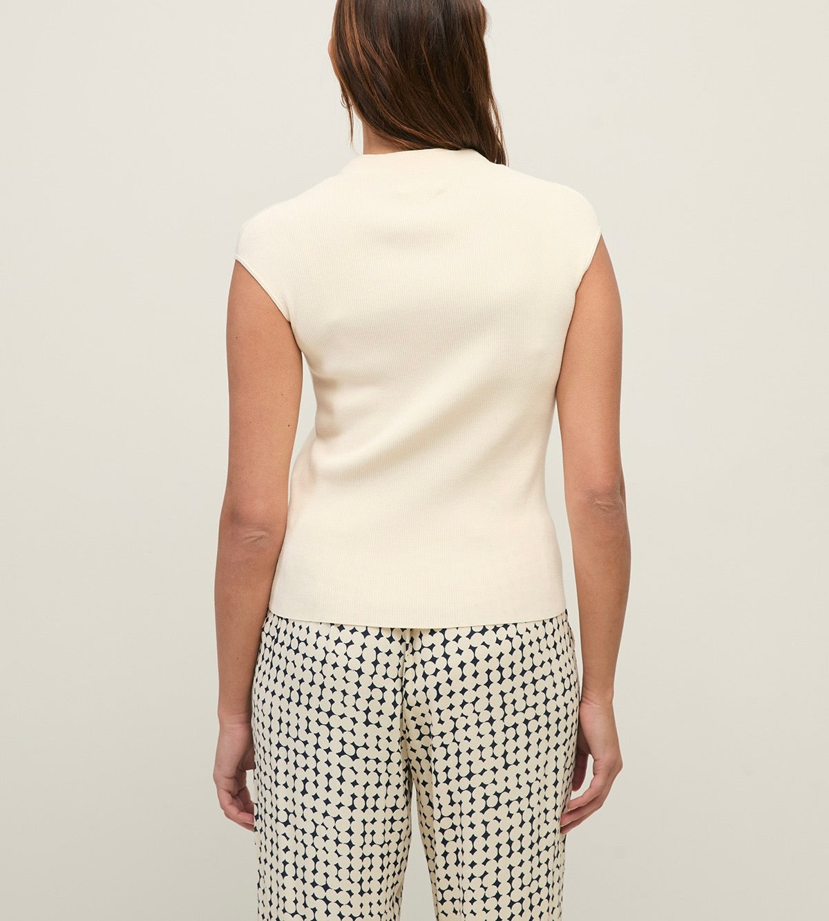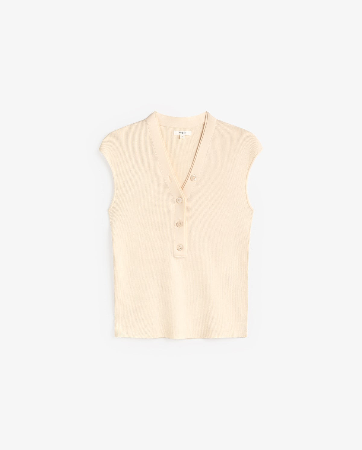 Top en maille côtelée couleur écru. Coupe droite. Col en V avec boutons. Sans manches. Jauge fine. Longueur depuis l’épaule : 56 cm (taille S).