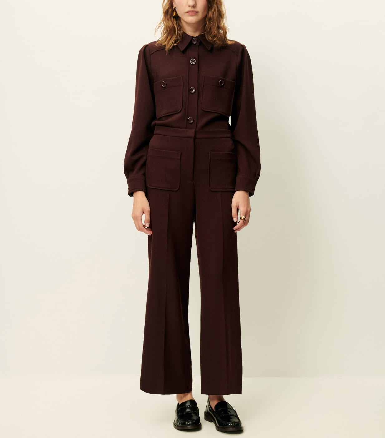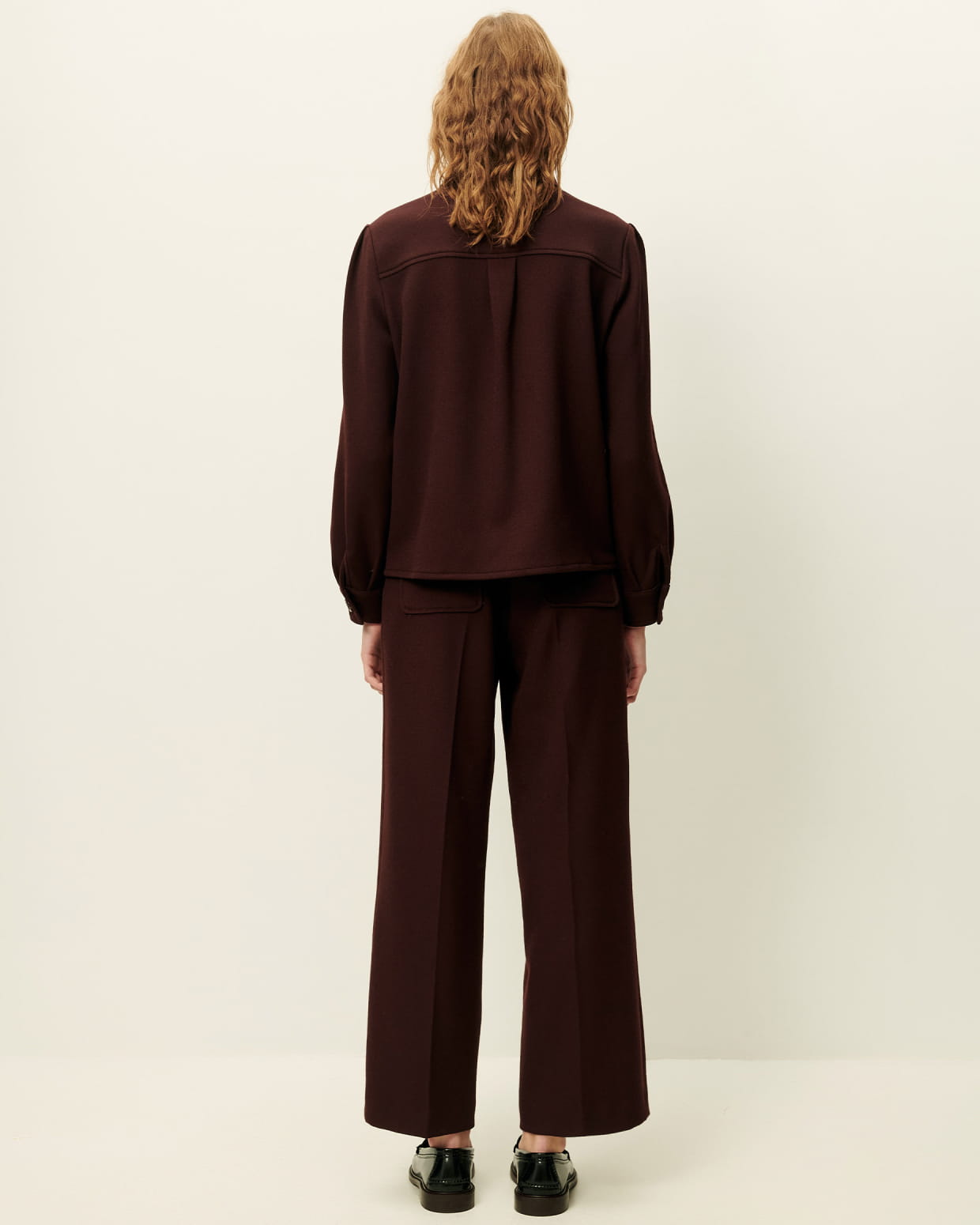 Pantalon droit à plis marqués en tricotine fluide, tissée au Portugal.