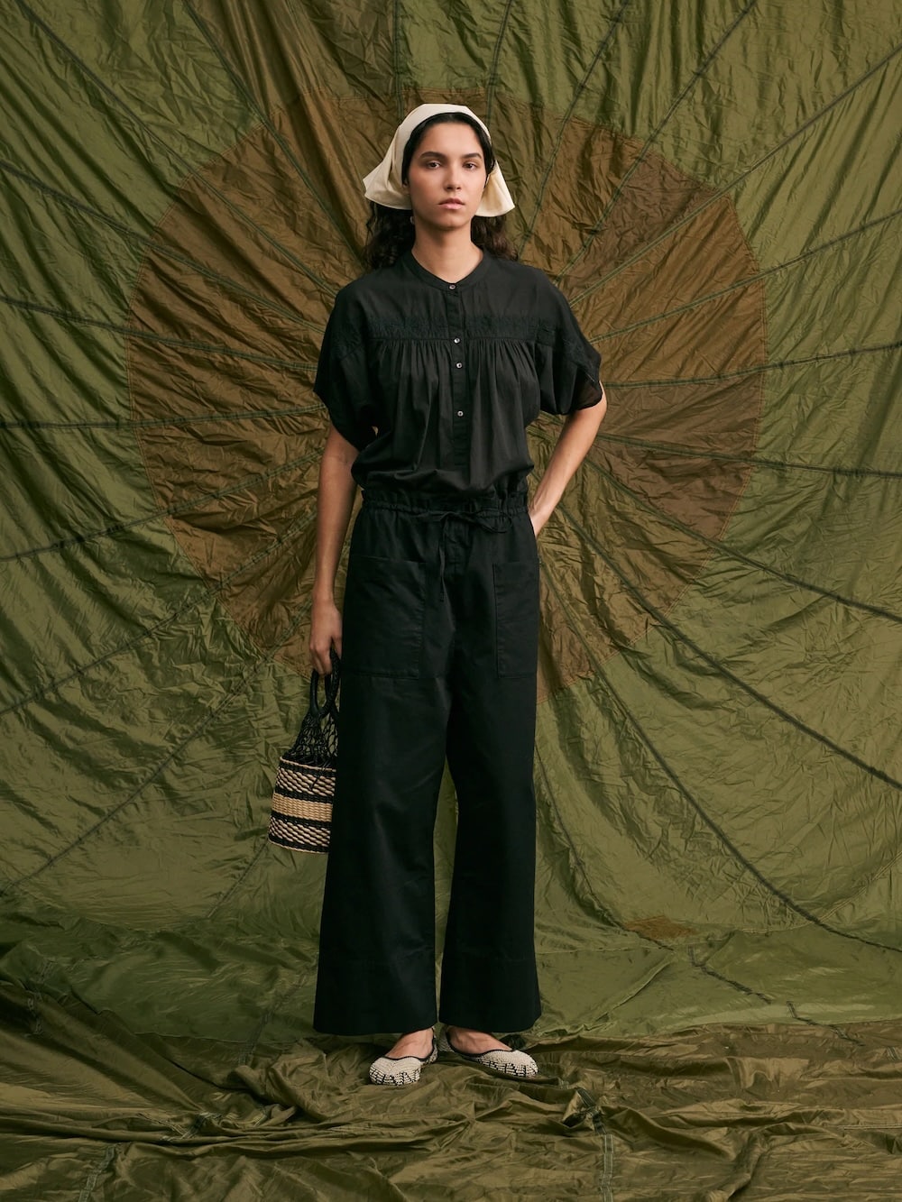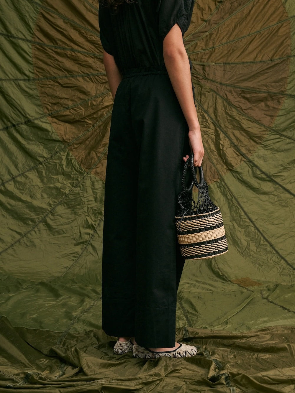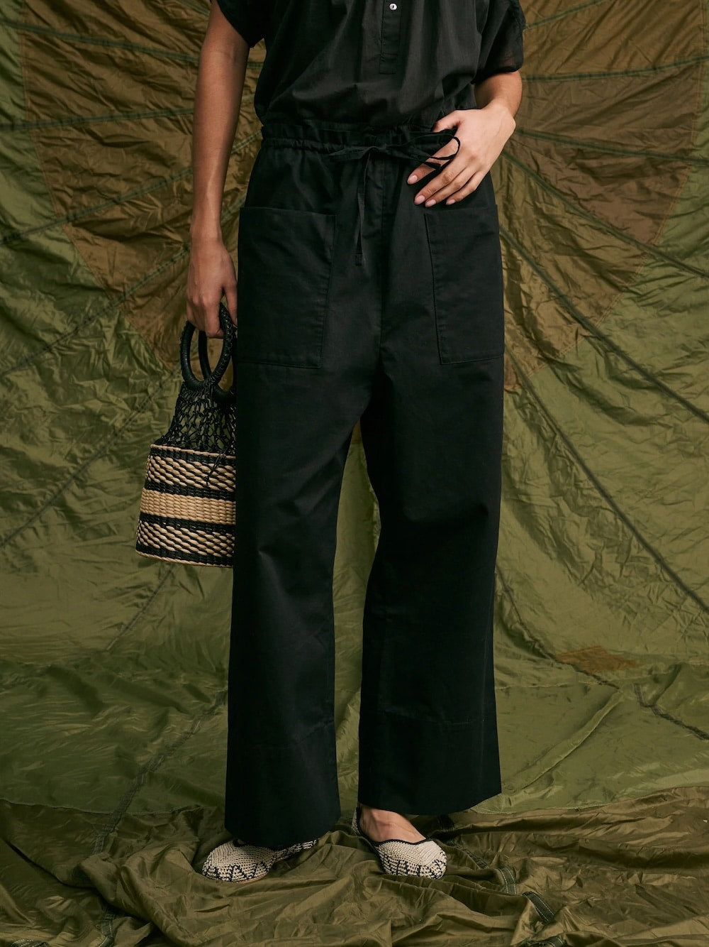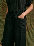 BABAKAR est un pantalon taille haute avec un élastique à la taille. Deux liens permettent de le maintenir à la hauteur souhaitée. Sa coupe est large et sa jambe est droite. Il possède deux poches plaquées sur le devant.