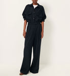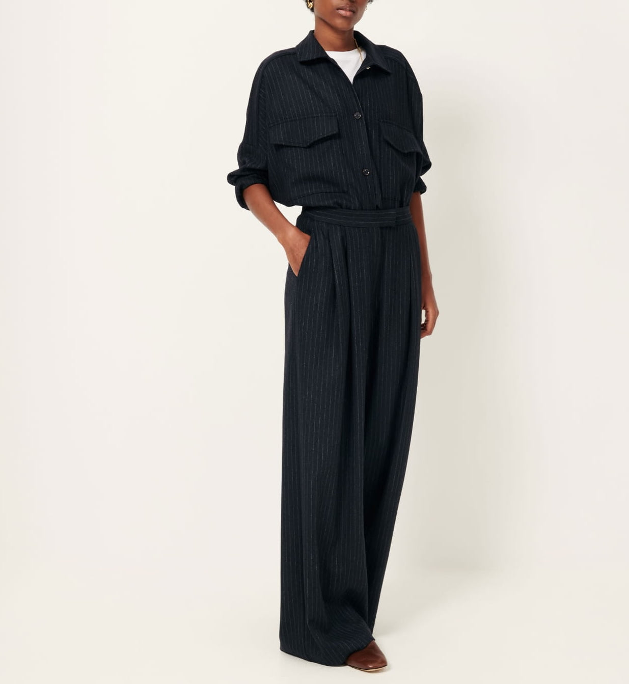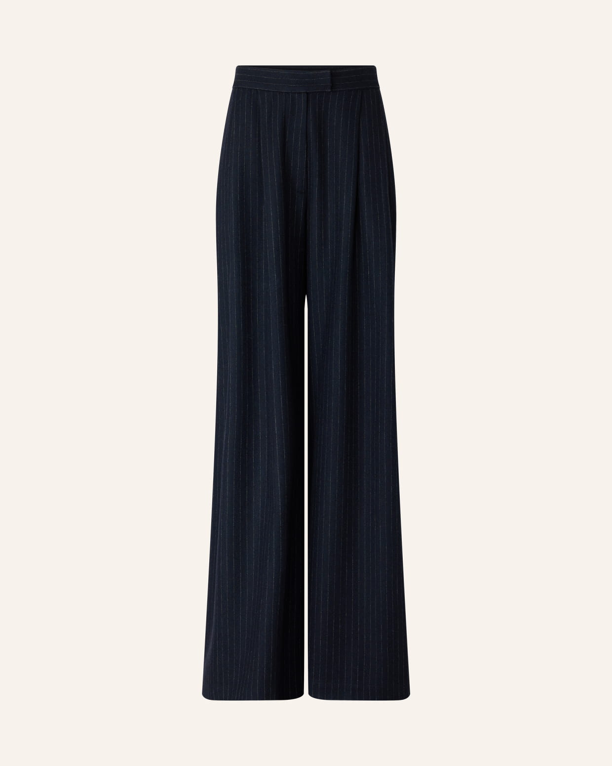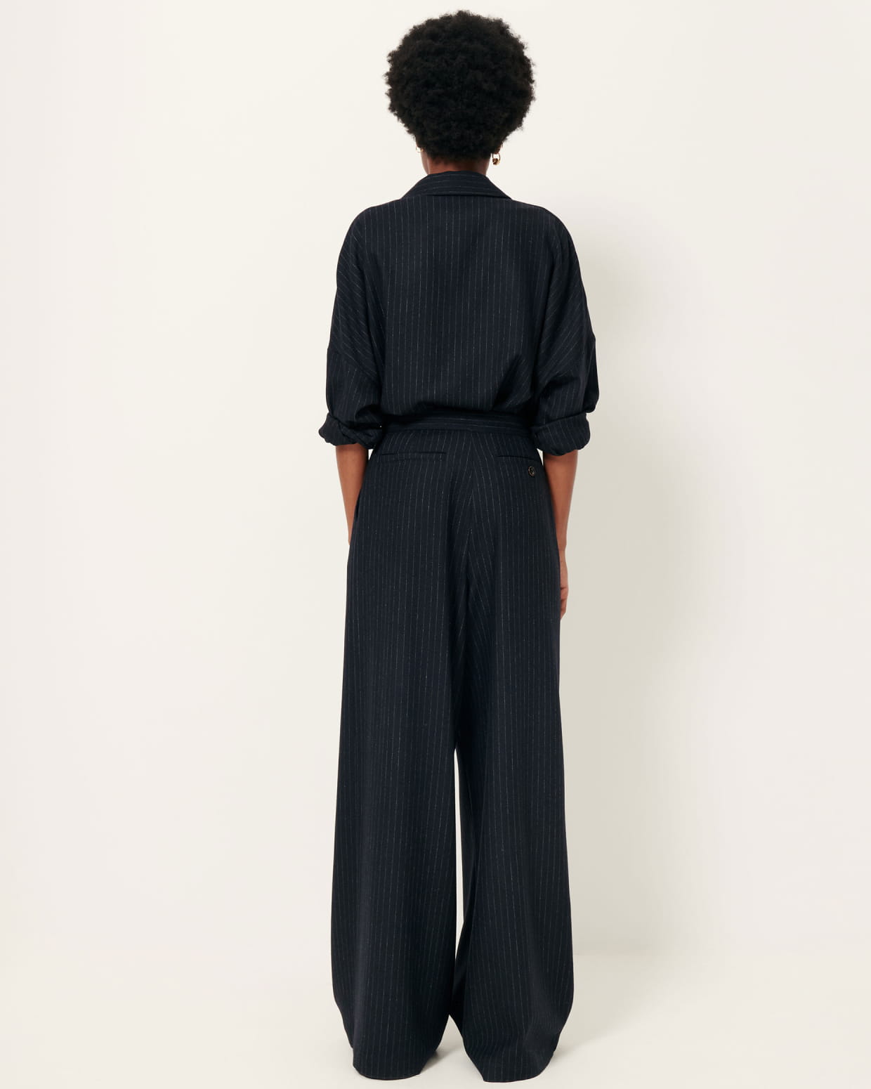 Pantalon ample à plis sous la ceinture en flanelle sergée effet chambray et rayures tennis, tissée en Italie.