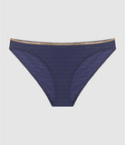 Culotte bleu marine à rayures lurex avec liseré doré. Entièrement élastiquée pour assurer confort et maintien. Fond doublé