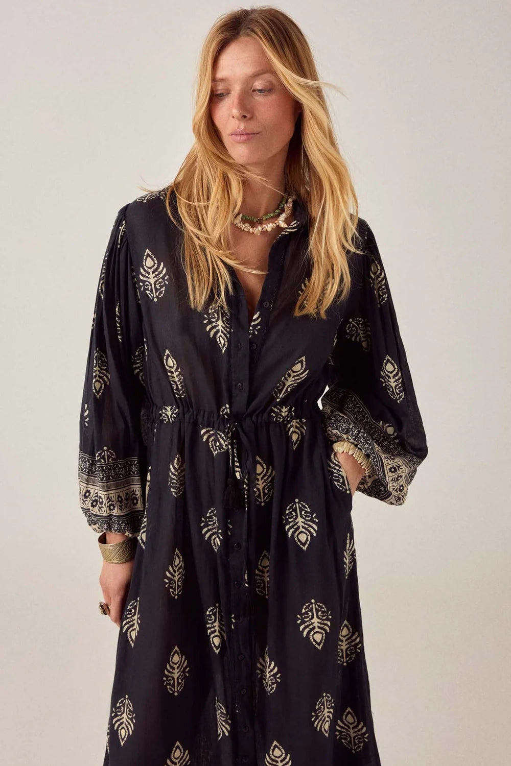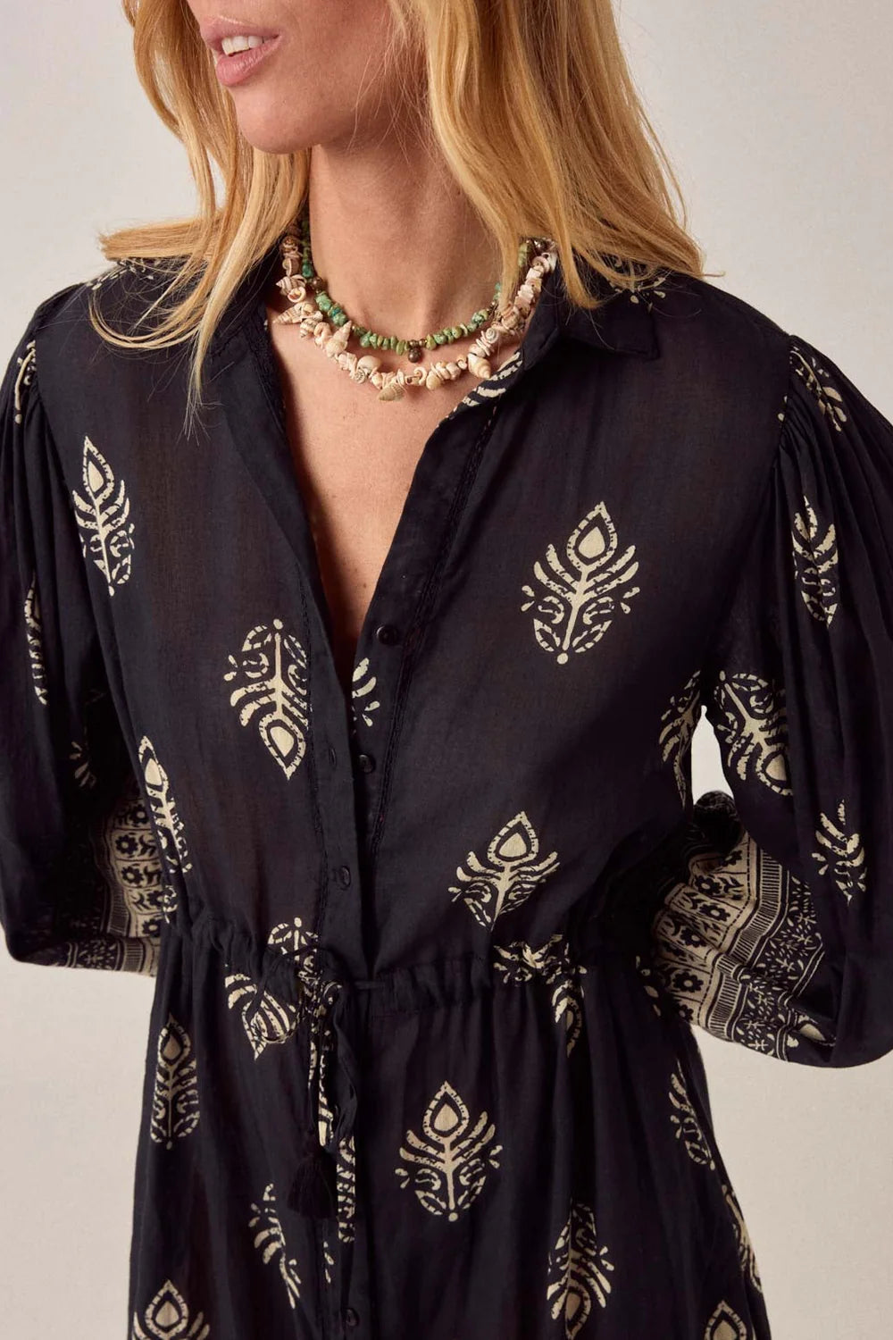 Fermeture par boutons classiques et lien de serrage à la taille