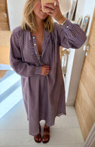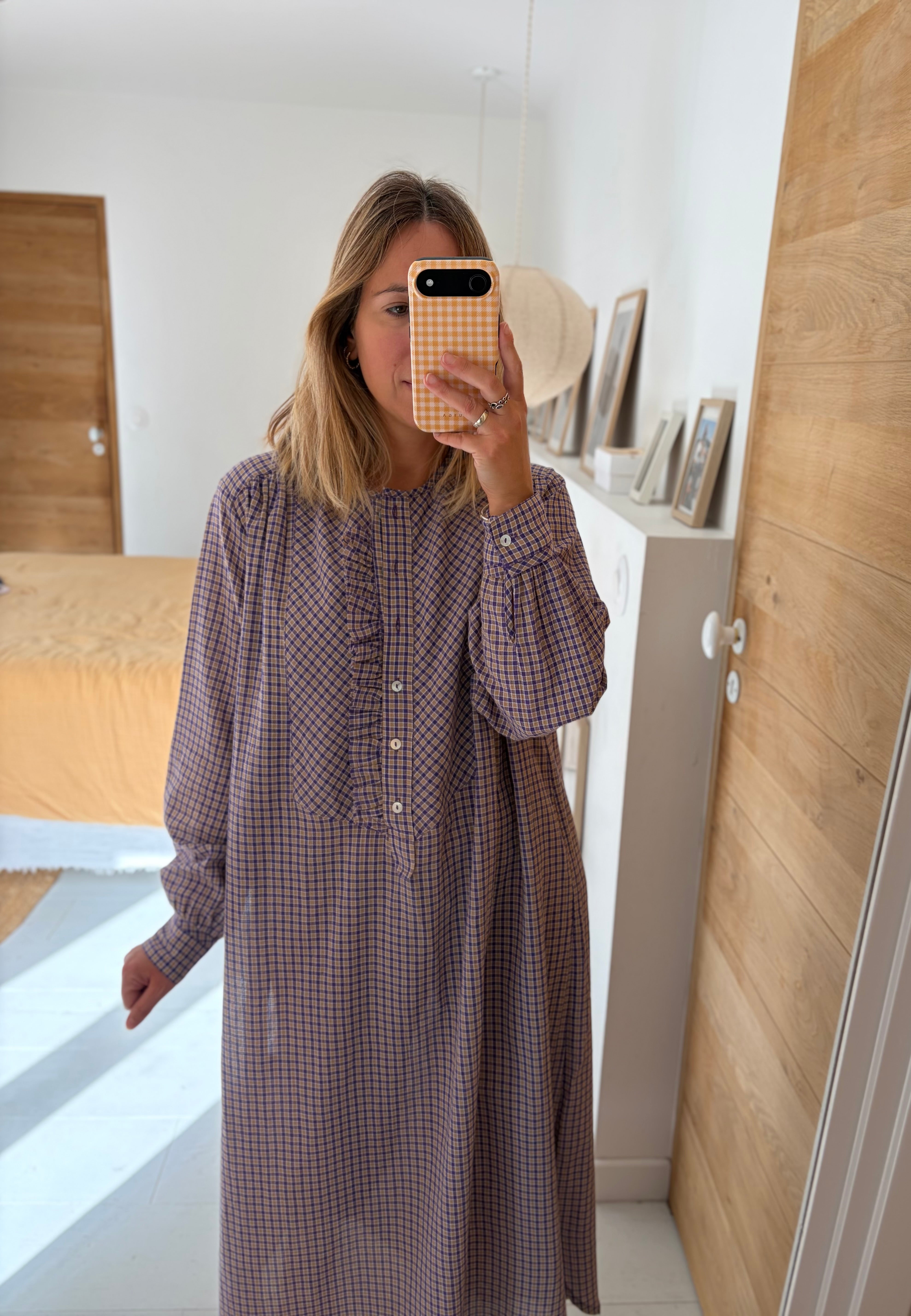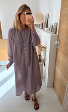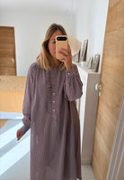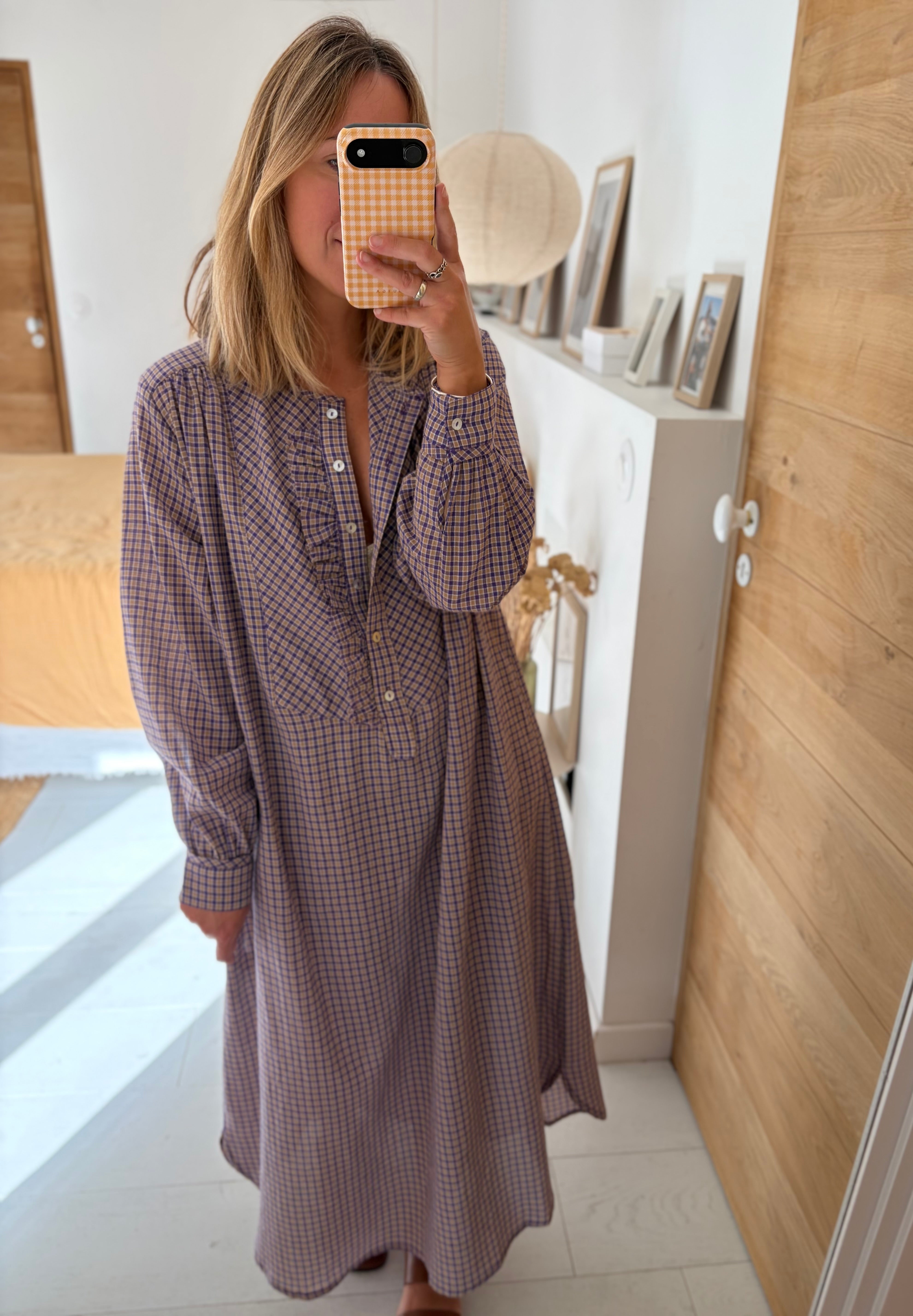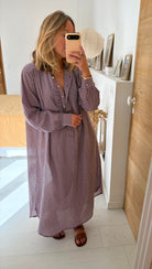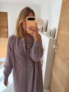 Notre robe Sally est une robe longue aux manches longues. Elle sera votre indispensable de la mi saison. Son col est rond et possède une patte de boutonnage ornée de petits froufrous.