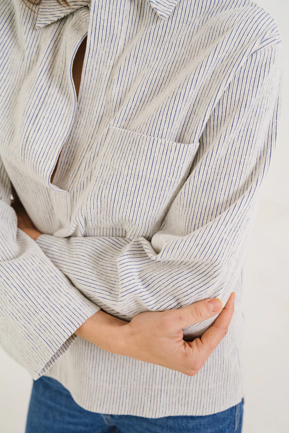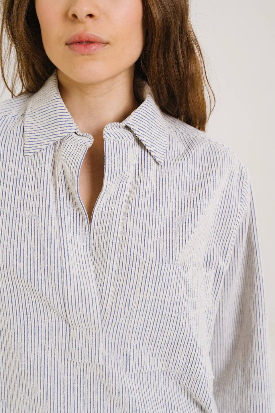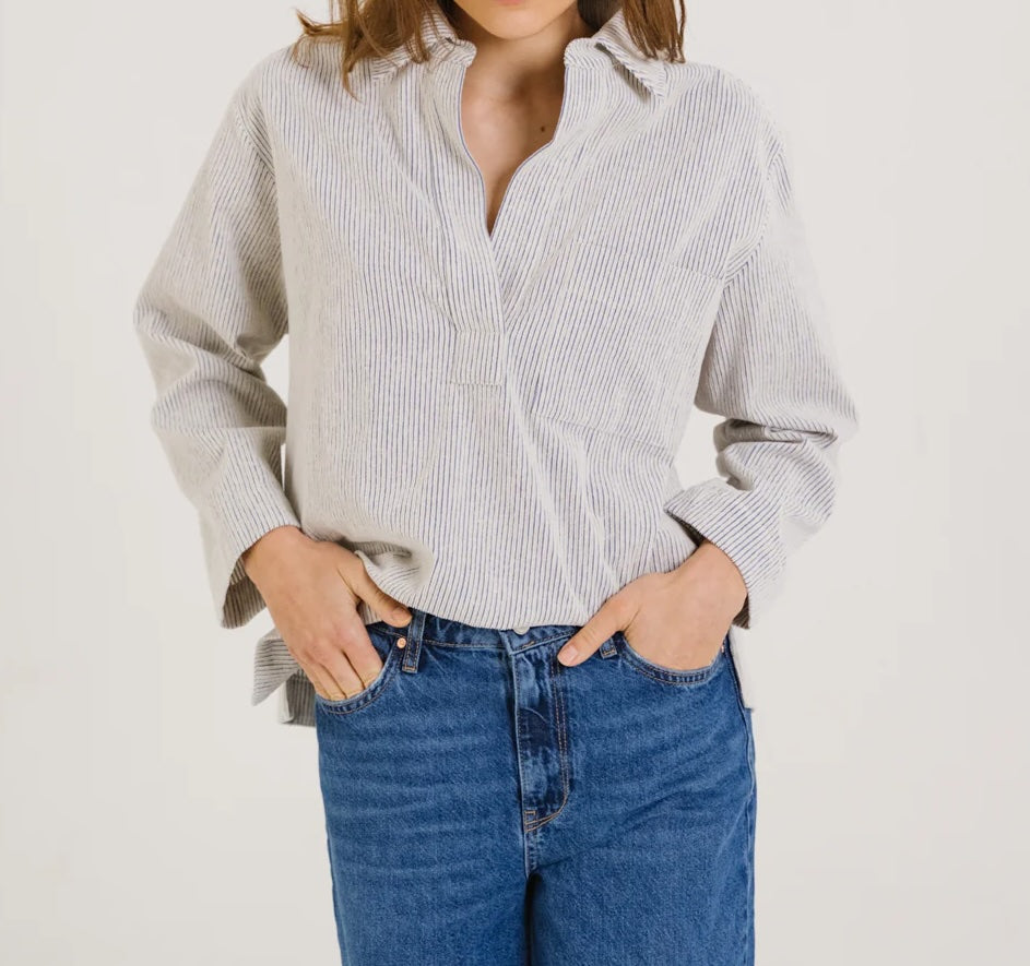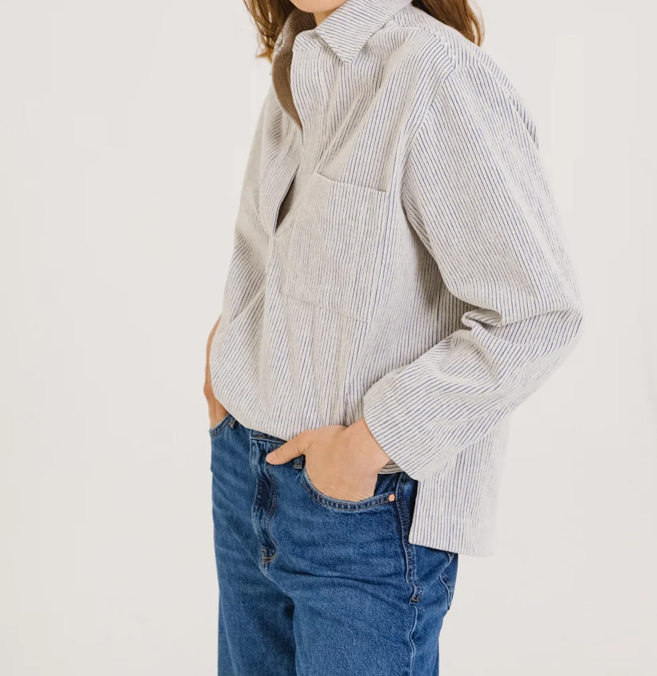 Blouse à col esprit vareuse, confectionnée en coton à rayures velours bleu et écru. Ses emmanchures basses et ses poches poitrine lui donnent une allure décontractée, tandis que les fentes côtés apportent fluidité et liberté de mouvement. Sans boutonnage, elle se distingue par des finitions épurées pour un style à la fois graphique et contemporain.