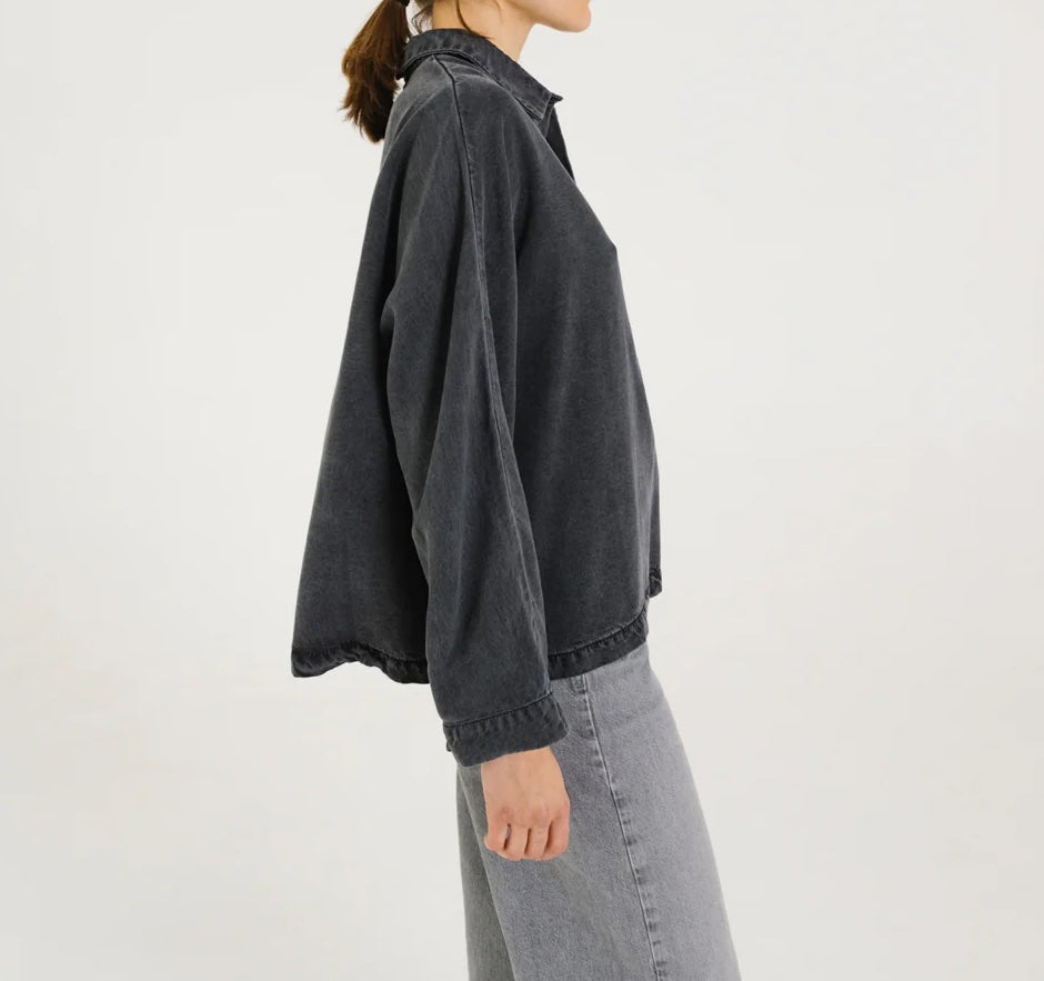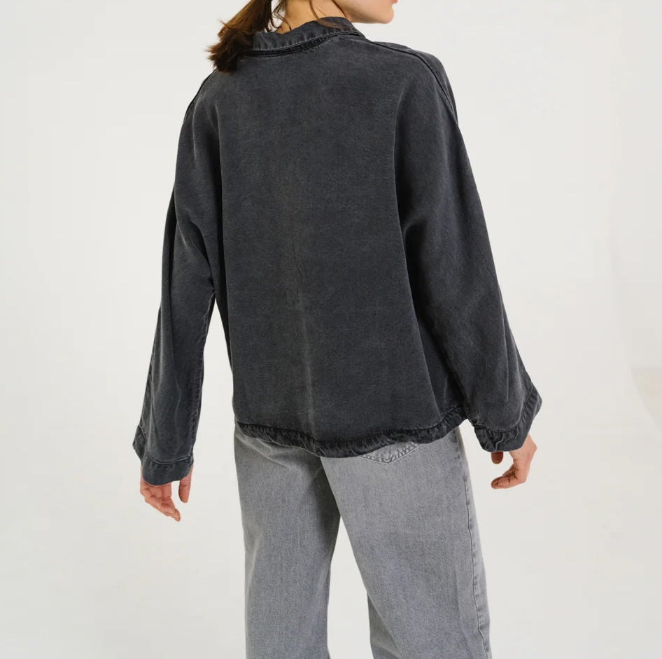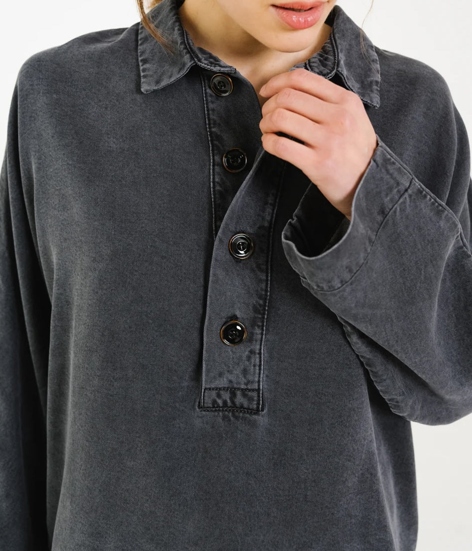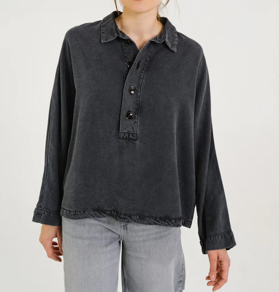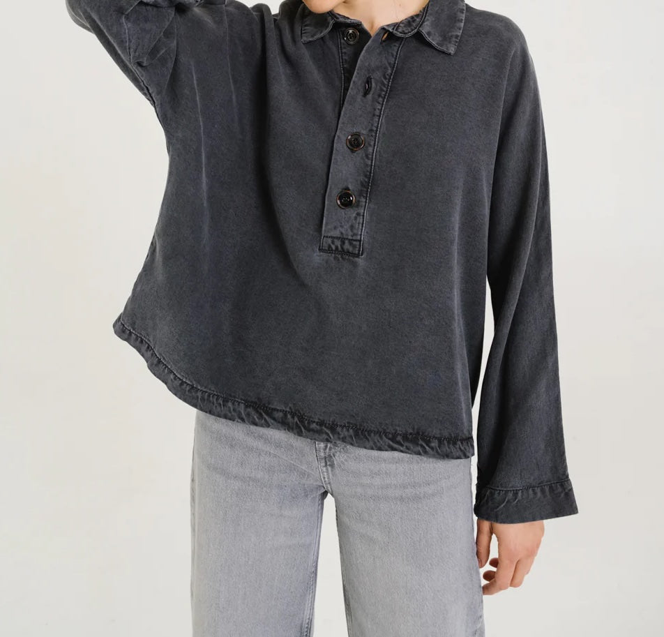 Top uni à manches longues, confectionné en Tencel gris foncé esprit denim. Inspiré de la vareuse, il se distingue par son col chemise, sa patte polo large et ses boutons apparents. Ses manches kimono et son ourlet large aux bas de manches lui confèrent une allure à la fois confortable et décontractée, tout en conservant une touche d’élégance.