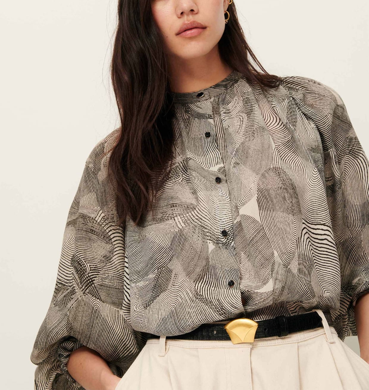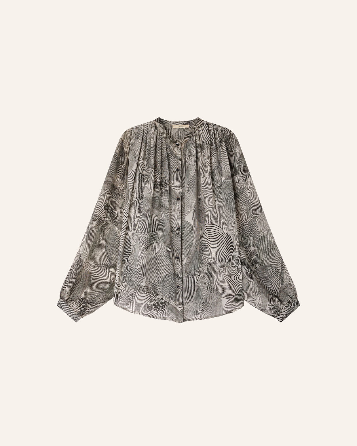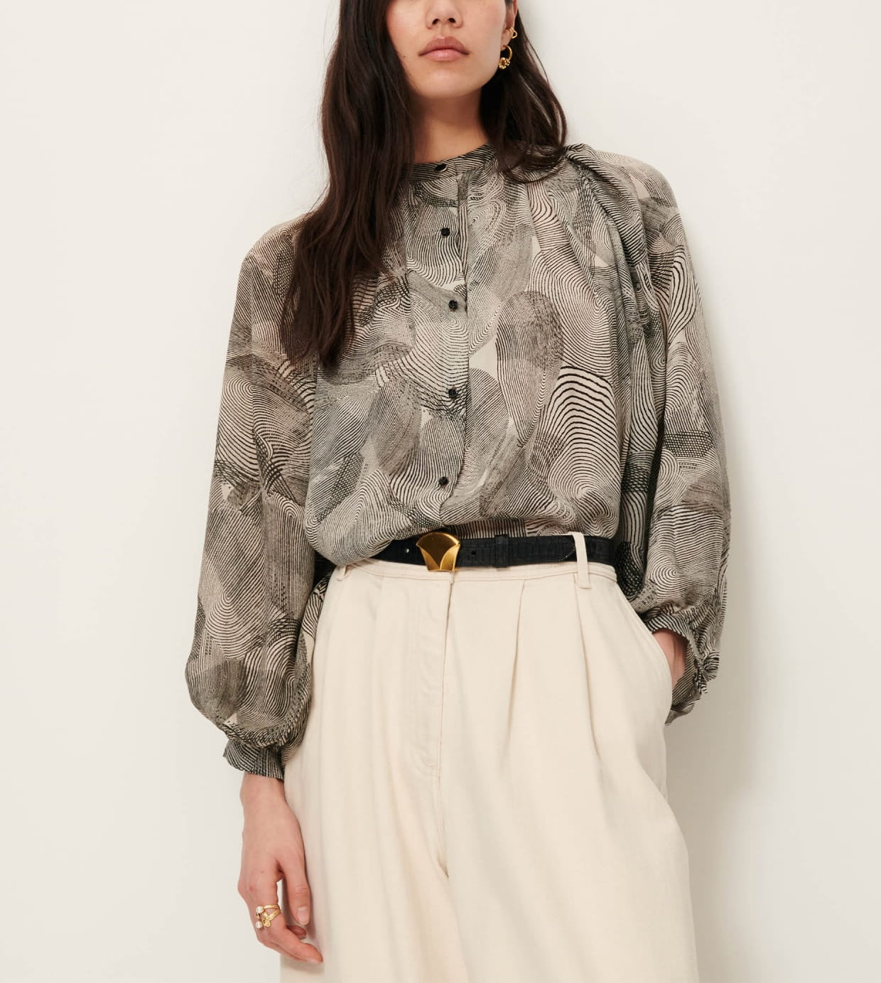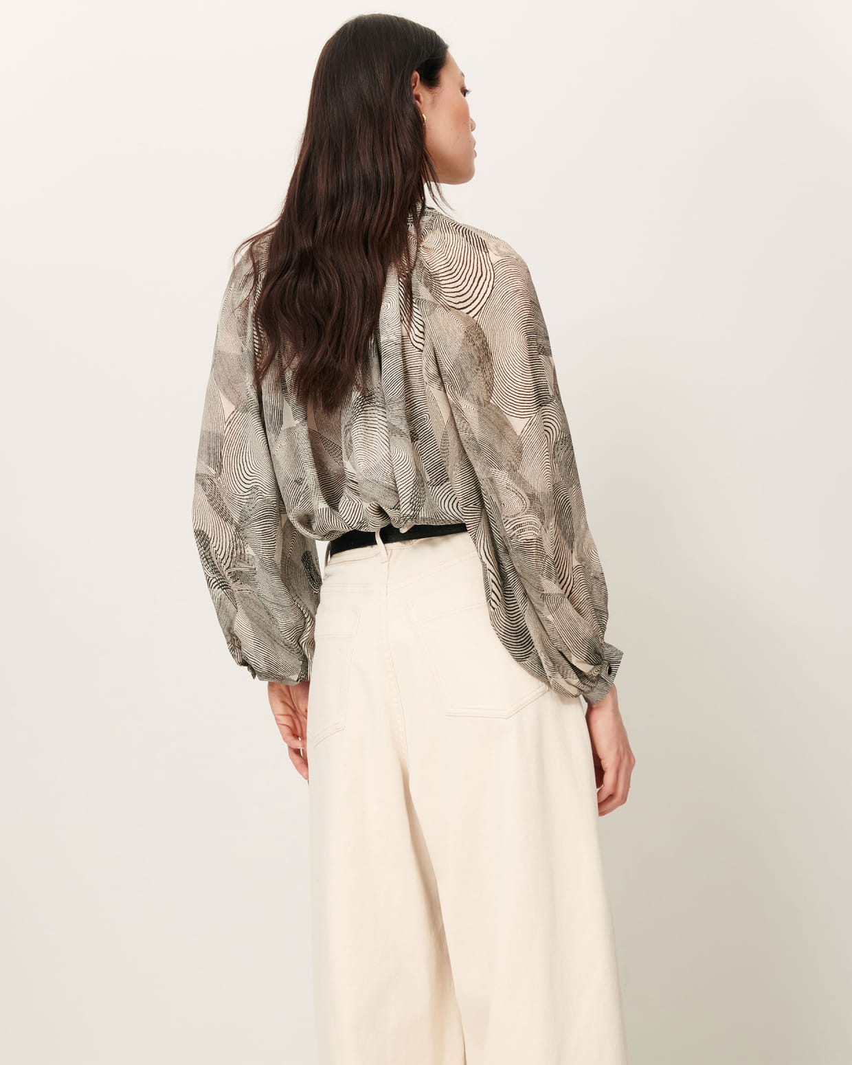 Blouse froncée à manches longues en mousseline de soie, imprimée en Italie, motif exclusif Sessùn.