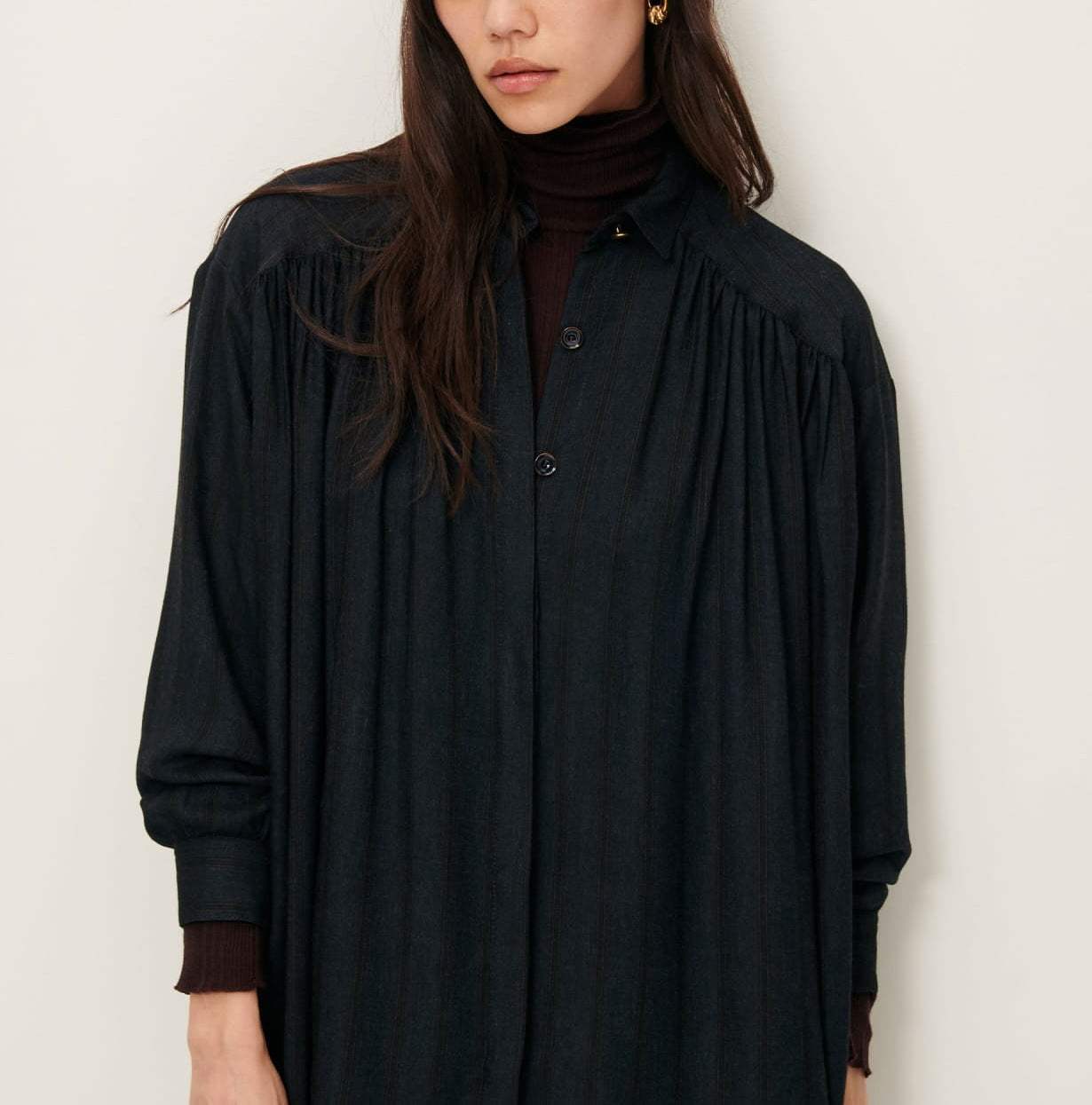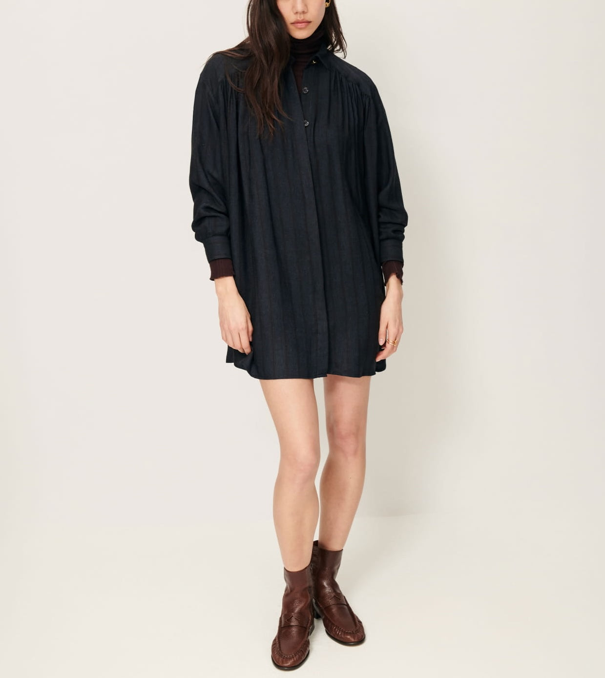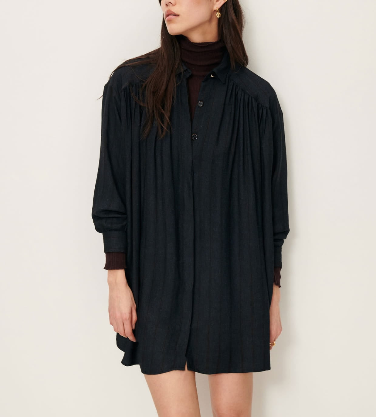 Robe chemisier froncée courte en sergé de Viscose fluide à rayures trames armurées fantaisie, tissé en Italie.