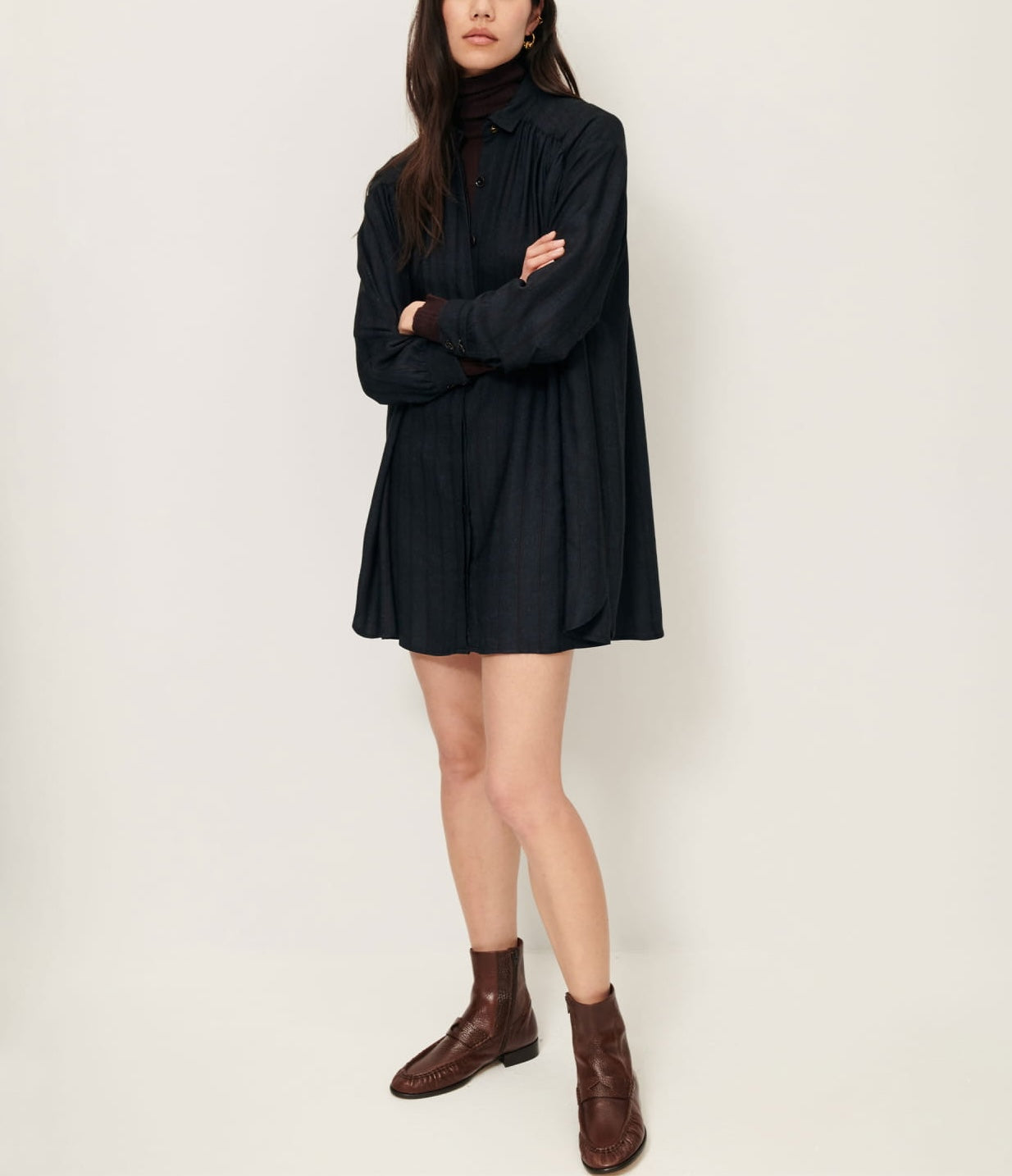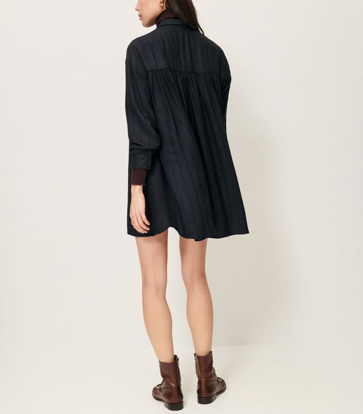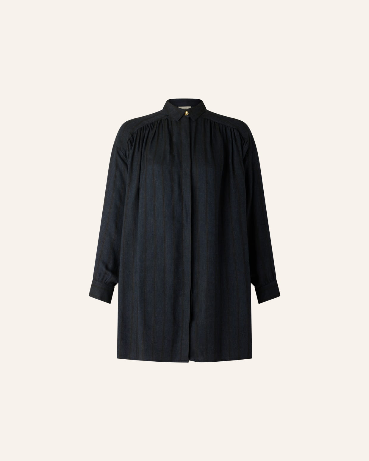 Robe chemisier froncée courte en sergé de Viscose fluide à rayures trames armurées fantaisie, tissé en Italie.