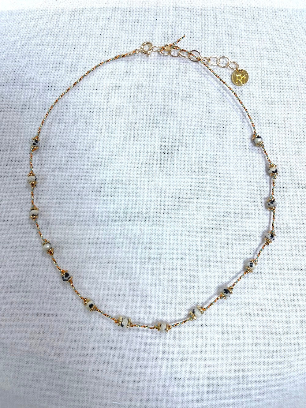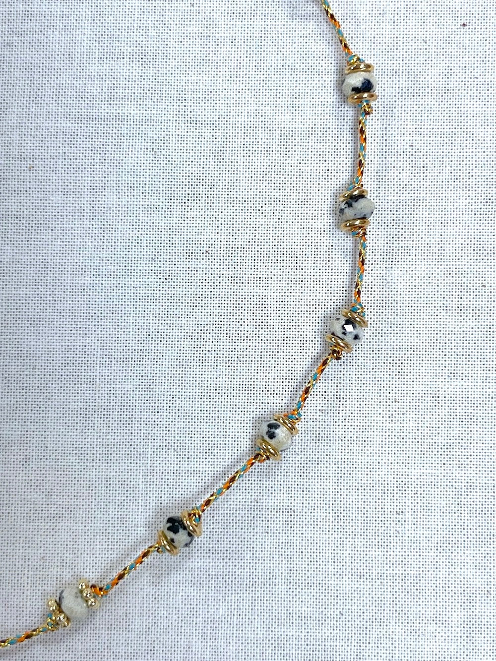 Collier composé d'un fils lurex dans les tons de orange et turquoise et de jaspe dalmatien