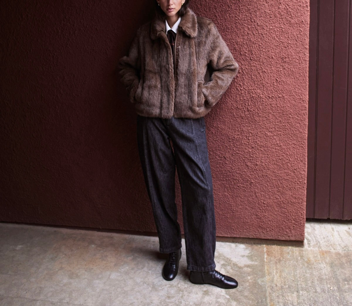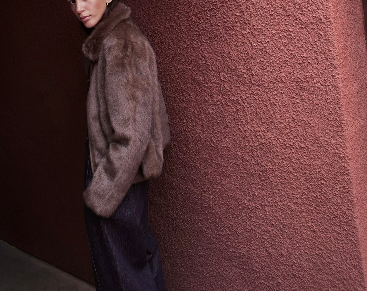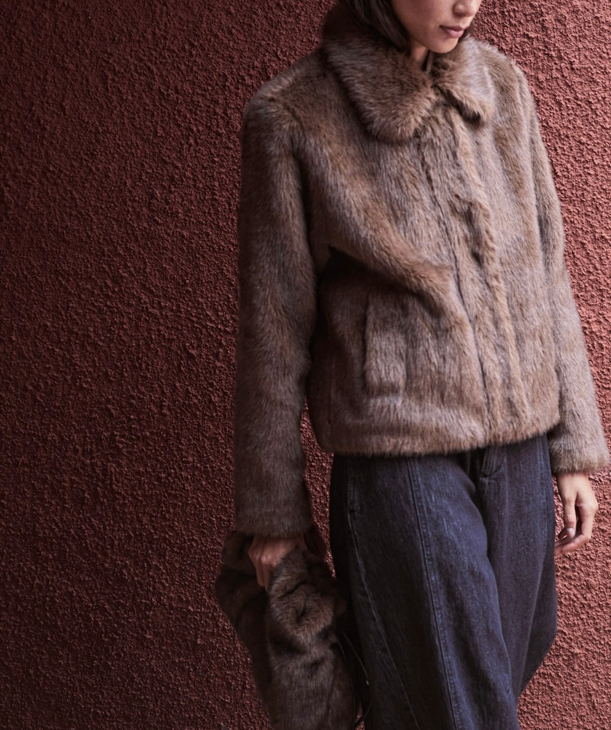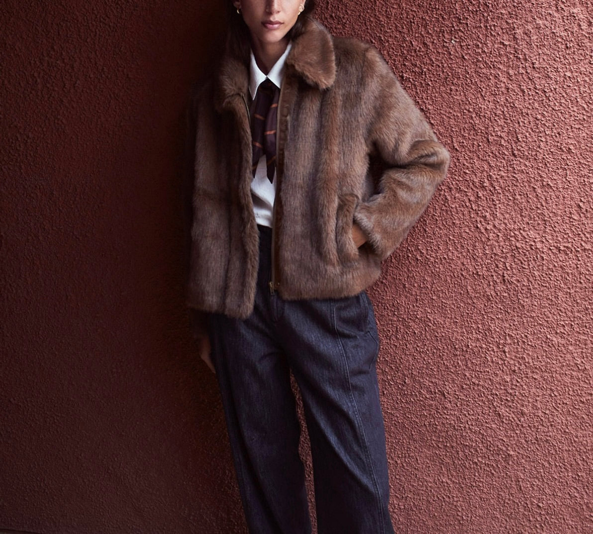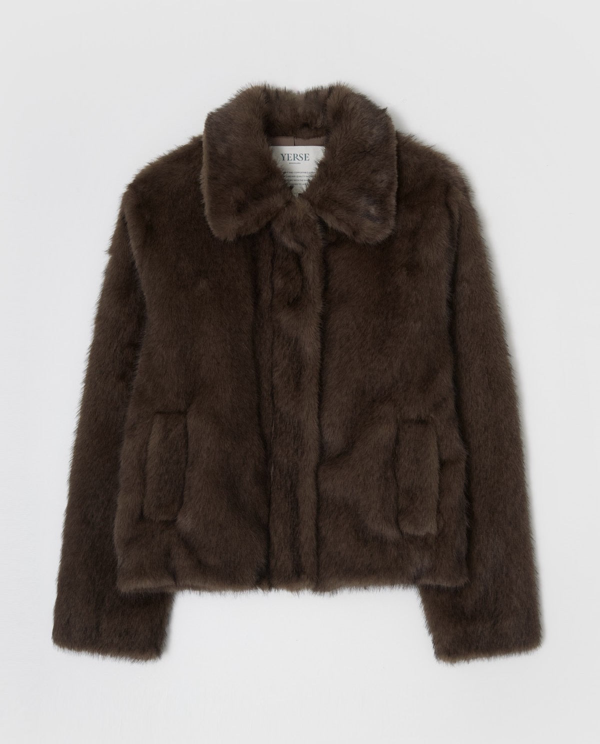 Manteau court coupe droite. Effet poil. Doublure intérieure. Col chemise. Manches longues. Fermeture zippée et 2 boutons-pression. Deux poches latérales