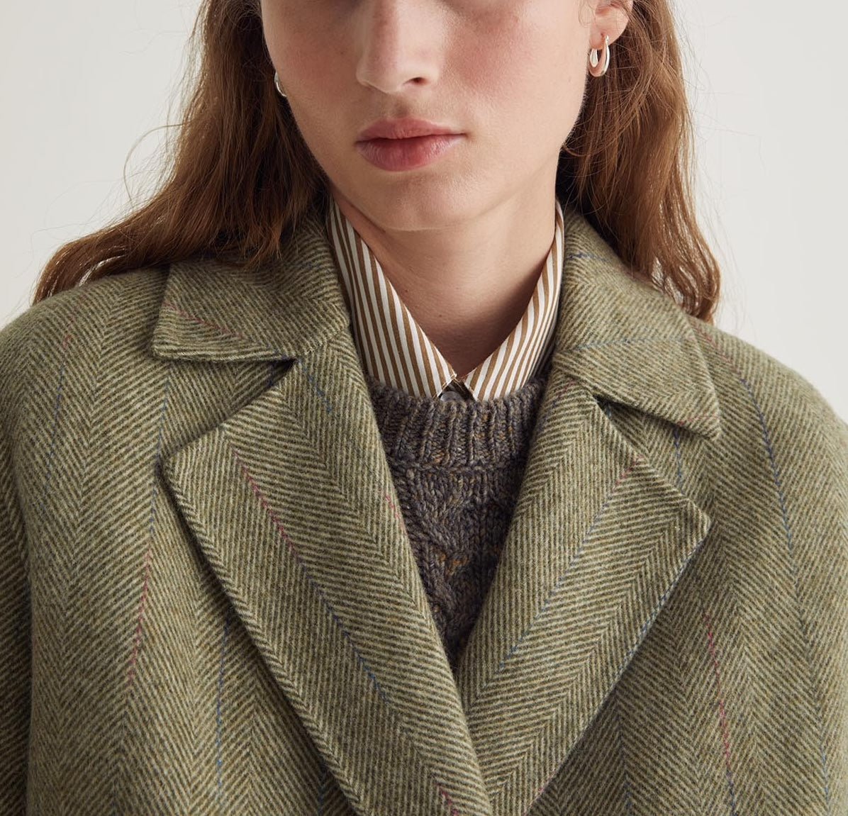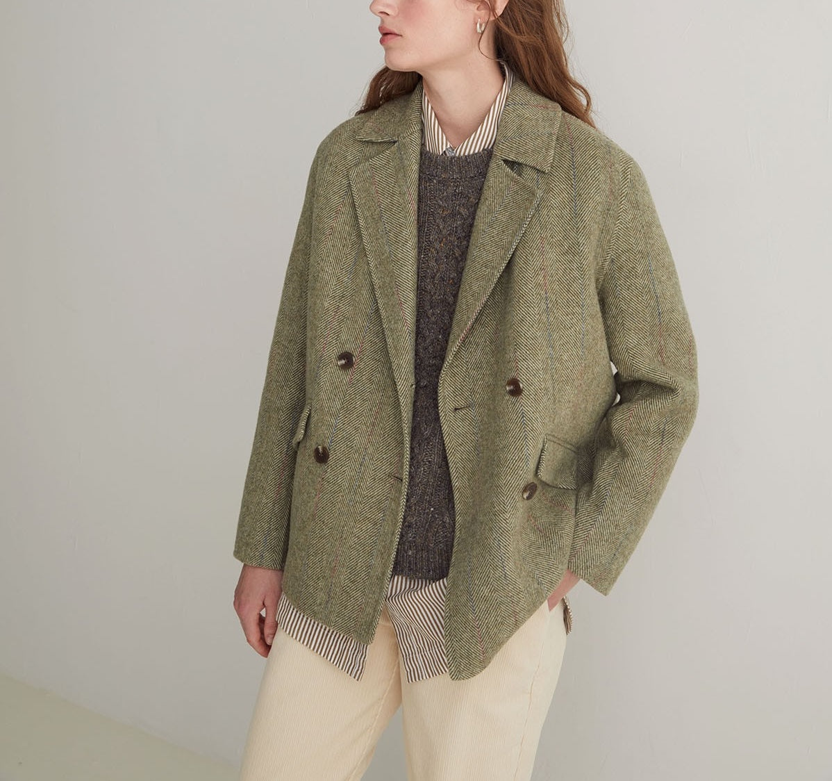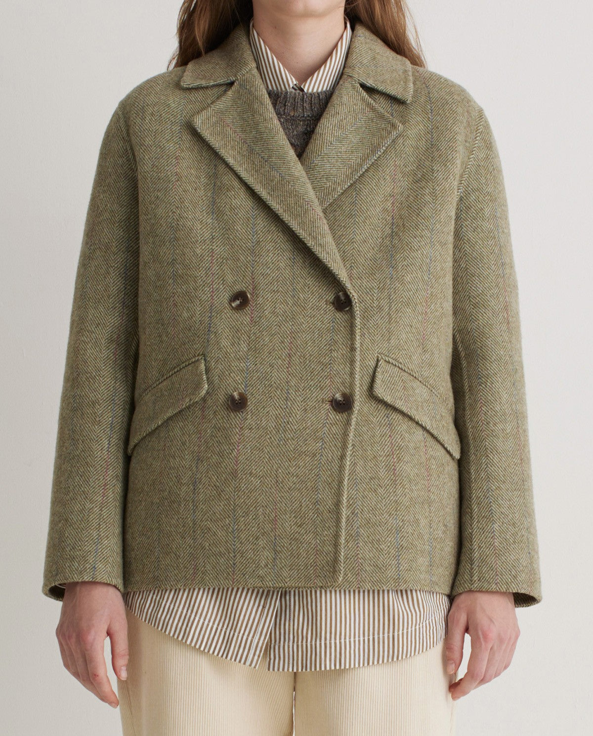Coupe droite. Col à revers. Manches longues. Fermeture à double boutonnage.