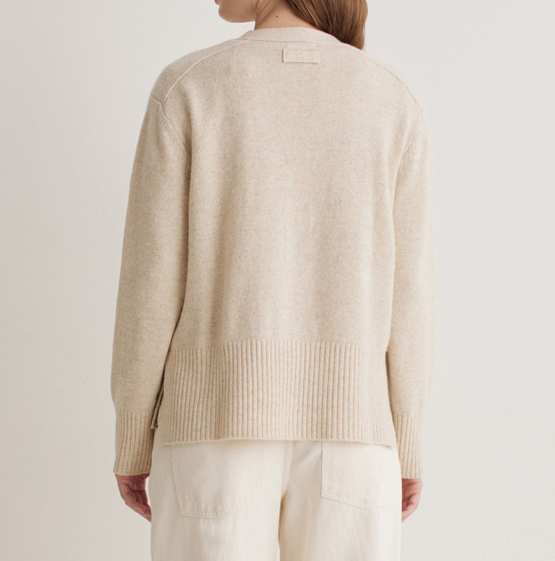 Cardigan en mélange de laine RWS et fibres recyclées. Coupe droite. Décolleté en V. Manches longues. Fermeture frontale avec boutons nacrés. Fentes latérales au niveau de l’ourlet. Finition côtelée