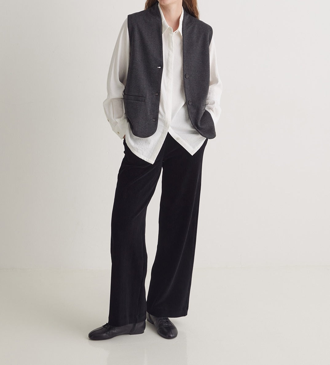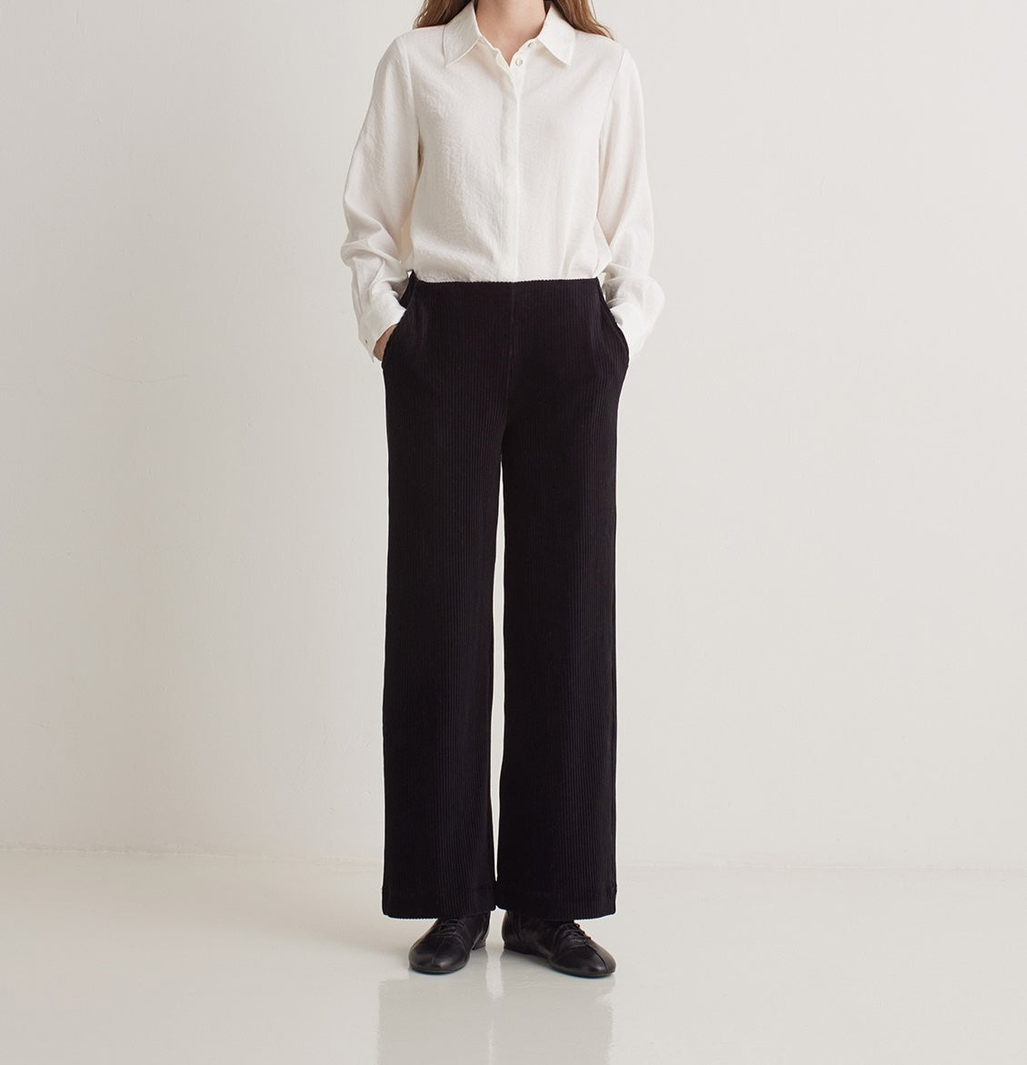 Pantalon en maille effet velours côtelé. Tissu en coton mélangé. Coupe large. Sans fermeture. Ceinture élastique. Deux poches latérales