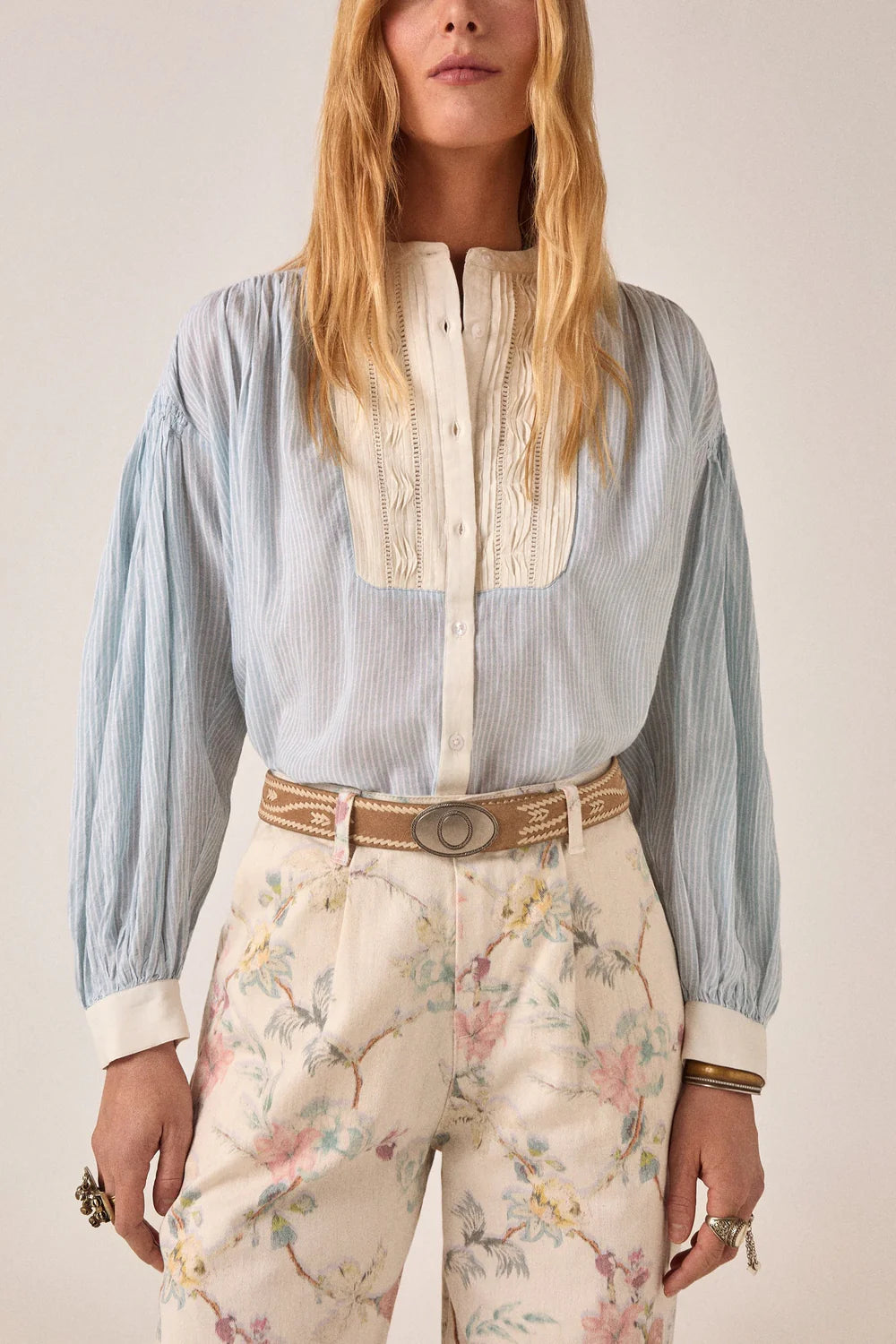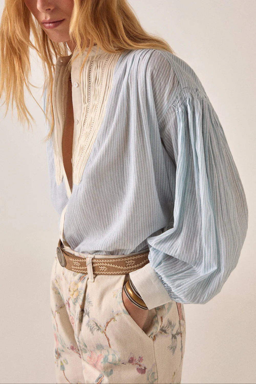 Le corps est d'un bleu clair doux à fines rayures blanches, un motif classique de chemise. L'empiècement poitrine et les poignets sont crème, ornés de broderies verticales, à la manière d'une chemise habillée masculine traditionnelle revisitée. Le mélange de rayures en coton et de broderie coton-viscose lui confère une texture subtile