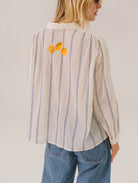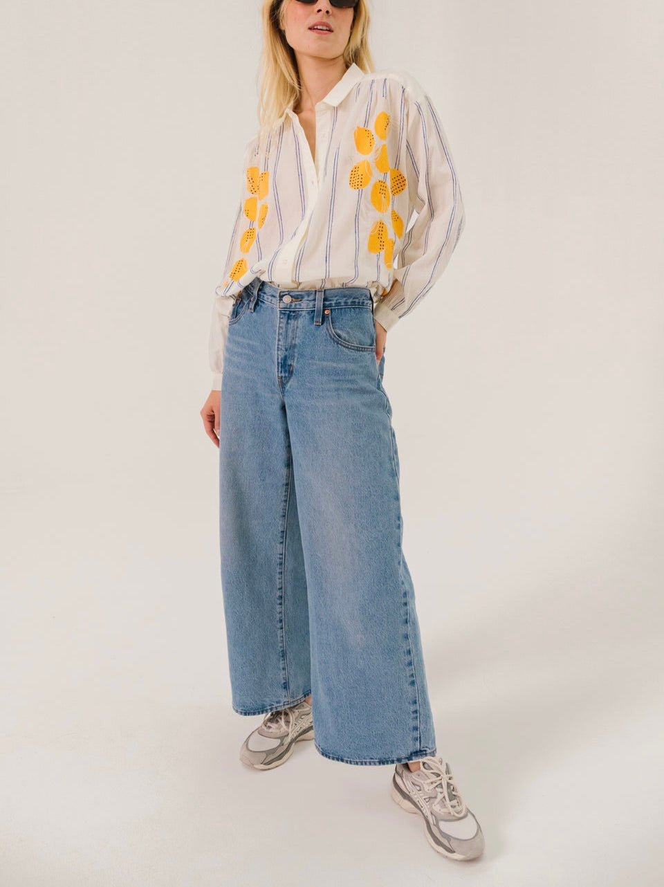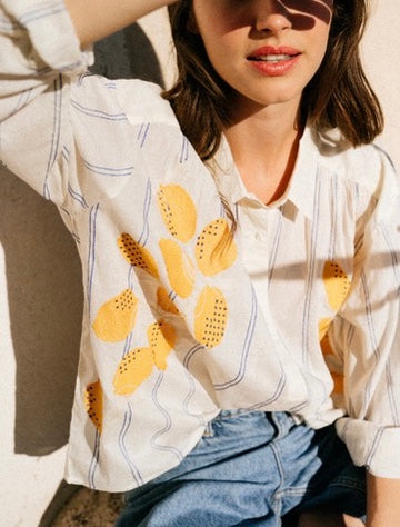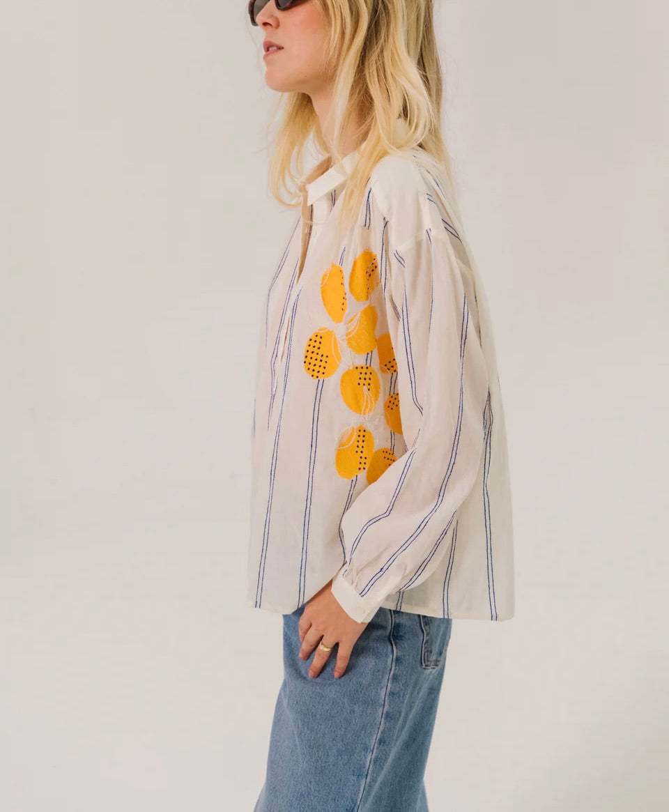 Blouse à manches longues brodée, confectionnée dans un voile de coton léger. Coupe ample et aérienne, col chemise classique. Des fronces délicates aux épaules et aux poignets apportent une touche de féminité.