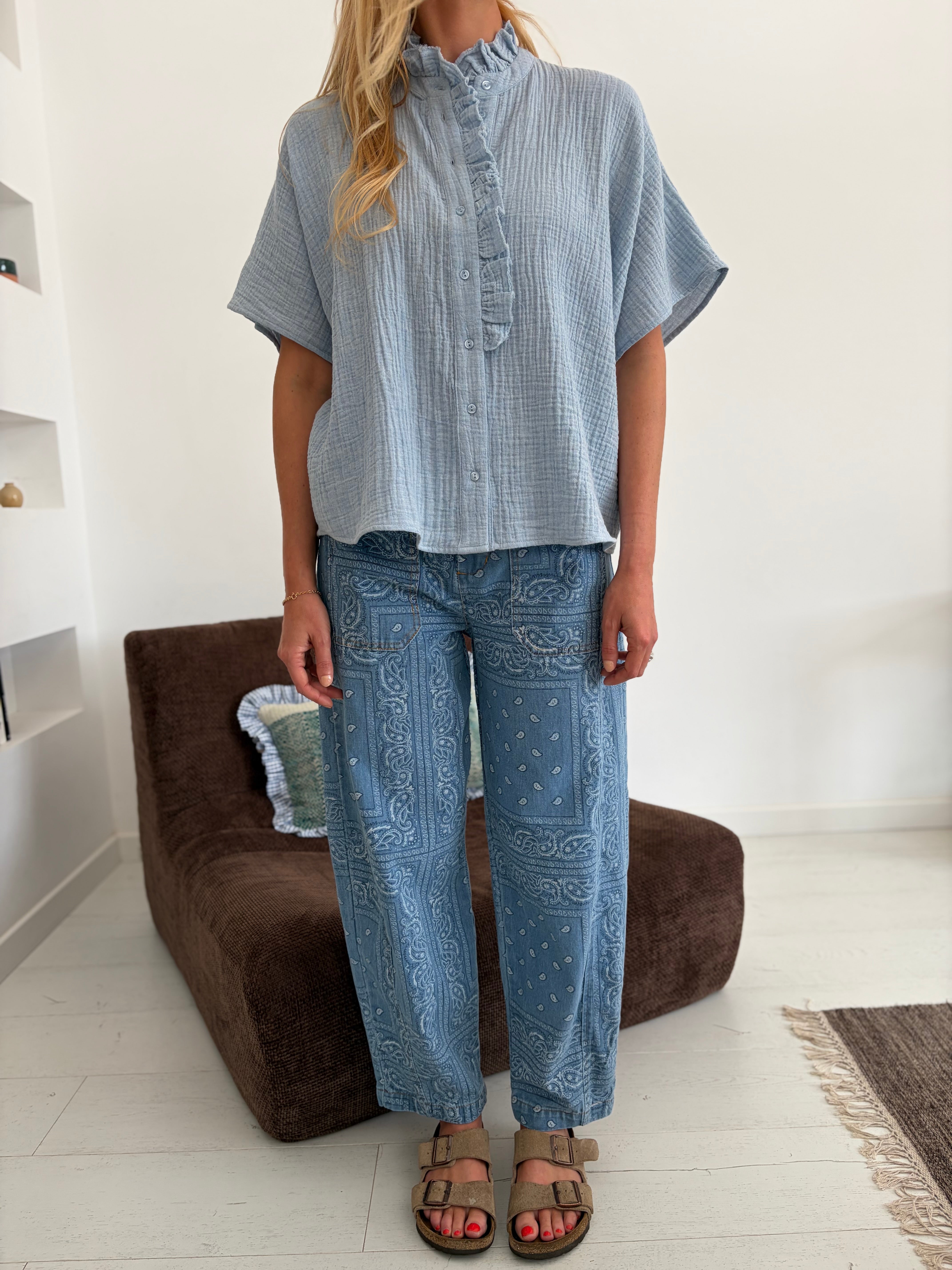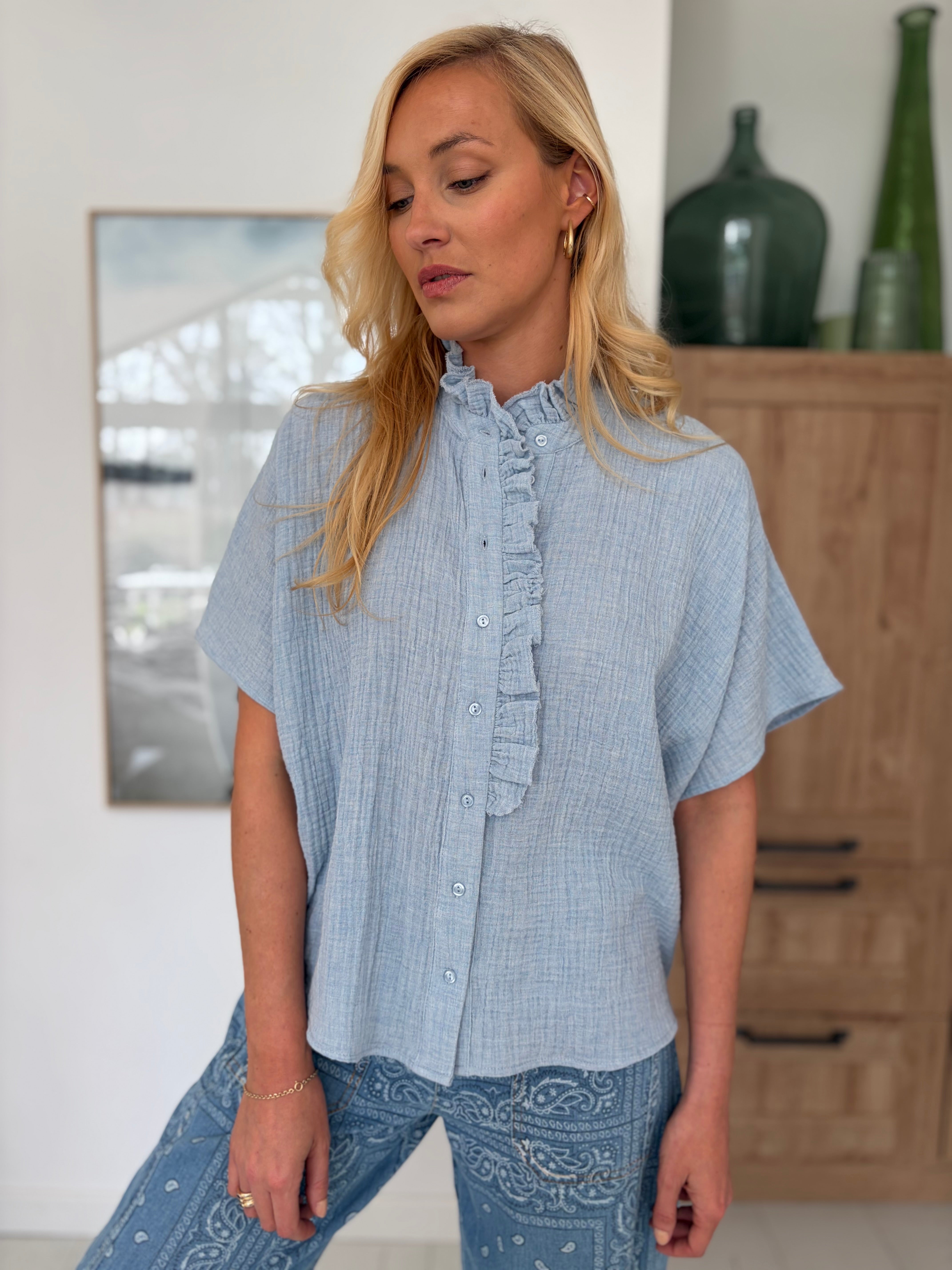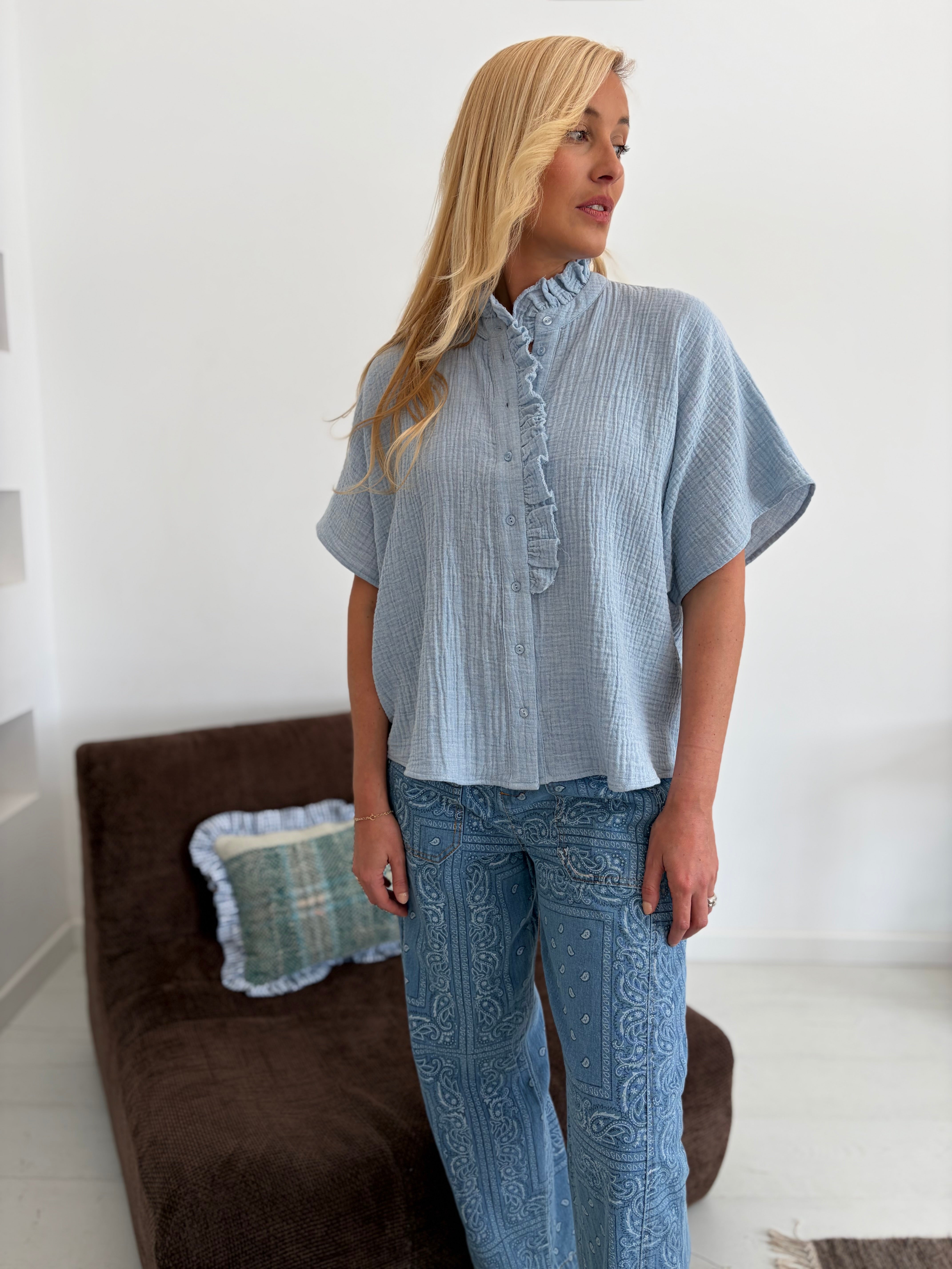 Natasha est une chemisette aux manches courtes possédant un joli détail "froufrou" à la boutonnière et au col. Sa coupe est oversize.