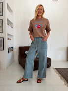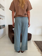 BABAKAR est un pantalon taille haute avec un élastique à la taille. Deux liens permettent de le maintenir à la hauteur souhaitée. Sa coupe est large et sa jambe est droite. Il possède deux poches plaquées sur le devant.