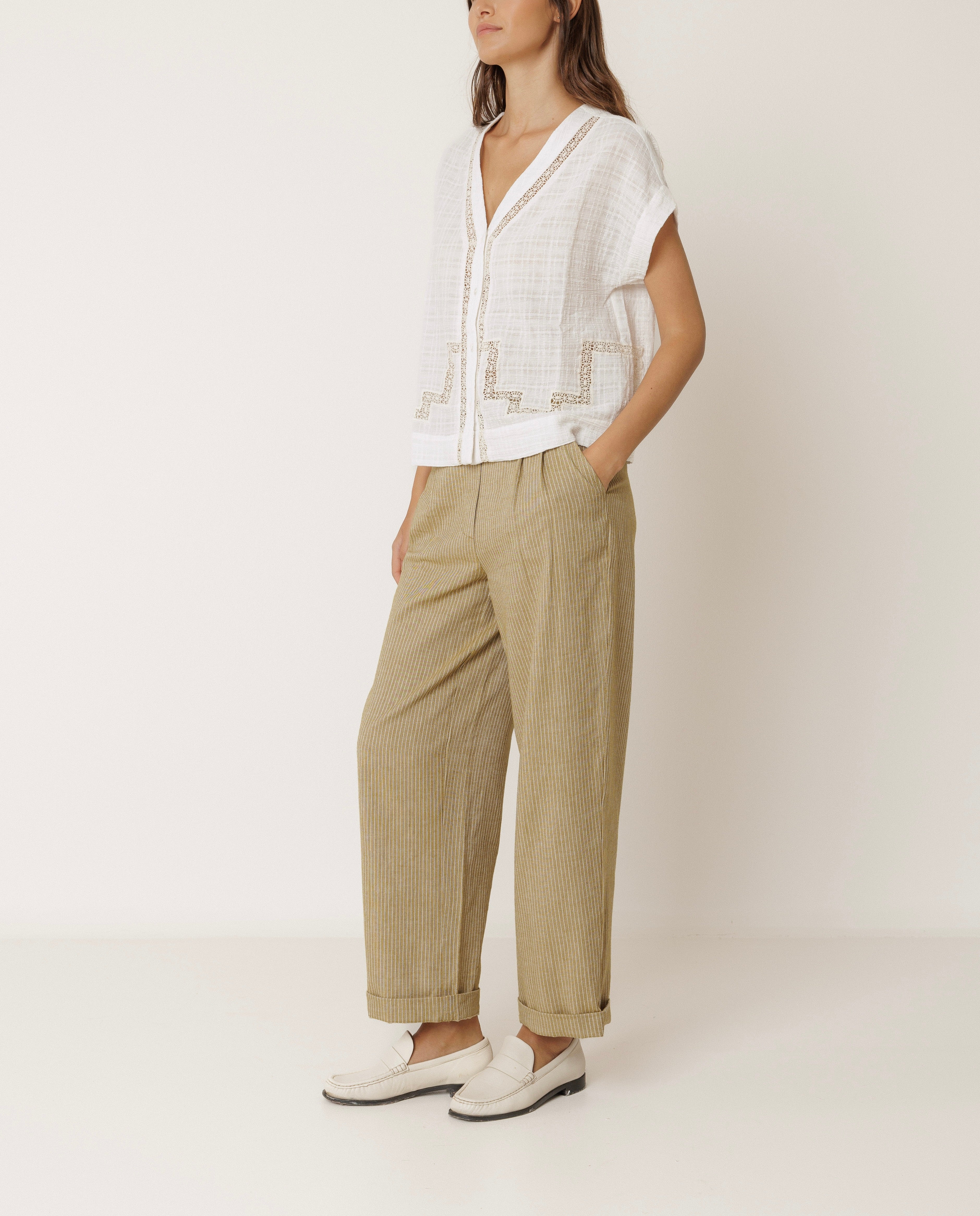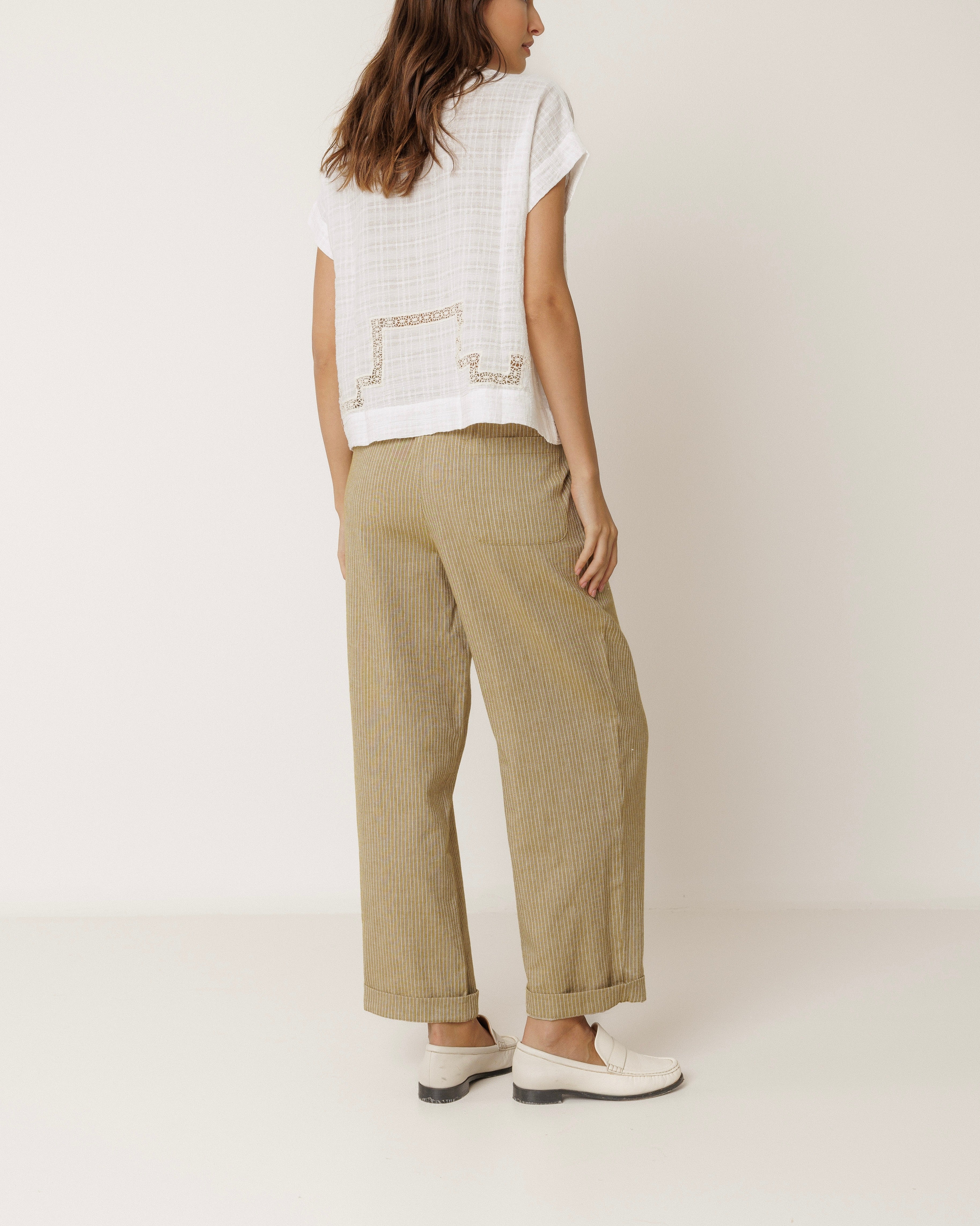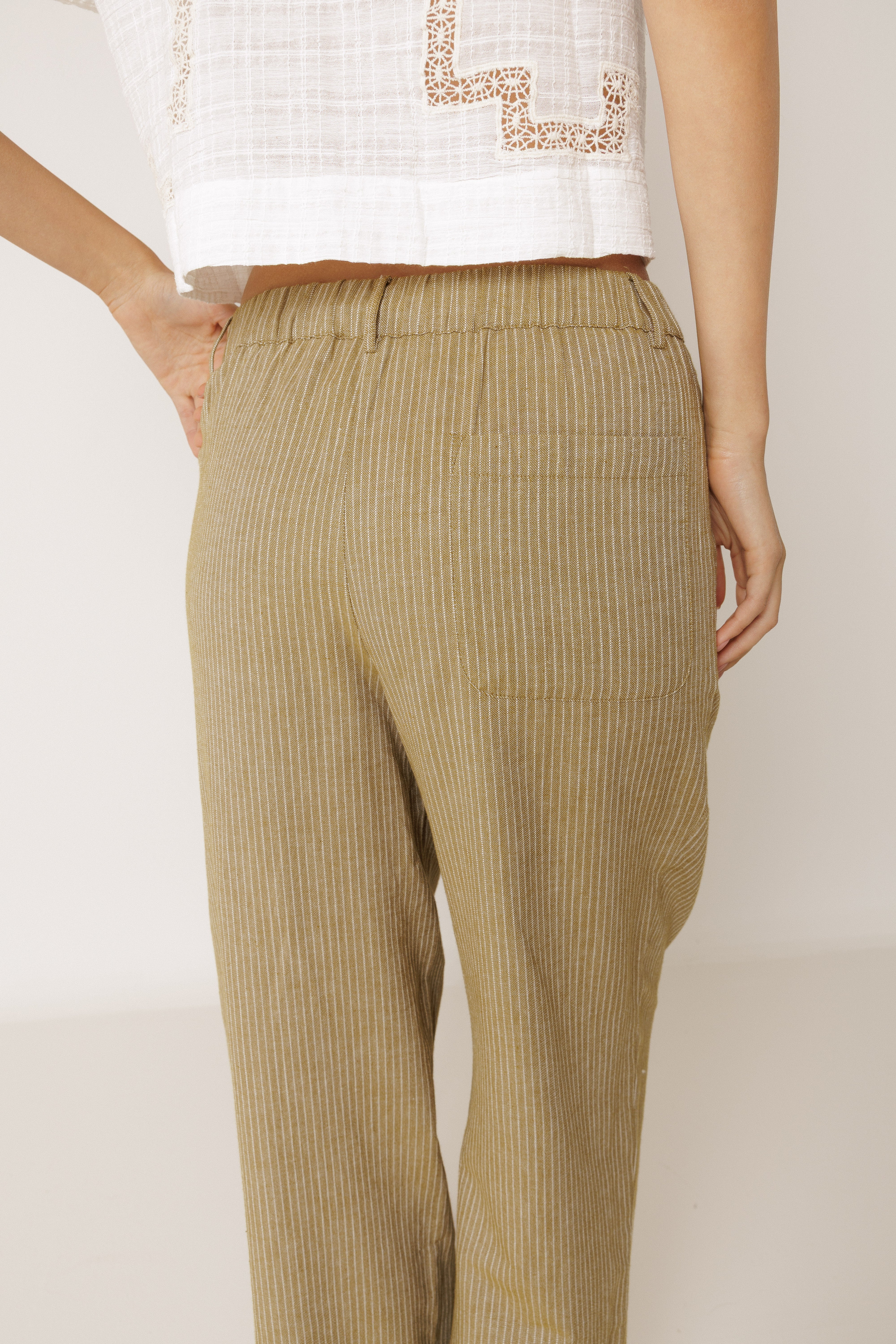 Taille haute avec élastique au dos et poche à la française. • Pinces à l’avant. • Poche plaquée au dos. • Tissu rayé en coton biologique. • Coupe décontractée : conçue pour un porté légèrement ample. • Taille: S. Taille de la ceinture: 34cm. Longueur de l'ébauche: 30,5cm. Longueur de l'entrejambe: 75cm