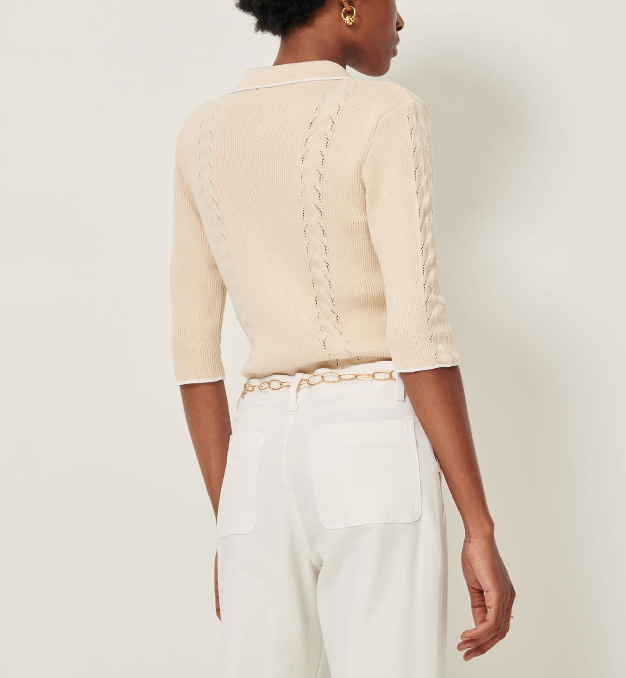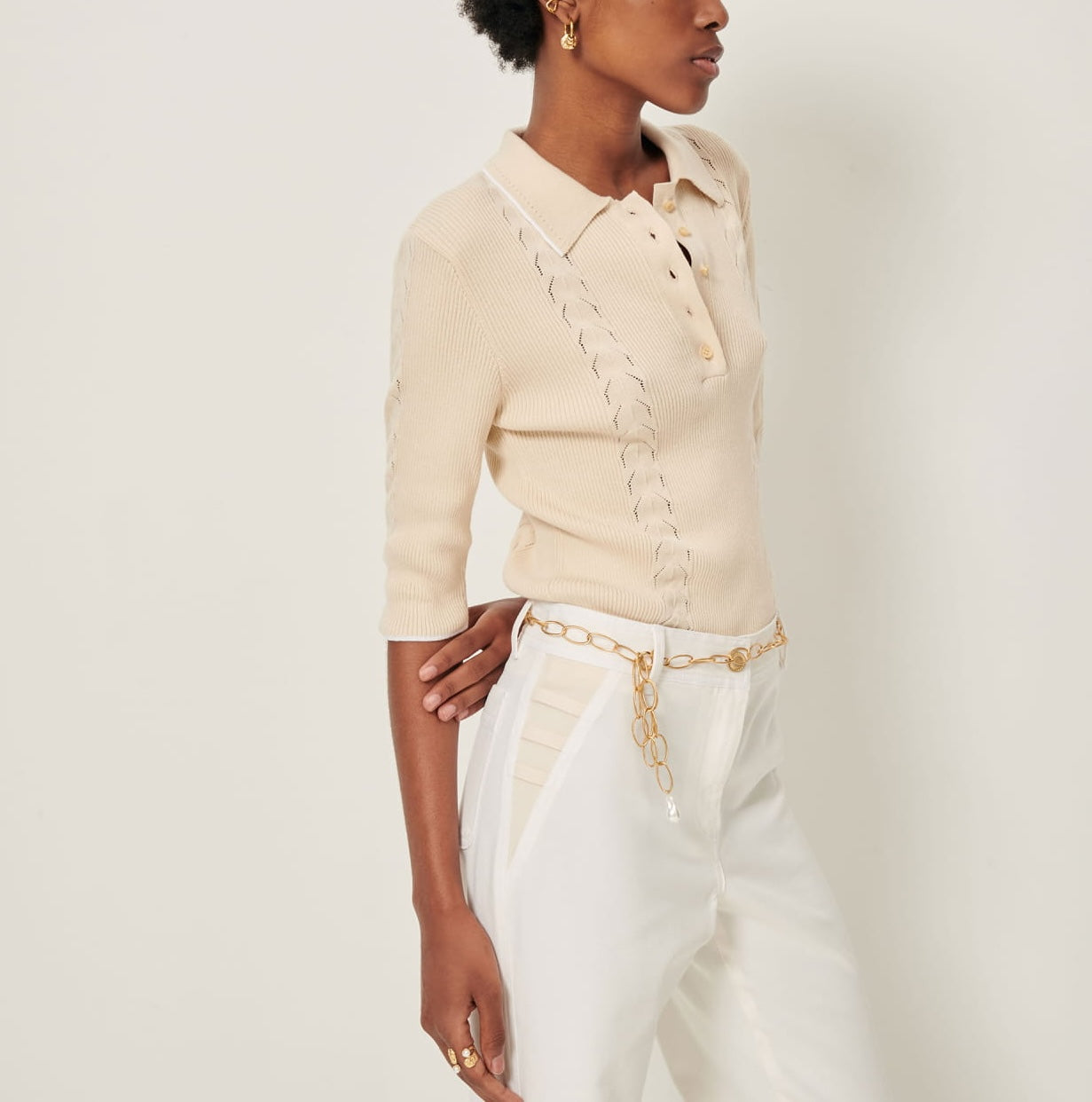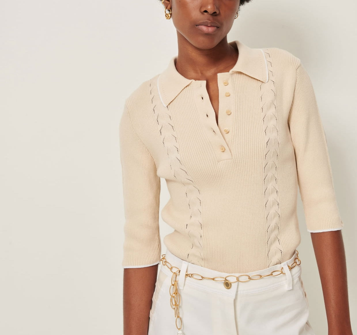 Polo à manches 3/4 en maille côtelée et ajourée. Details de finitions contrastées.