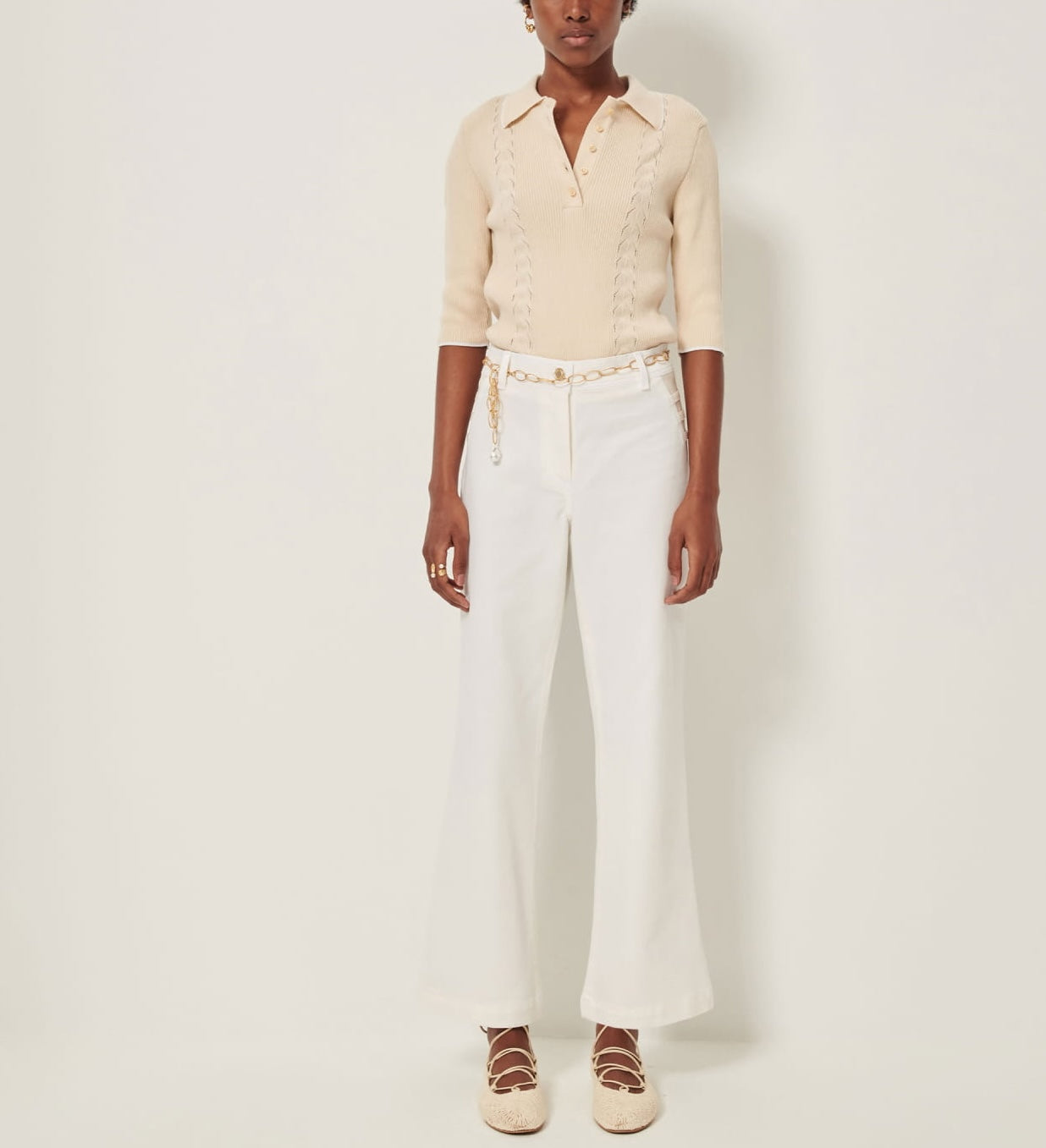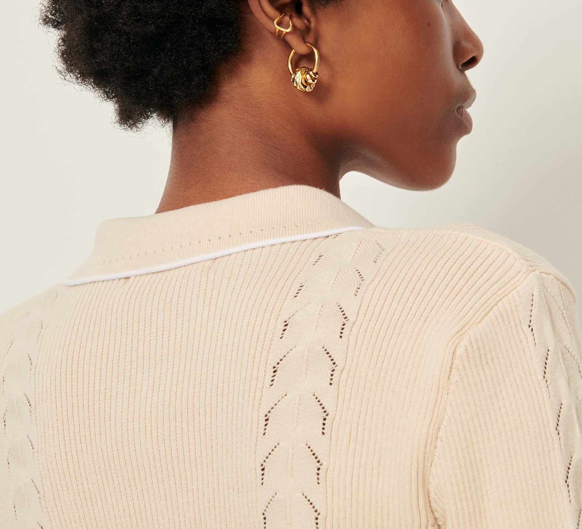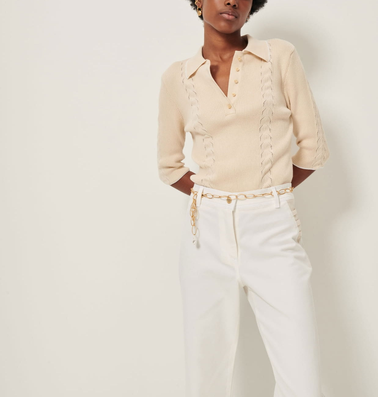 Polo à manches 3/4 en maille côtelée et ajourée. Details de finitions contrastées.